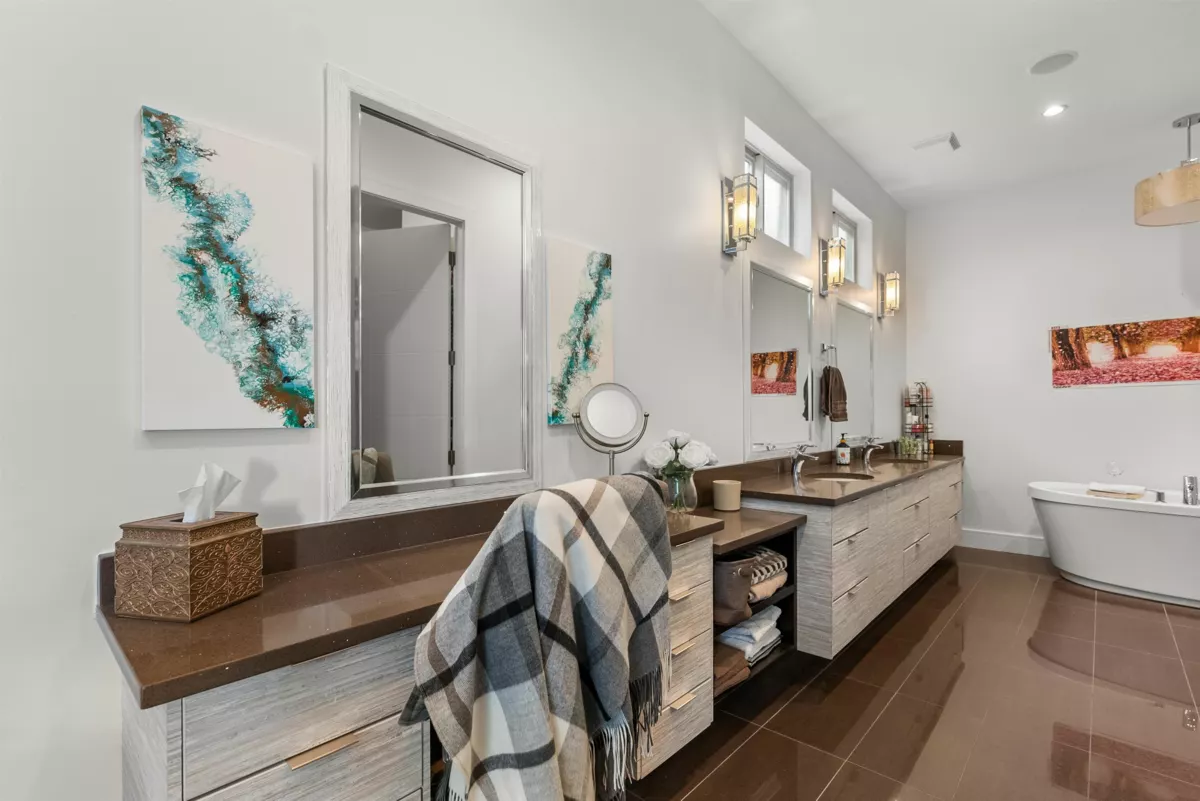 Quality & craftsmanship define this spectacular Eagle Mountain home! Set on ¼ acre greenbelt lot with stunning views and exceptional privacy, this 6,600sqft home features 5–6 bedrooms, 5 baths, and 2 offices across three luxurious levels. The open-concept gourmet kitchen is a chef’s dream, while the great room has 20-ft ceilings and floor to ceiling windows to capture the spectacular views. Primary suite on main and a second primary upstairs, both with a spa-like ensuites. The lower level offers a games room with wet bar, gym, rec room, and theatre wired for 7-zone sound. Outdoor living at its best with multiple patios, rooftop deck, and parking for 8 cars & RV/boat. A triple garage and roughed-in elevator complete this masterpiece! Within a short wall to Irene Kelleher school and park.