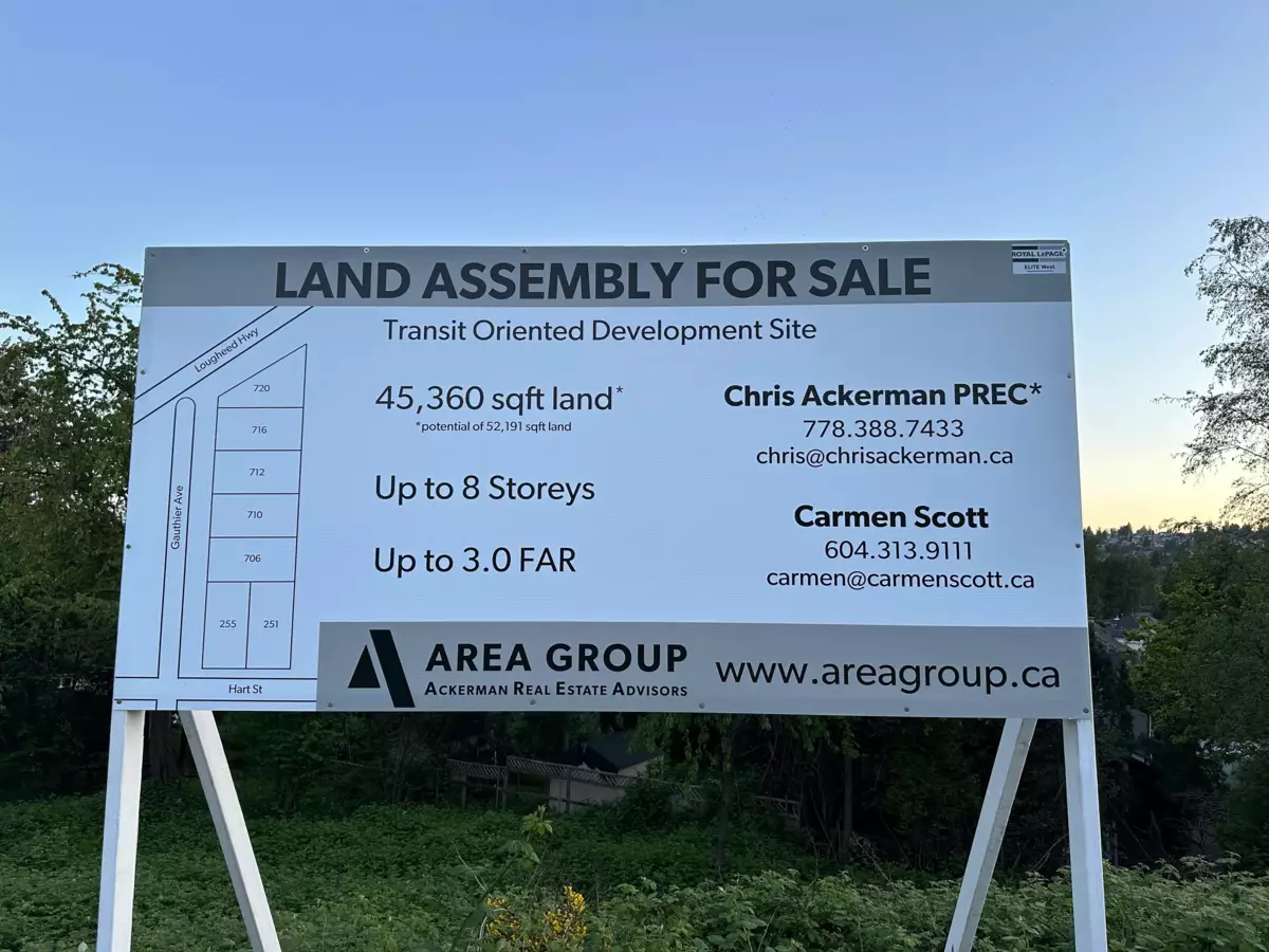 Calling all Builders, Developers and Investors! Prime Location Land Assembly. Over an Acre in West Coquitlam. Lots totalling 45,360 sqft. up to 52,191 sqft. Total Buildable Floor Space Potential: 136,080 sqft up to 156,573 sqft. 8 Storey Mid Rise Condo building Opportunity. Located within 400-800m of key Transit Oriented Area. Floor Area Ratio (FAR) of up to 3.0. No Restrictions - no easements, right of ways, covenants, streams etc. Situated in a highly desirable area with excellent access to transit and amenities. 251 & 255 Hart St and 706, 710, 712, & 716 Gauthier Ave are all available for sale. For more information and to discuss this exciting development opportunity call today!