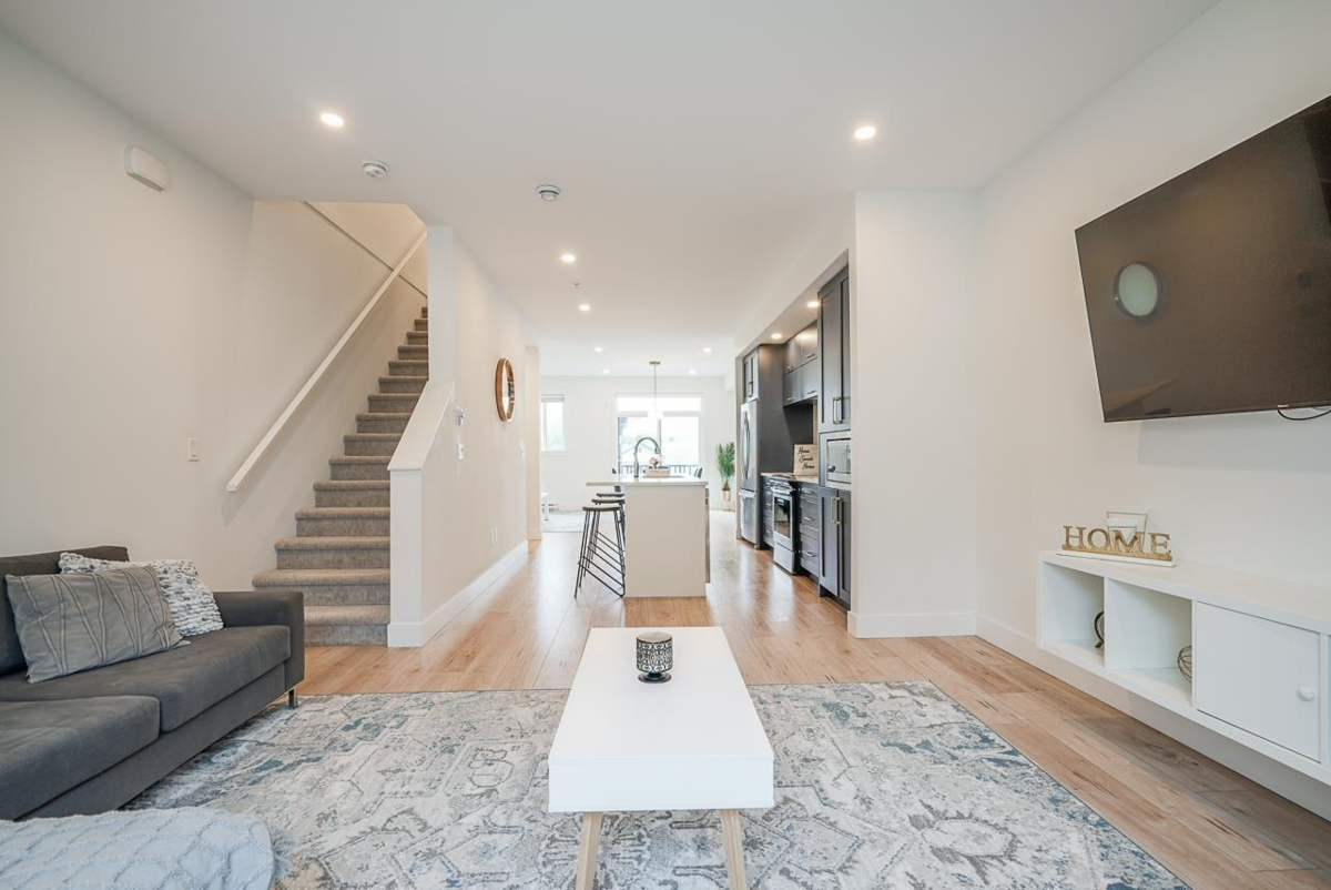 This well-maintained 4-bedroom townhome in the Ascent complex offers over 1,700 sq ft of stylish, functional living space. The entry-level includes a private bedroom with a full bathroom—perfect for guests or a home office. The main floor features two flexible living areas and a modern kitchen with navy cabinets, gold hardware, quartz counters, and a Whirlpool appliance package. Plush carpet and wide plank laminate flooring complete the look. Upstairs are three spacious bedrooms, including a primary suite with his and hers closets. Enjoy greenery views from the back deck, just five minutes from all Willowbrook amenities. MUST SEE!