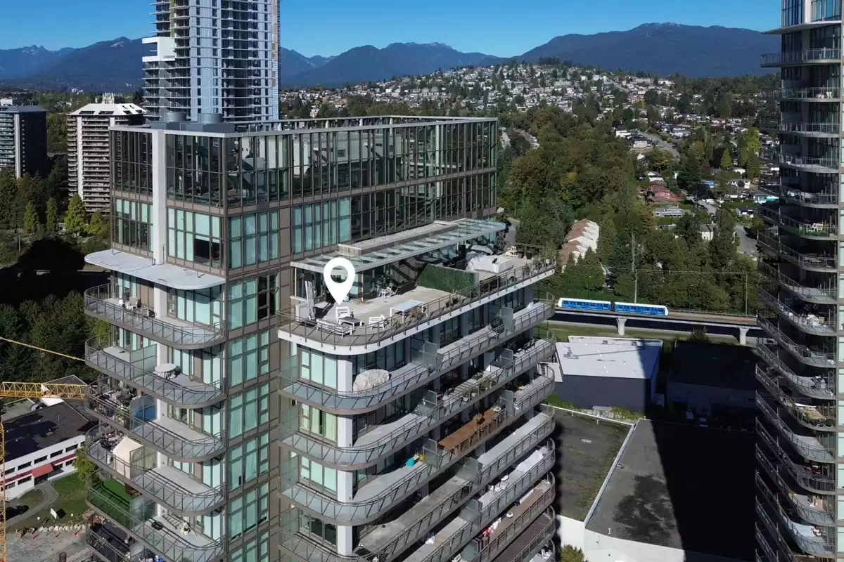 Take in the Burnaby skyline atop Etoile, one of the rare luxury residences at Brentwood. This spacious penthouse features a over 1450 sq.ft. wrap around terrace/balcony, 3 bedrooms + 2.5 bathrooms, open concept kitchen and living room perfect for entertaining. Large floor to ceiling windows and 10 ft ceilings frame the elegant and spacious living space. The kitchen features premium Bosche built in appliances. The washrooms are beautifully tiled and feature wide vanities with double sinks and rainforest showerheads. The bedrooms feature plenty of closet storage and the third bedroom can be used as a den or home office.