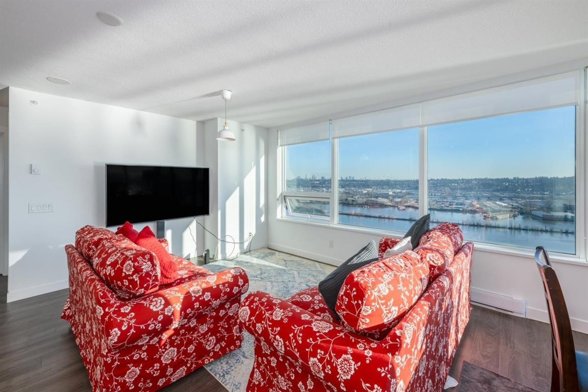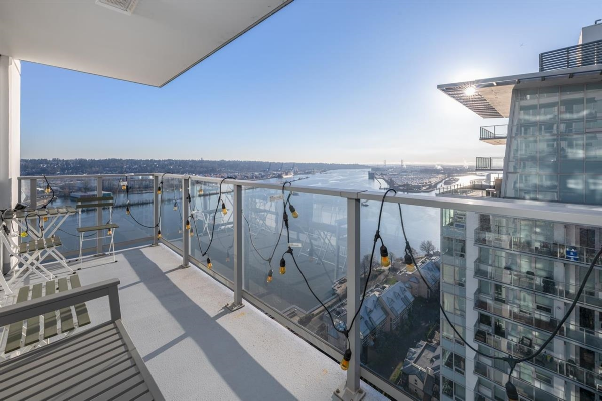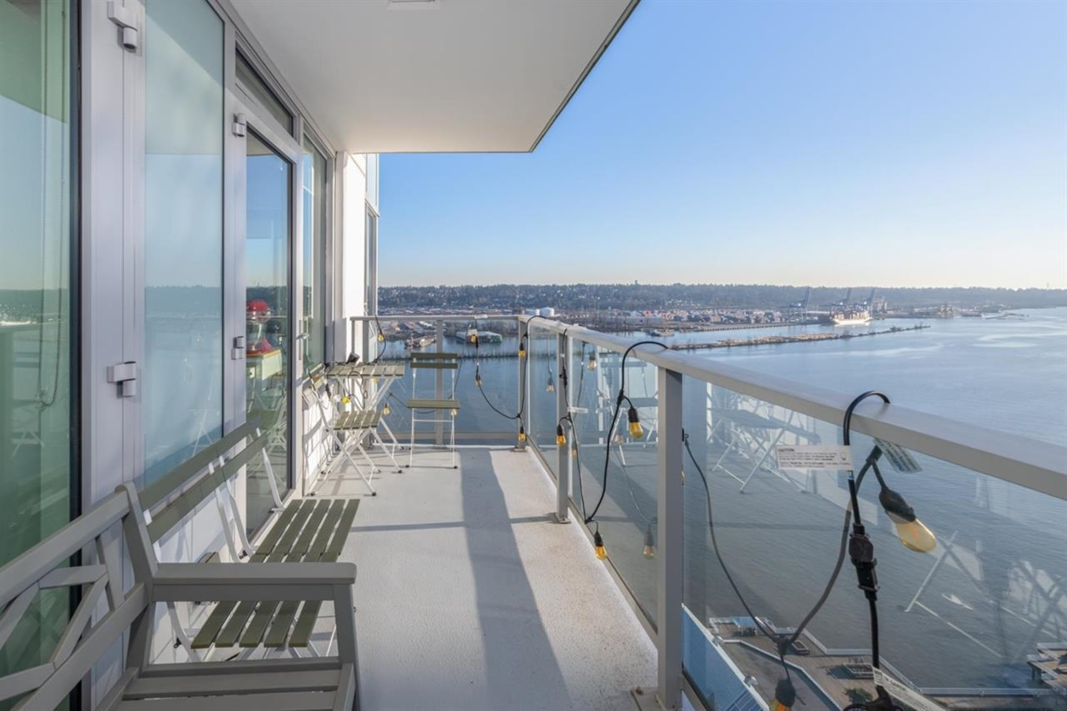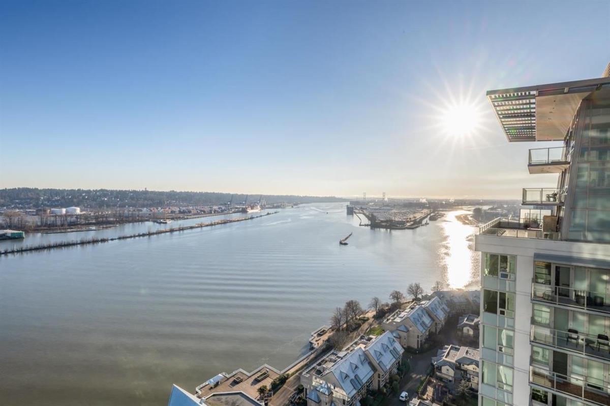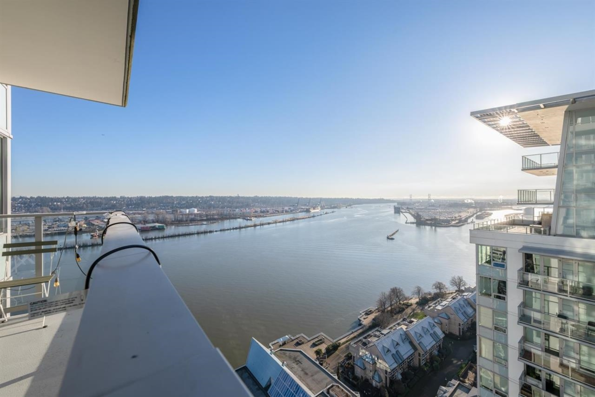 RiverSky by BOSA, with Unobstructed WATERFRONT VIEWS. This premium, high-floor suite, 2 bed & 2 bath SE corner unit with forever water, city, & stunning mountain views! Separated bedrooms for privacy and oversized balcony with access from the living room & the primary bedroom! Steps to Skytrain station, and River Market, restaurants & shops. Building amenities include concierge, well equipped gym, clubhouse, rooftop garden, temperature controlled room for grocery deliveries, EV charging stations & much more. Still under 2-5-10 Warranty. Don't miss out!