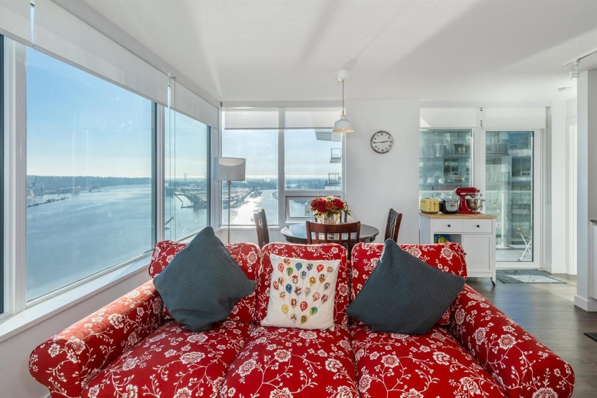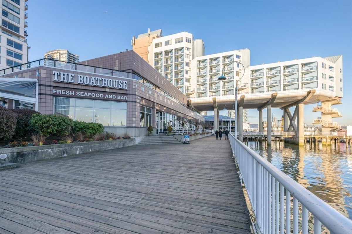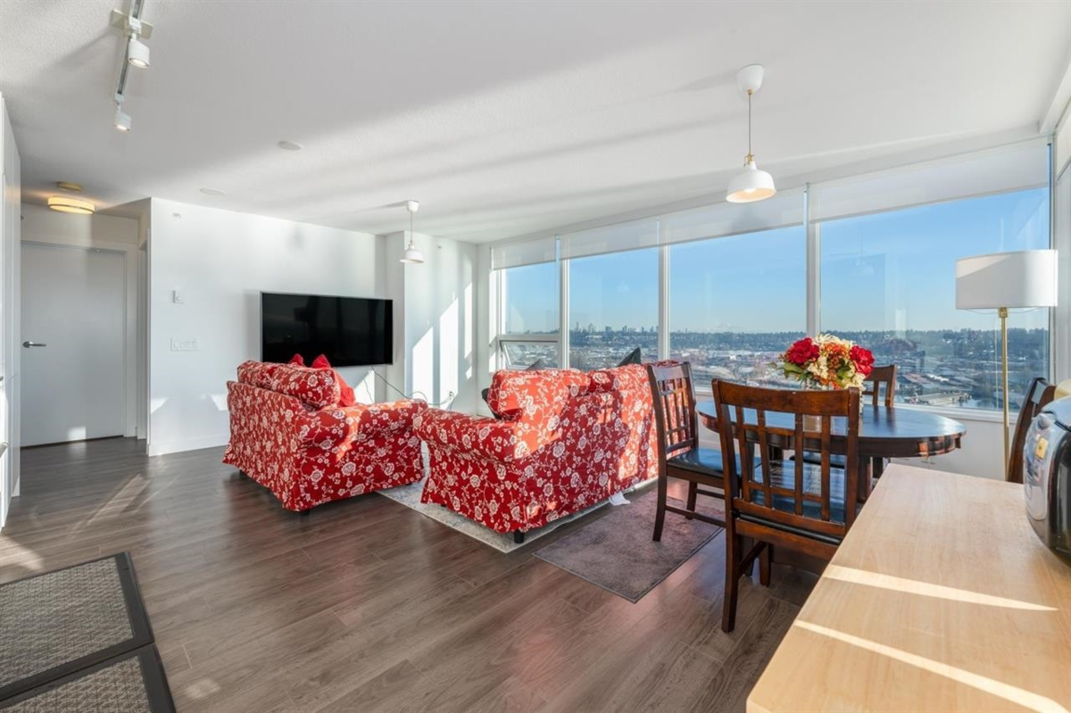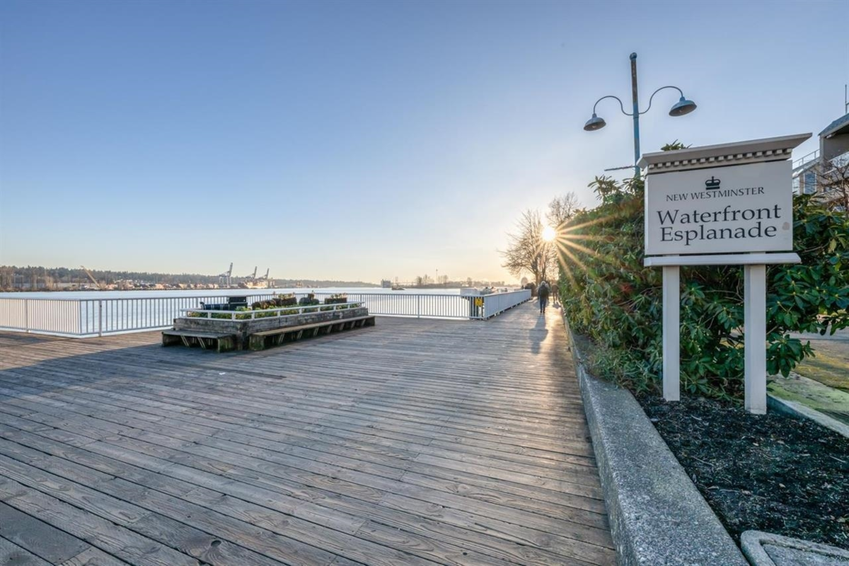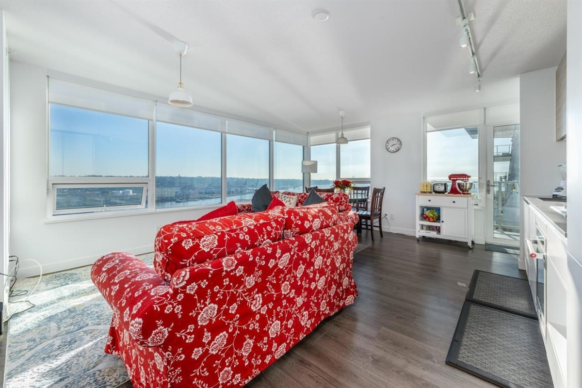 RiverSky by BOSA, with Unobstructed WATERFRONT VIEWS. This premium, high-floor suite, 2 bed & 2 bath SE corner unit with forever water, city, & stunning mountain views! Separated bedrooms for privacy and oversized balcony with access from the living room & the primary bedroom! Steps to Skytrain station, and River Market, restaurants & shops. Building amenities include concierge, well equipped gym, clubhouse, rooftop garden, temperature controlled room for grocery deliveries, EV charging stations & much more. Still under 2-5-10 Warranty. Don't miss out!