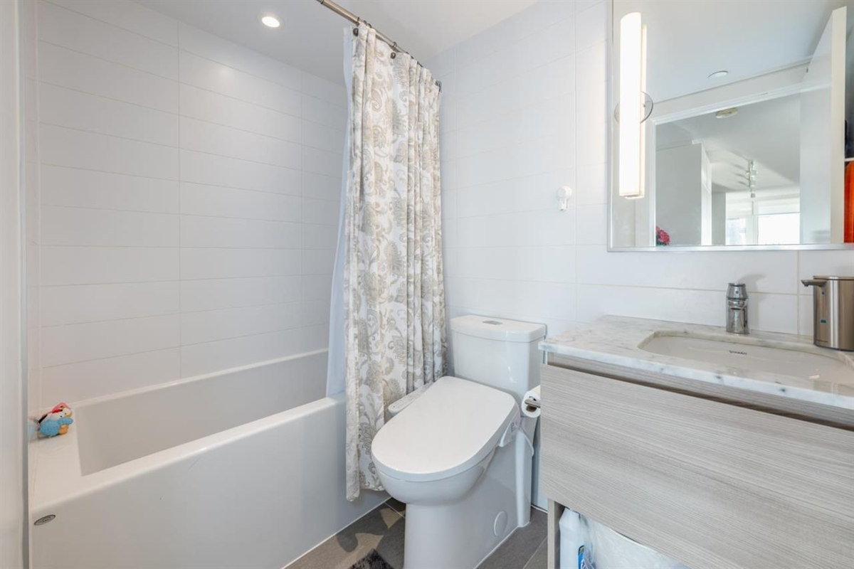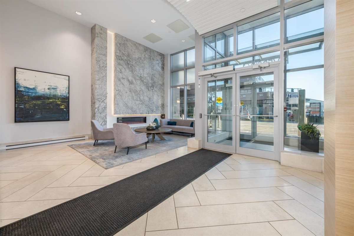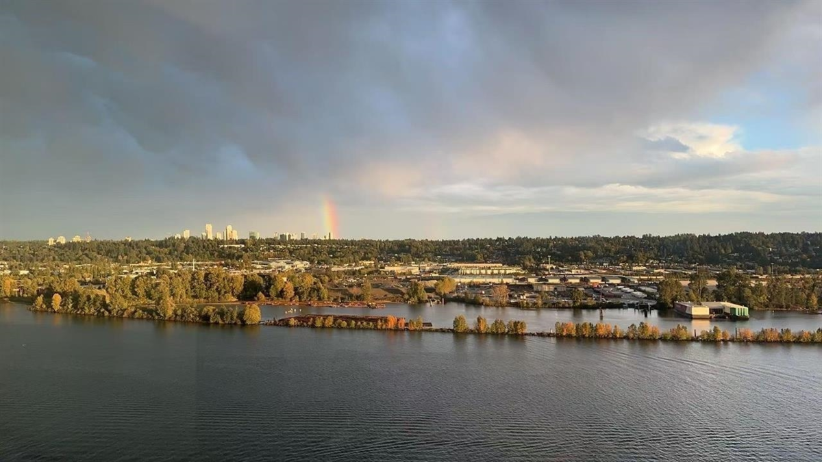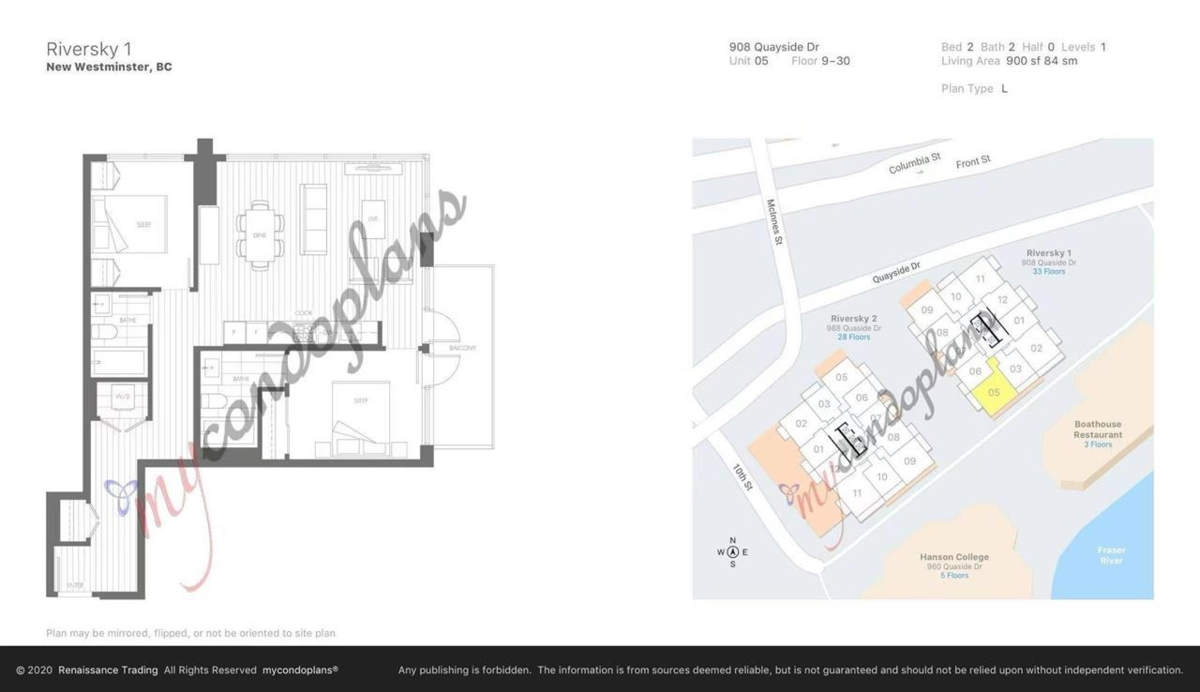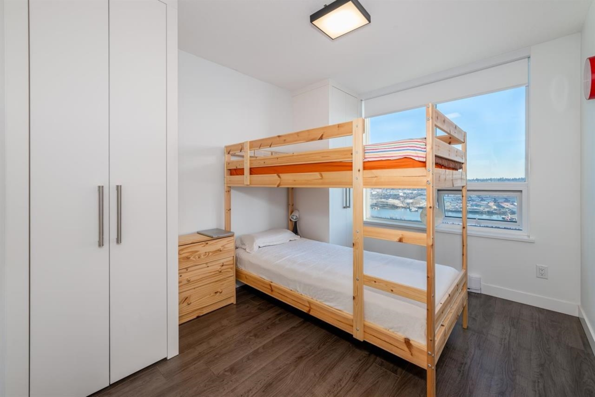 RiverSky by BOSA, with Unobstructed WATERFRONT VIEWS. This premium, high-floor suite, 2 bed & 2 bath SE corner unit with forever water, city, & stunning mountain views! Separated bedrooms for privacy and oversized balcony with access from the living room & the primary bedroom! Steps to Skytrain station, and River Market, restaurants & shops. Building amenities include concierge, well equipped gym, clubhouse, rooftop garden, temperature controlled room for grocery deliveries, EV charging stations & much more. Still under 2-5-10 Warranty. Don't miss out!