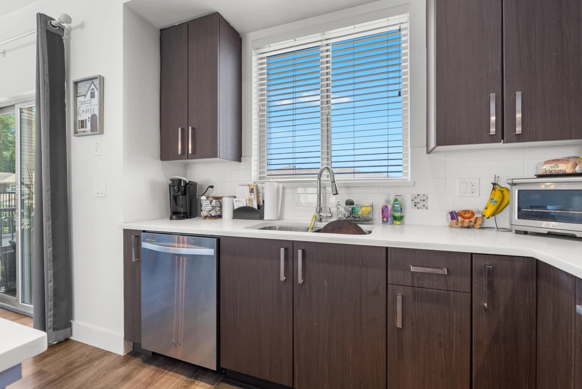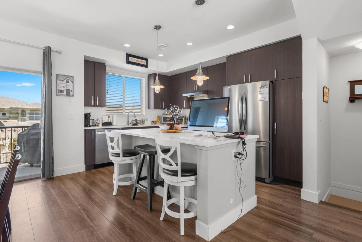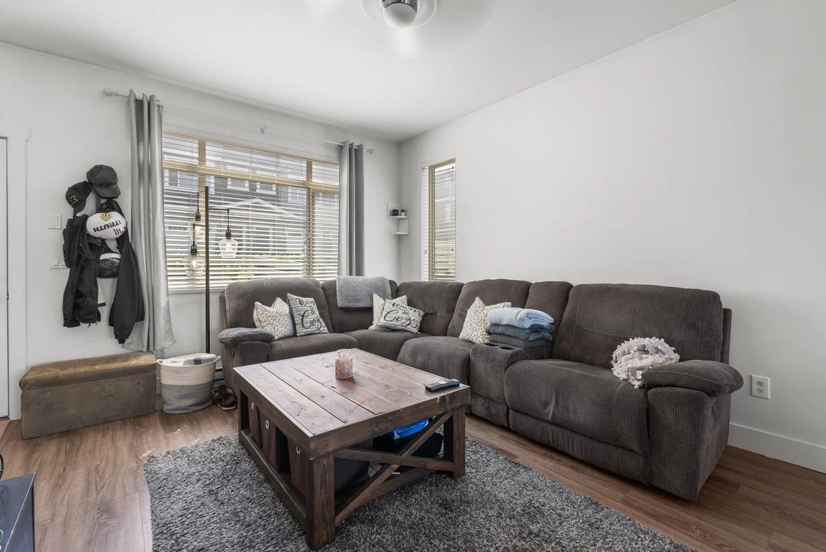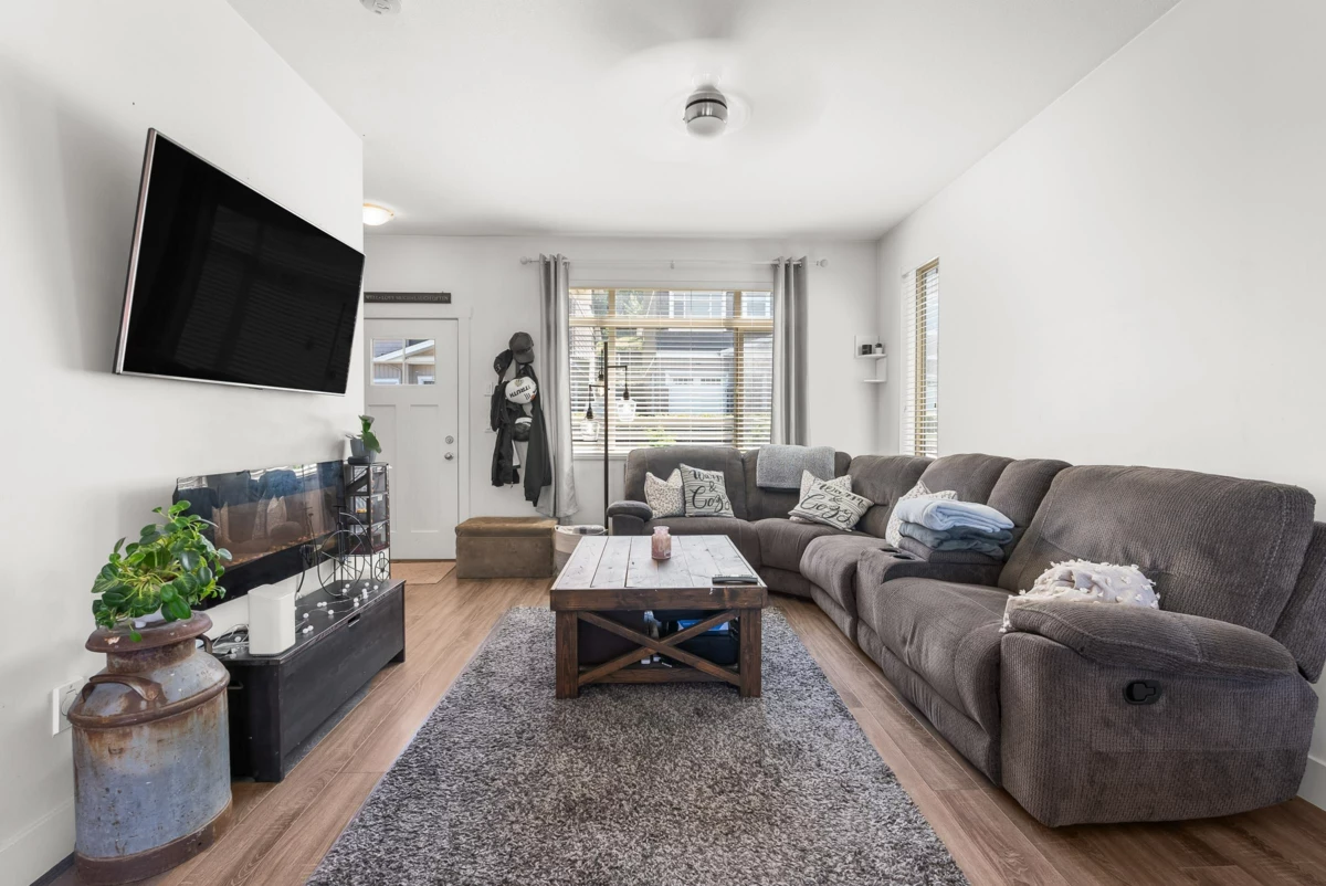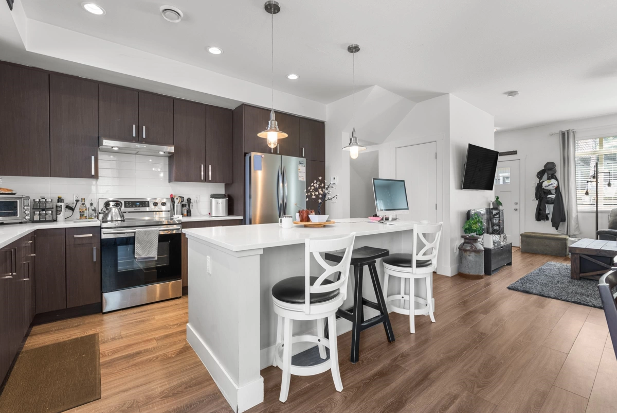 This is Ten Oaks! Welcome to this desirable townhome community in an ideal location within great school catchment and short walk to Clayburn Shopping Center. You will appreciate this nearly 1400 square foot home hosting 3 (easily 4) bedrooms and three bathrooms. Find an open and bright main floor with plenty of kitchen, dining and living room space. Above features three bedrooms including nice ensuite and full family bath. Basement has added office/bedroom and access to your double garage. Enjoy the hard-to-find double driveway with room to park two more full sized vehicles. Ten Oaks is a pet friendly strata welcoming two dogs (any size), or two cats or one of each. Reasonable fee of 290/month. Front fenced grass area plus community playground. Make Ten Oaks your home!