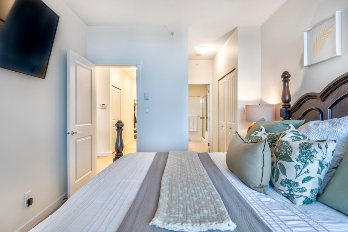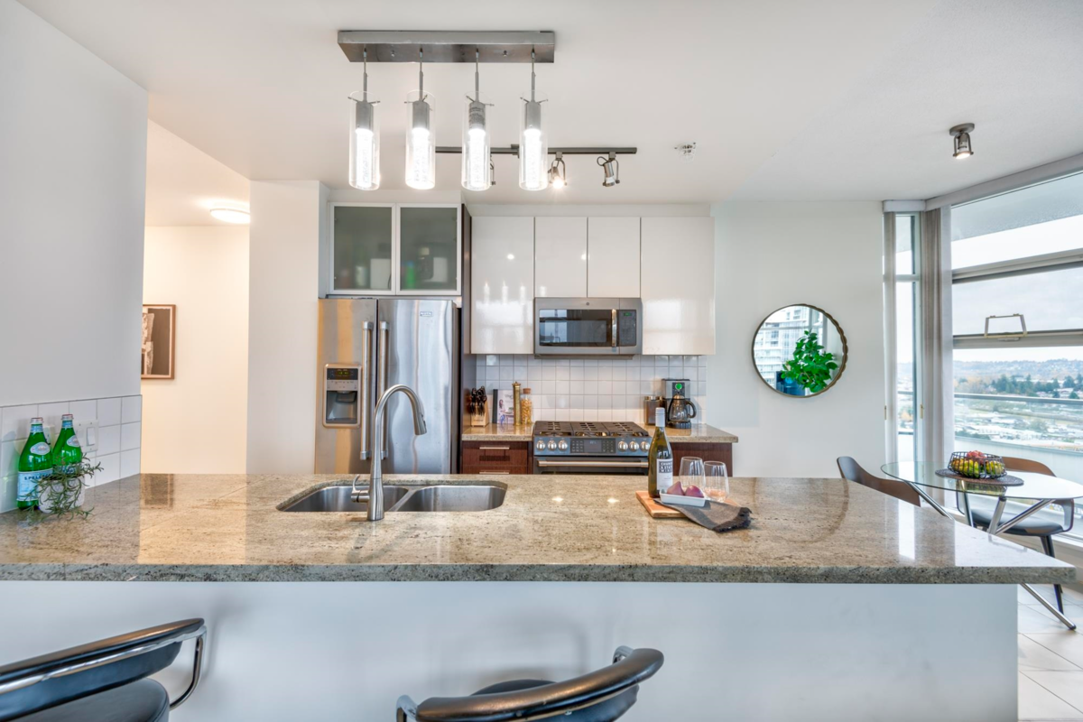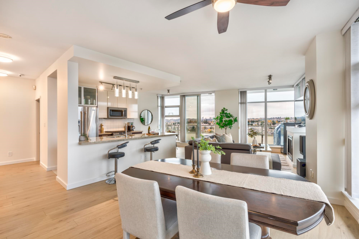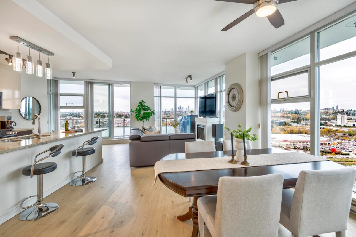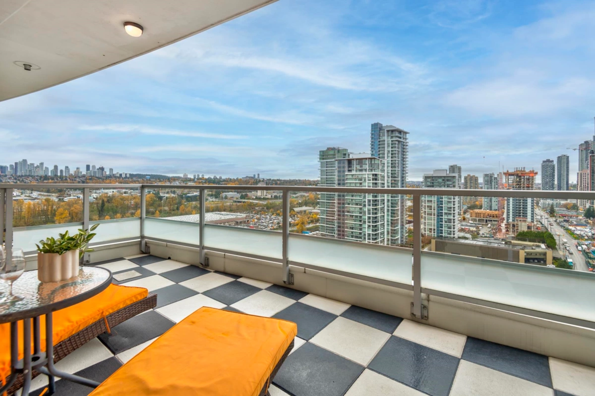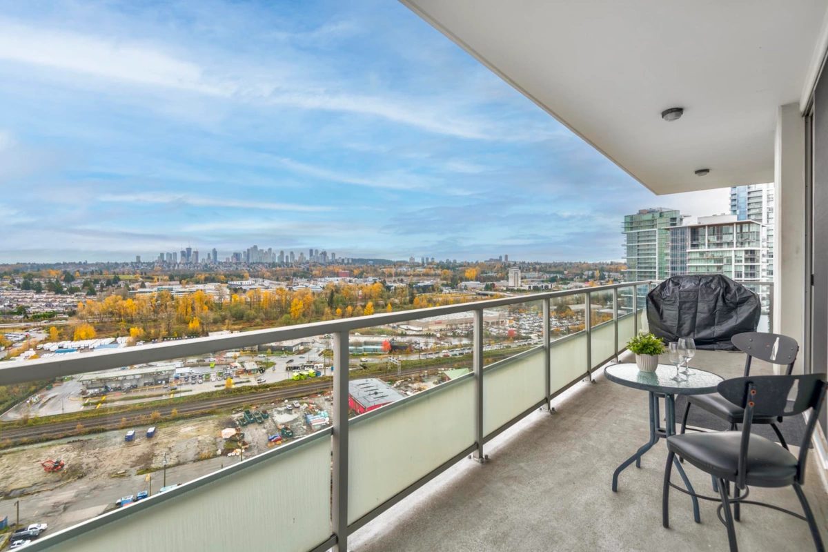 Watercolors by Polygon! A rare 3 bedroom 1,278 sqft SW corner Penthouse with sweeping views of Mt. Baker, Metrotown & the North Shore Mountains from 2 private balconies, plus stunning sunsets. Featuring new paint & laminate flooring, floor-to-ceiling windows, granite counters, tiled baths & a cozy electric fireplace. The kitchen offers stainless appliances, gas stove, a breakfast bar & bright eating area. The primary includes a walk-through closet & luxurious ensuite with double sinks, soaker tub & separate shower. The second bath has a steam shower. In-suite laundry, 2 parking & 1 locker. Amenities include gym, hot tub, sauna & party room. Steps to Brentwood, transit & SkyTrain, with quick access to Metrotown, highway & DT.**OPEN HOUSE: Nov. 29 & 30, 2 - 4 PM