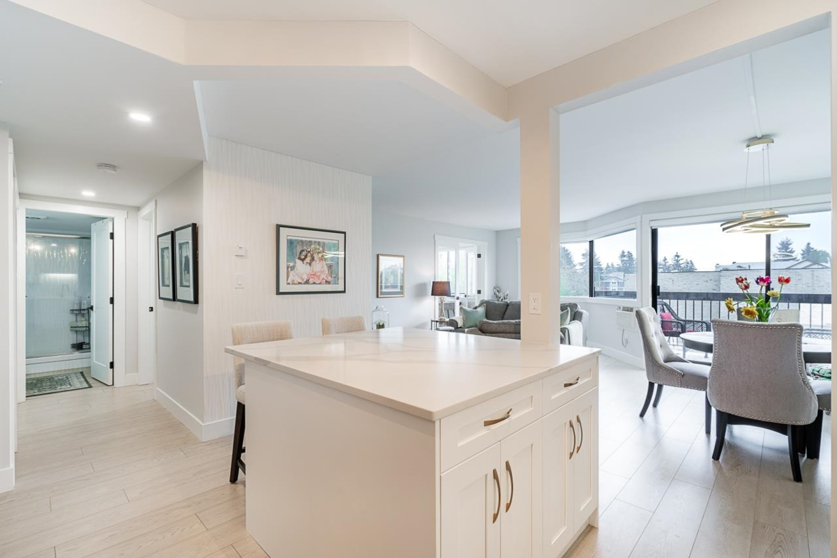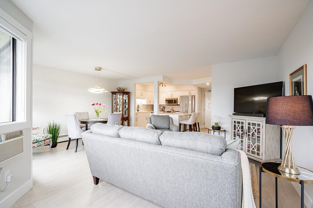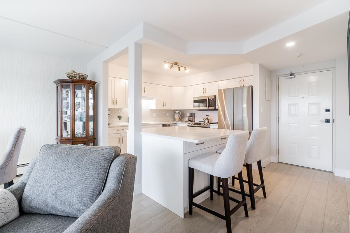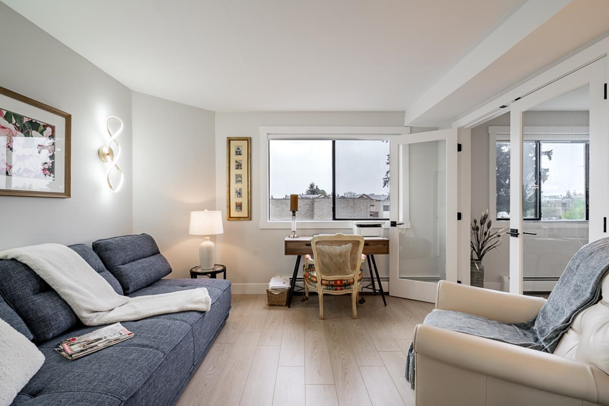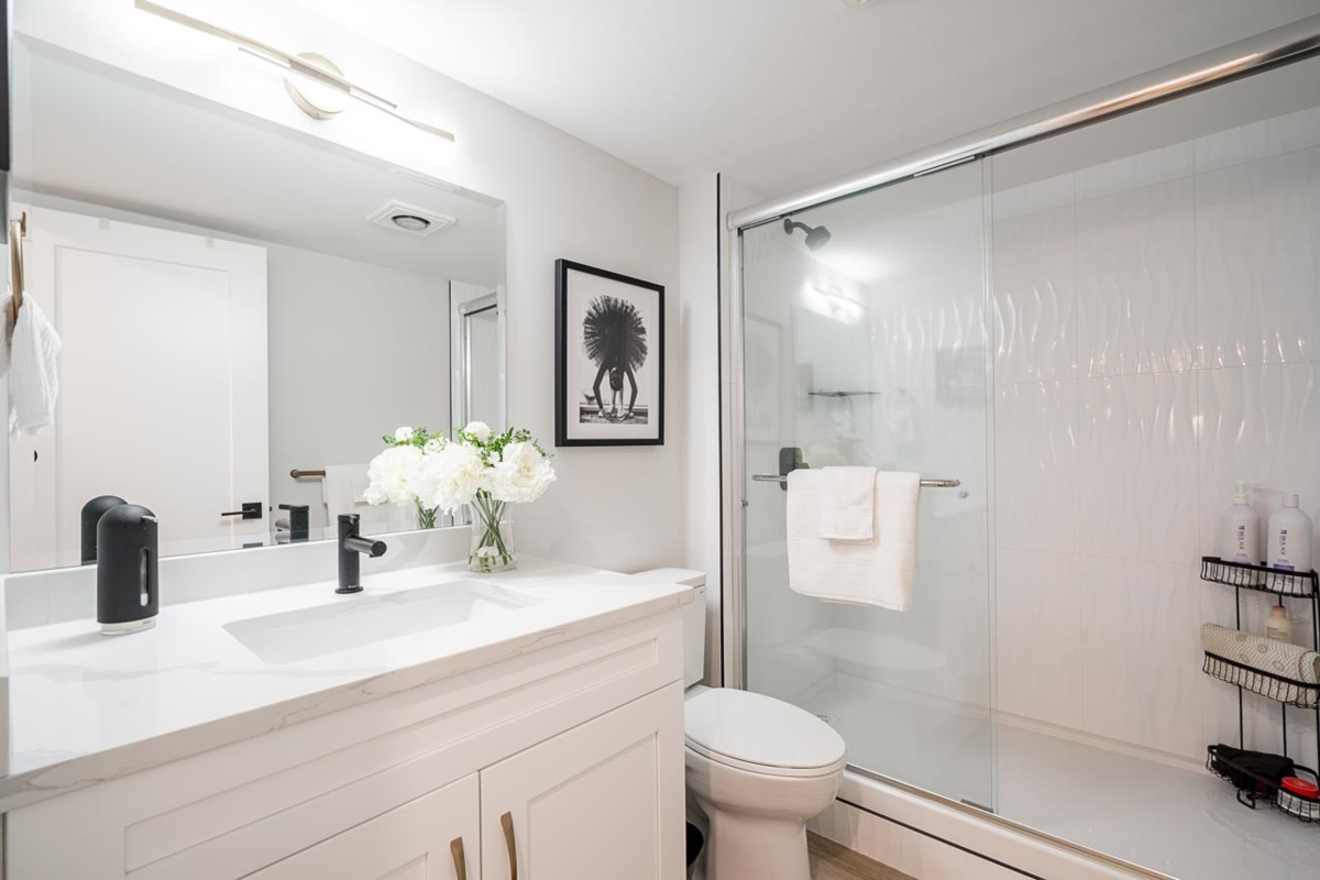 Bright and spacious fully renovated unit ready for you to enjoy! With large kitchen & island, SS appliances, quartz counters, tile backsplash, and ample cupboard space. Living room features large windows w/ custom blinds and a view of Mt. Baker from your covered deck, spacious dining area perfect for entertaining. Bedroom features walk in closet. Second bed/den with french doors leading to living rm. Unit includes modern light fixtures, all new interior doors/trim, and new flooring throughout. New Bathroom with walk-in shower & waterproof flooring. New In suite Washer/dryer. Storage locker inc. Evergreen Village also has indoor pool, hot tub, gym, guest suite, games rm, workshop, & RV parking. Centrally located near shops, restaurants, parks, and transportation. Heat inc in strata fee.