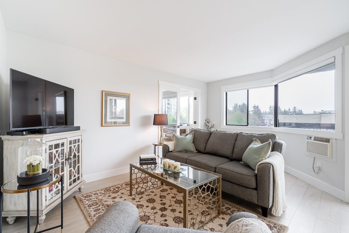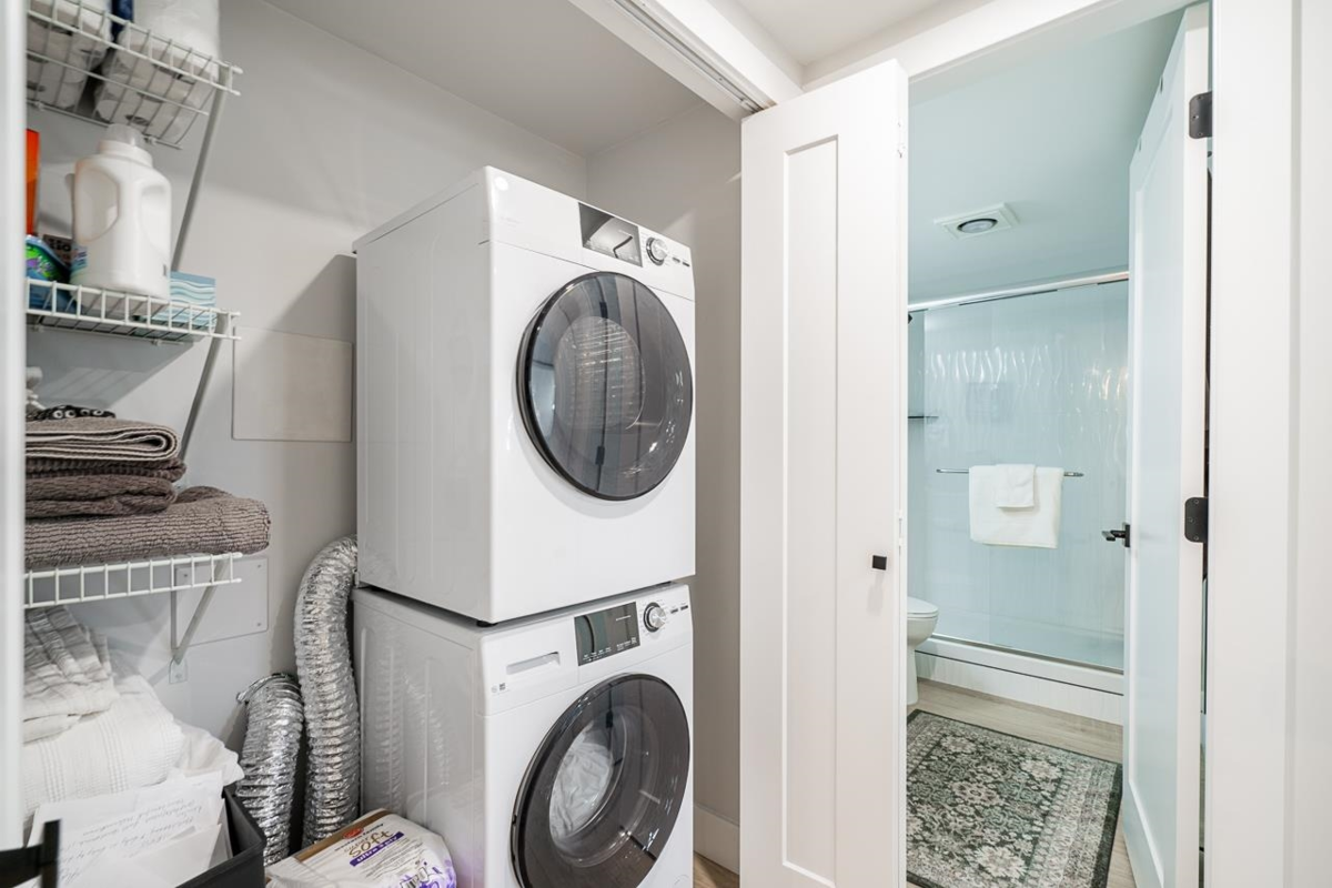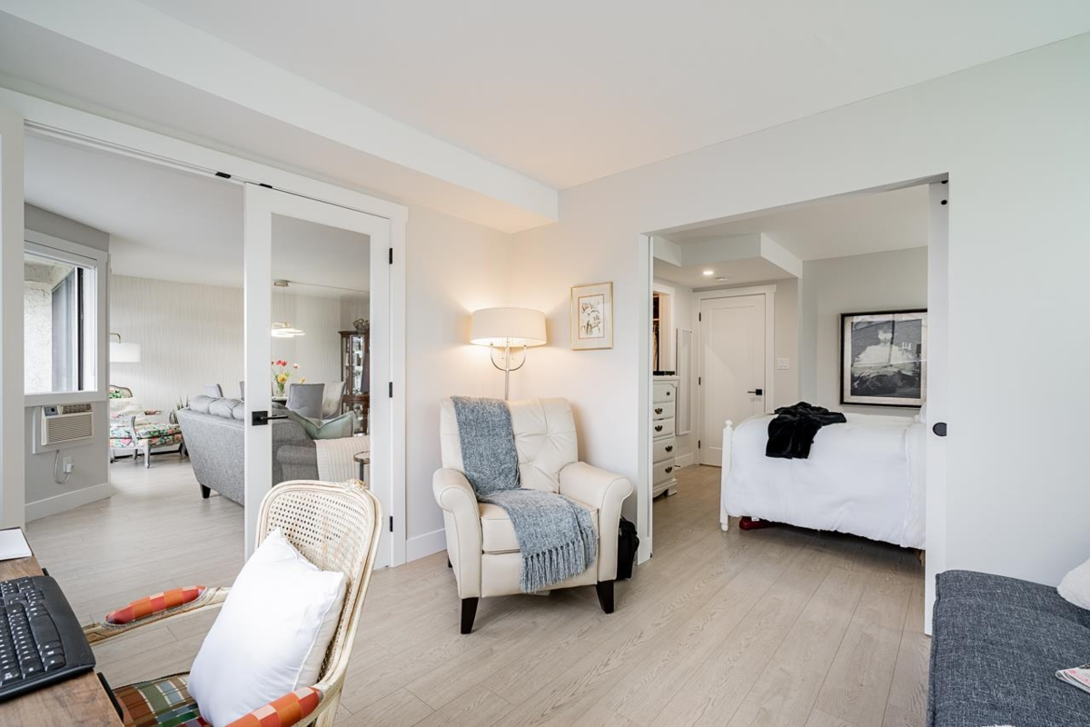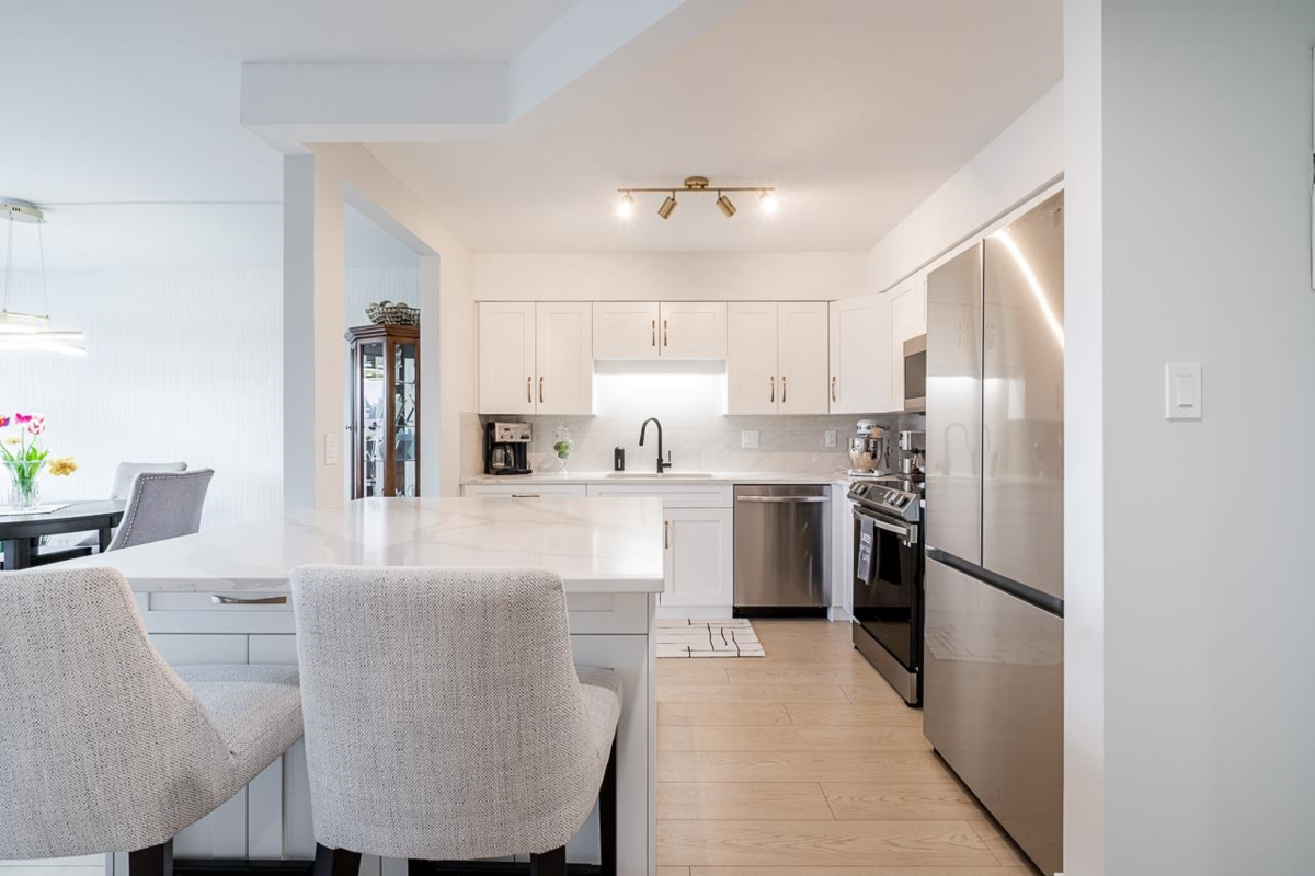 Bright and spacious fully renovated unit ready for you to enjoy! With large kitchen & island, SS appliances, quartz counters, tile backsplash, and ample cupboard space. Living room features large windows w/ custom blinds and a view of Mt. Baker from your covered deck, spacious dining area perfect for entertaining. Bedroom features walk in closet. Second bed/den with french doors leading to living rm. Unit includes modern light fixtures, all new interior doors/trim, and new flooring throughout. New Bathroom with walk-in shower & waterproof flooring. New In suite Washer/dryer. Storage locker inc. Evergreen Village also has indoor pool, hot tub, gym, guest suite, games rm, workshop, & RV parking. Centrally located near shops, restaurants, parks, and transportation. Heat inc in strata fee.