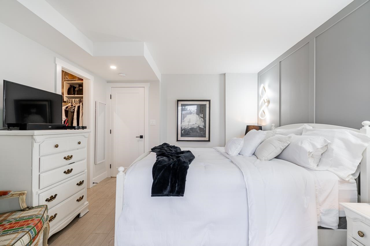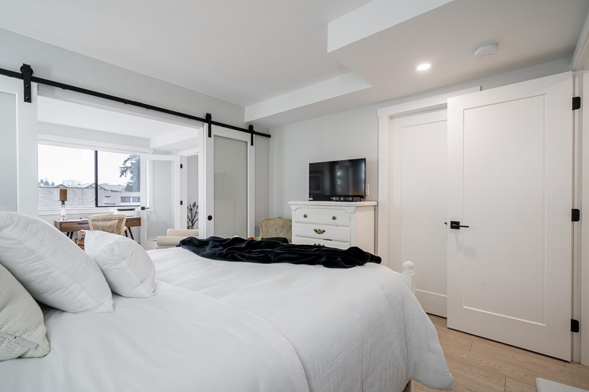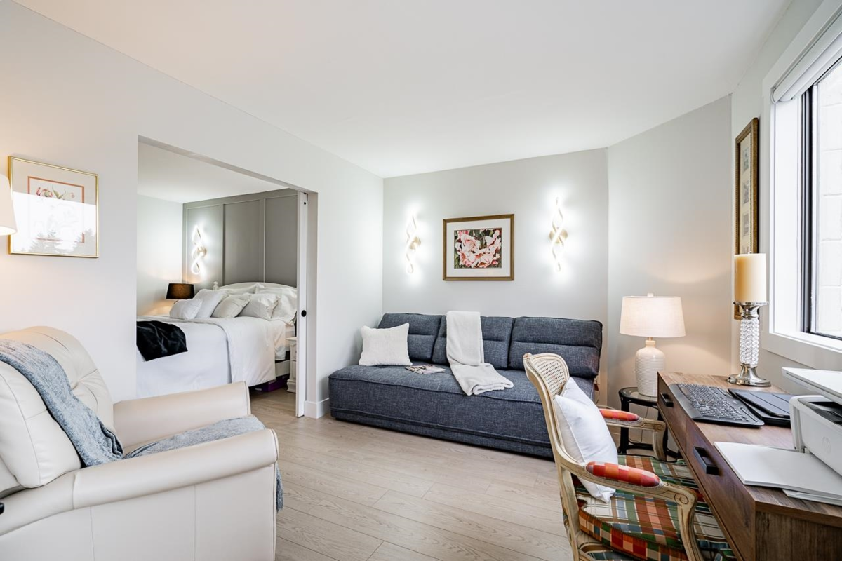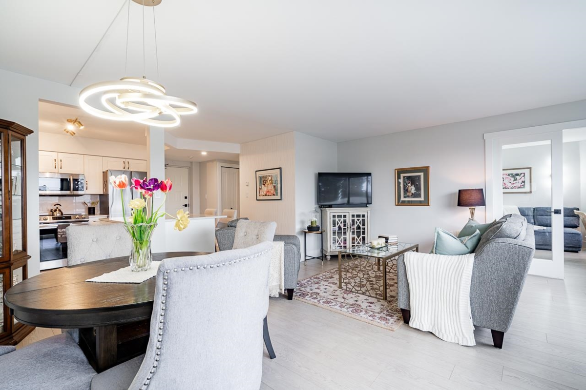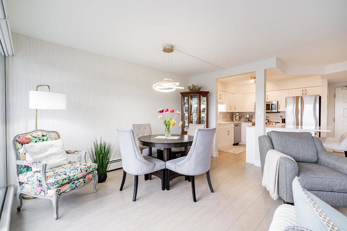 Bright and spacious fully renovated unit ready for you to enjoy! With large kitchen & island, SS appliances, quartz counters, tile backsplash, and ample cupboard space. Living room features large windows w/ custom blinds and a view of Mt. Baker from your covered deck, spacious dining area perfect for entertaining. Bedroom features walk in closet. Second bed/den with french doors leading to living rm. Unit includes modern light fixtures, all new interior doors/trim, and new flooring throughout. New Bathroom with walk-in shower & waterproof flooring. New In suite Washer/dryer. Storage locker inc. Evergreen Village also has indoor pool, hot tub, gym, guest suite, games rm, workshop, & RV parking. Centrally located near shops, restaurants, parks, and transportation. Heat inc in strata fee.