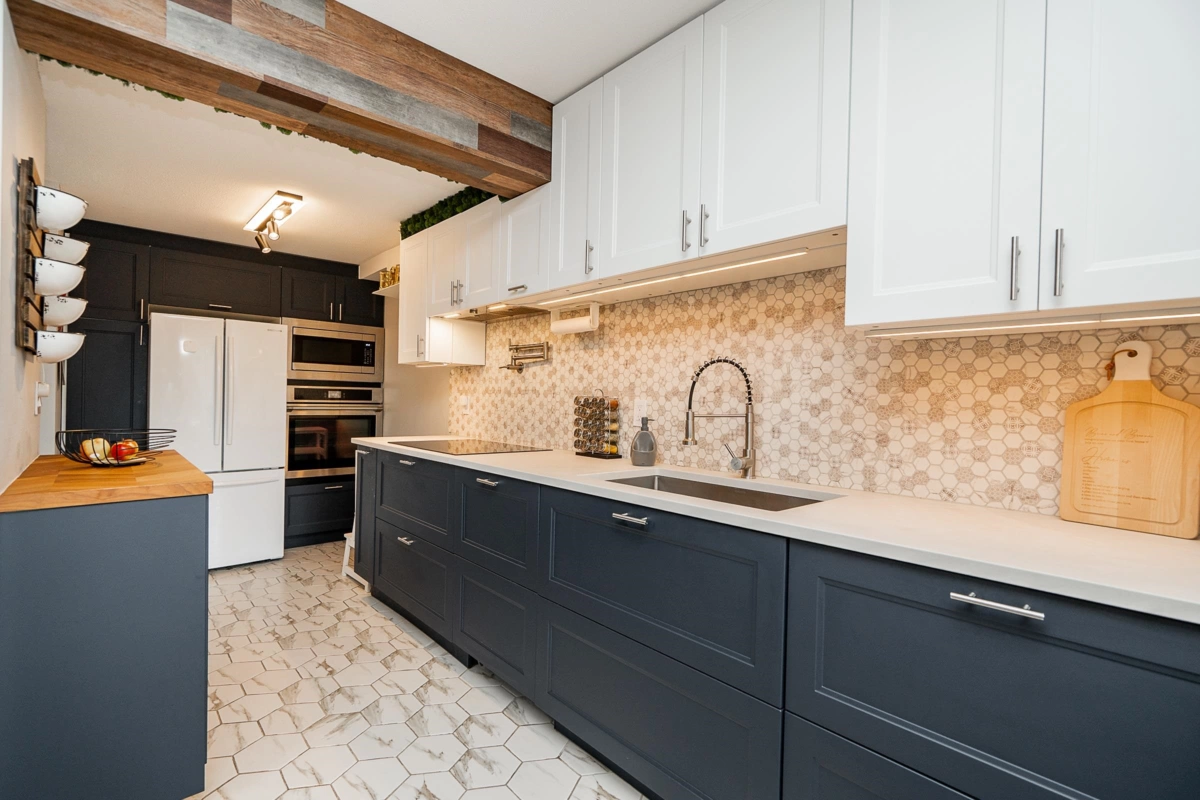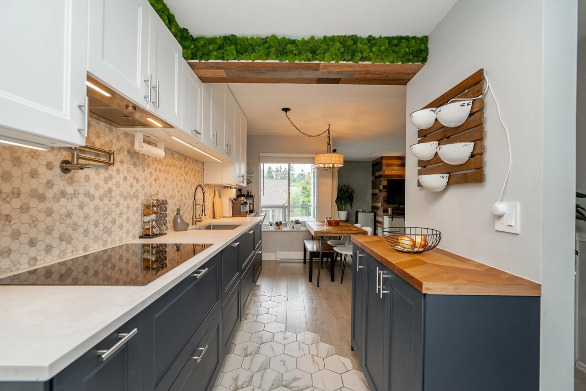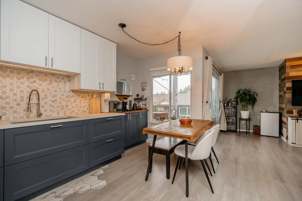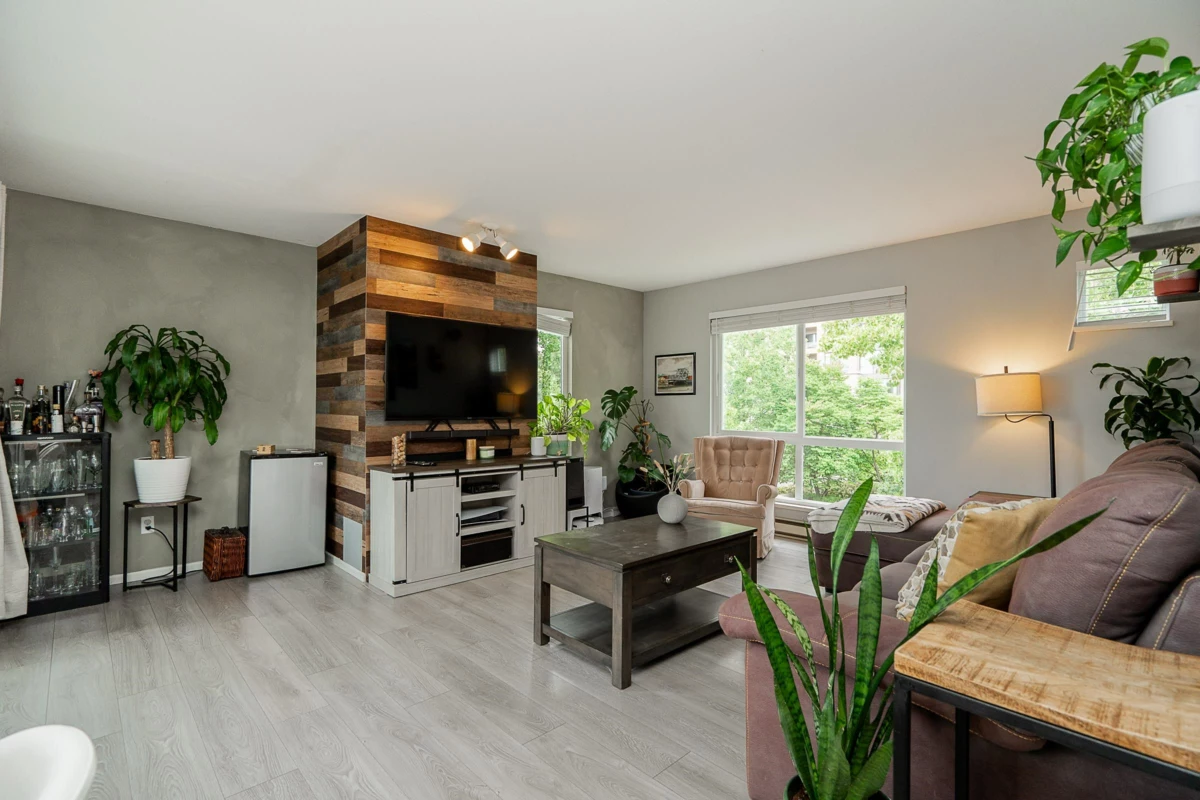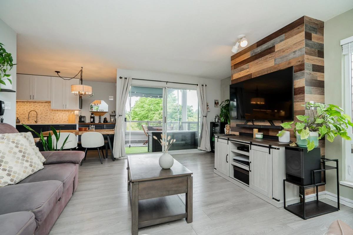 Discover this beautiful corner unit nestled in a quiet, peaceful setting! This 2 bed + flex, 2 bath 1181 sq ft unit offers a modern, updated kitchen with quartz countertops, a pantry wall with built-in appliances, ample storage and a coffee bar. The bright spacious living room flows seamlessly from the kitchen and dining area, anchored by a fireplace with access to the inviting covered balcony perfect for sun drenched mornings or evening relaxations. The primary bedroom has a walk-in closet and a private 5-piece ensuite. The second bedroom and full bath provide comfortable living, while the large laundry room offers convenience and the flex area makes the perfect home office. Includes 2 parking stalls and locker. Conveniently located near parks, schools and transit.