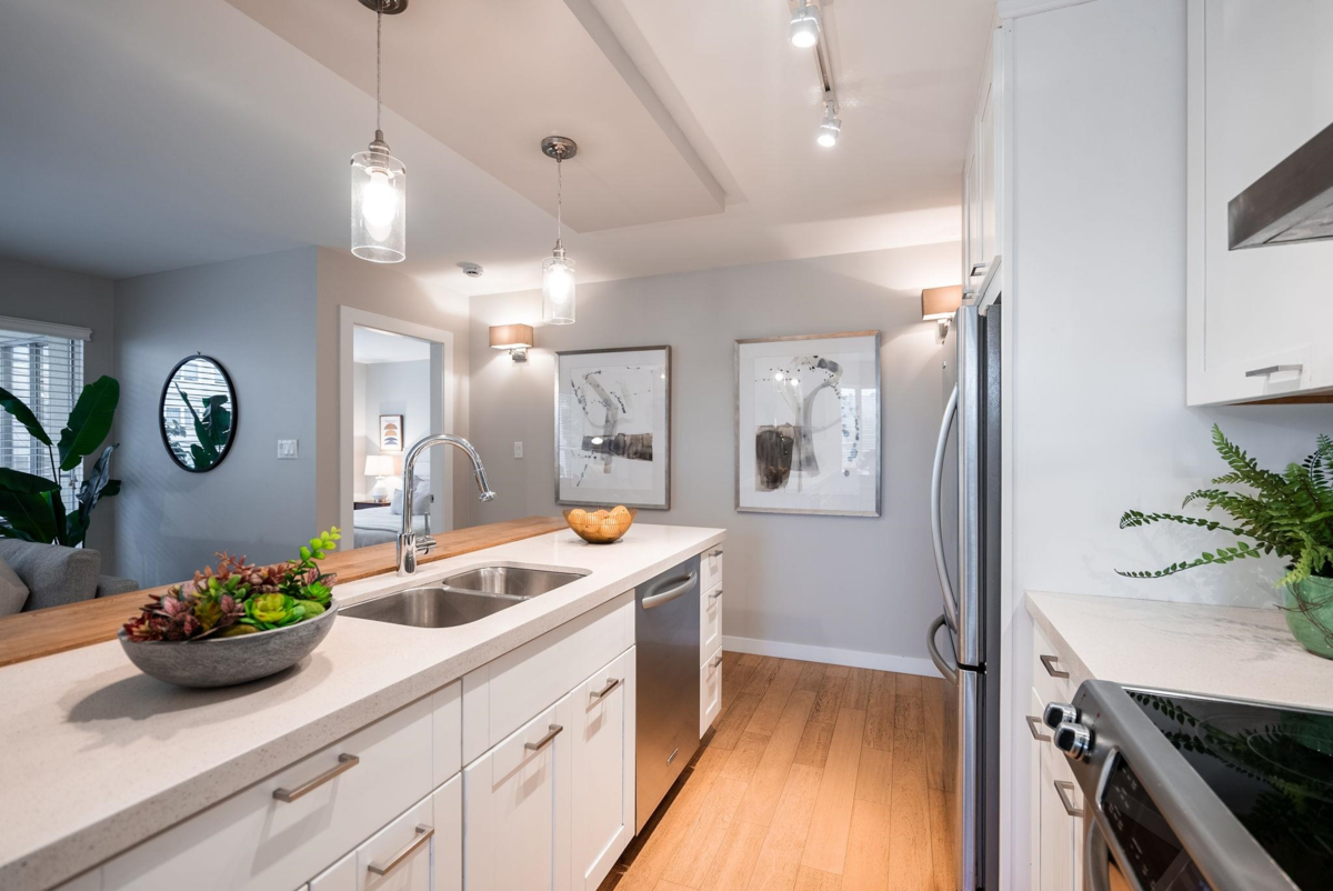 Woaw…the West End enchants once more! Quietly set on the quieter side of this boutique, fully concrete rainscreened bldg, this 1002 sqft corner home shines with light, elegance, and that certain je ne sais quoi. A welcoming foyer opens to beautifully renovated spaces where modern comfort meets timeless style. Two spacious bed at opposite ends, two full baths, and open living areas create the perfect blend of entertaining ease & cozy evenings by the gas fireplace. Enjoy your 80 sqft covered balcony year-round—espresso or evening wine included. Extras: low turnover, RENOVATED GUEST SUITE, in-suite laundry & storage, pet friendly (1 cat or 1 dog no weight or height restrictions), visitor parking, bike room, and exceptional maintenance. Easy living meets West End magic! Check out our video.