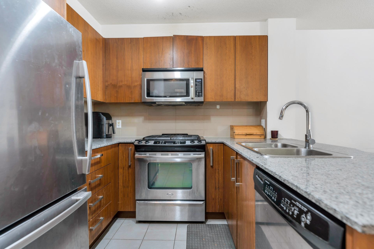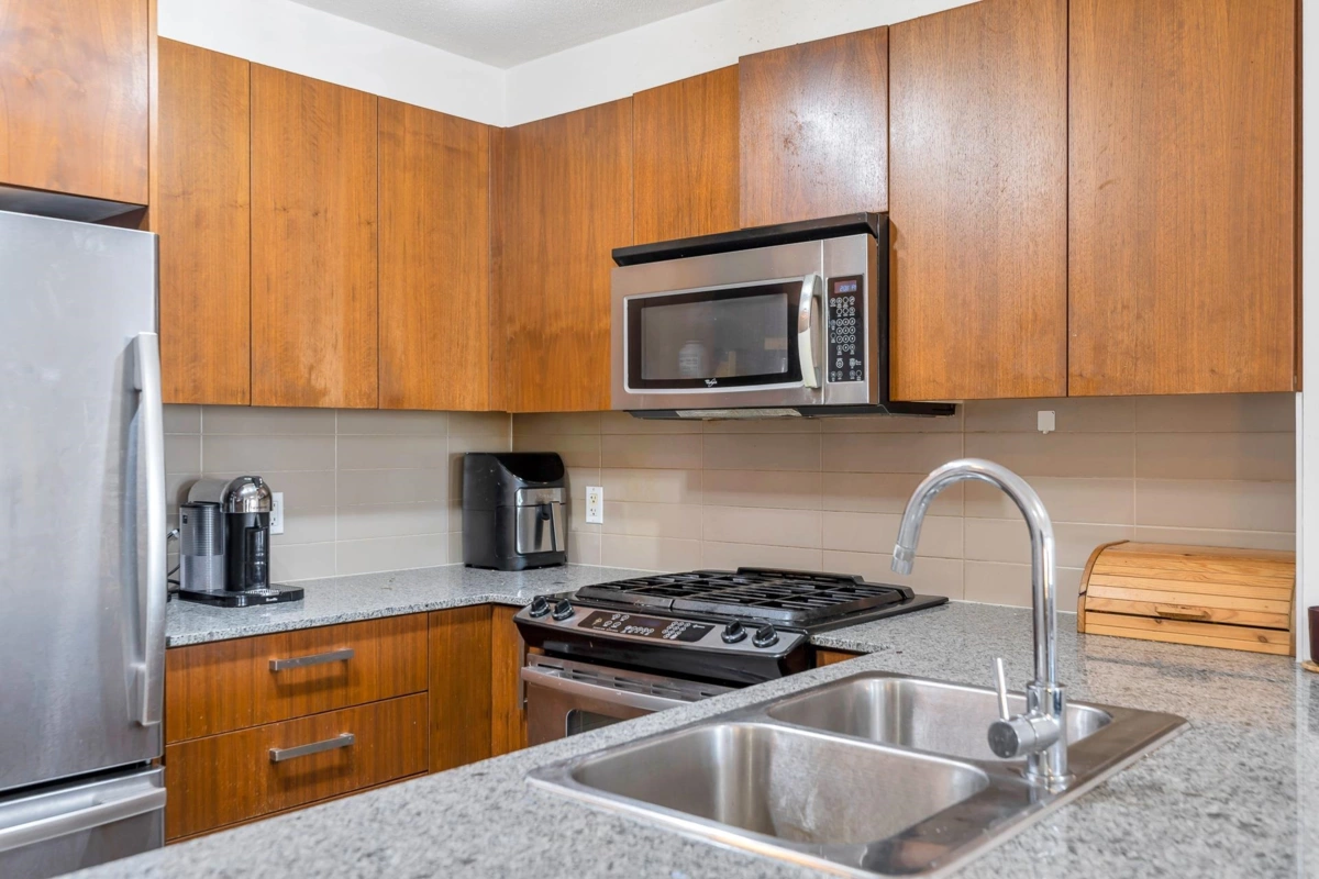 Welcome to MacPherson Walk, an award-winning development located in the heart of Burnaby's Metrotown. This 2BR 2Bath offers a bright, open, and practical layout with laminate floors, the entire home freshly painted, new light fixtures, clean, and ready to move in! Enjoy a gourmet kitchen featuring granite countertops, stainless steel appliances, and a gas range. The unit also includes the convenience of in-suite laundry. Enjoy the outdoors from your covered balcony with a gas BBQ hookup. The well-maintained strata include 4 acres of landscaped grounds, walking trails, and picnic areas. Amenities include a social lounge and an exercise center. Conveniently located near Metrotown Shopping Centre, Royal Oak SkyTrain station, restaurants, and Burnaby South Secondary School.