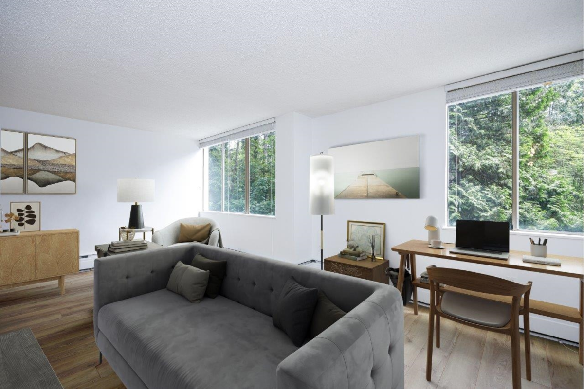Great value here!!! This spacious and fully renovated, 906 sq ft, 2 bedroom plus den/storage unit is located in the popular Seymour building at Woodcroft. A beautiful renovation was completed in 2020 including paint, updated bath and stunning kitchen with quality wood countertops and new appliances. The corner unit has a lovely, green and private outlook. Relax on the covered balcony. Incredible amenities include indoor pool, whirlpool, gym, sauna and workshop. Parkade membrane project ongoing but has been paid for. A treat to view...just move in! OPEN SUN NOV 30th 2-4.