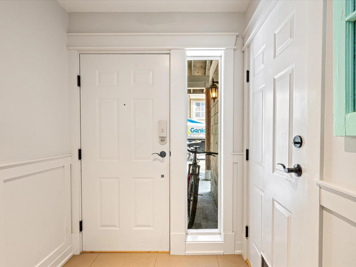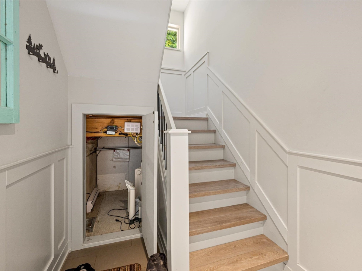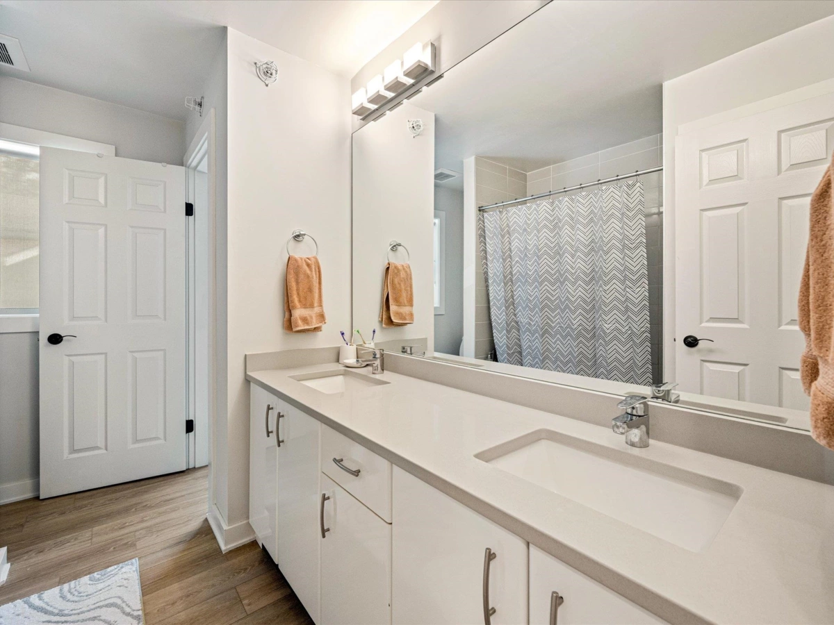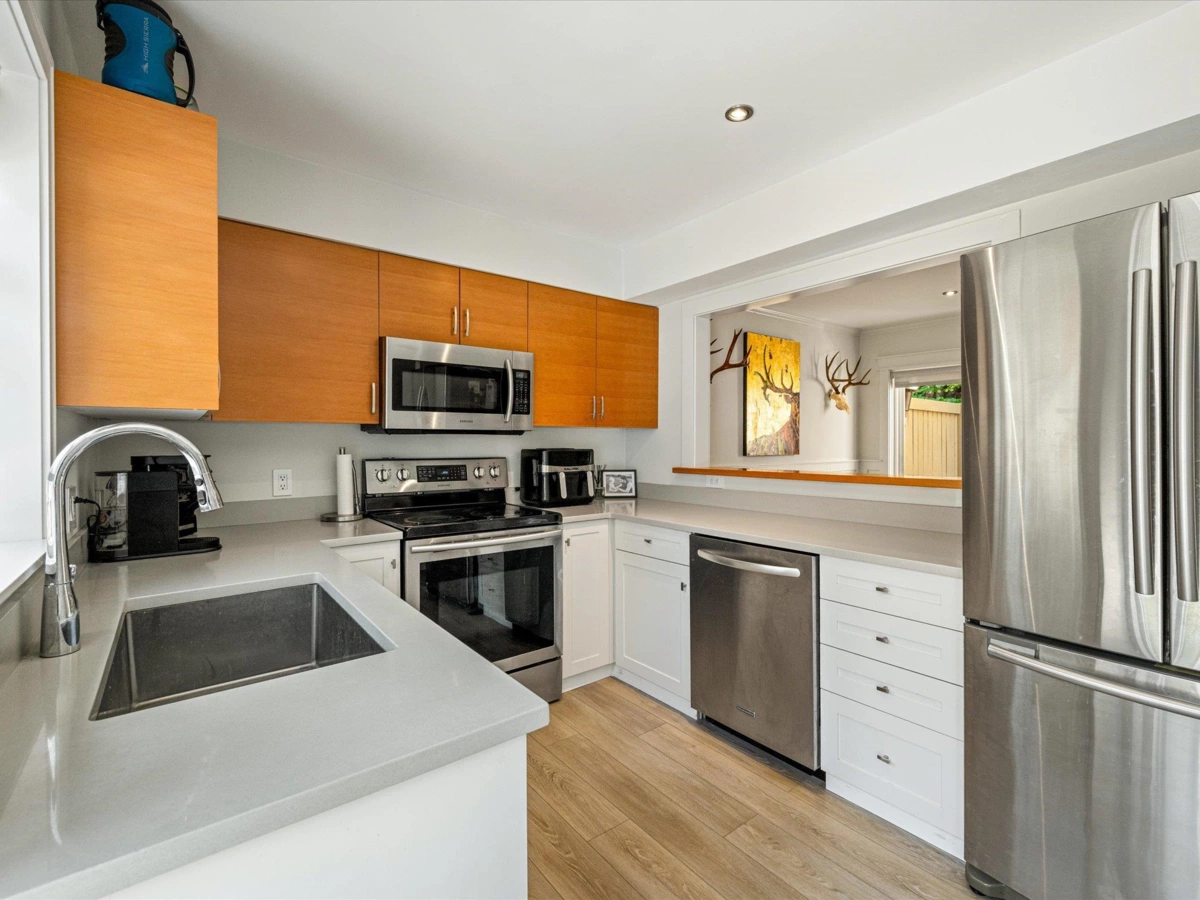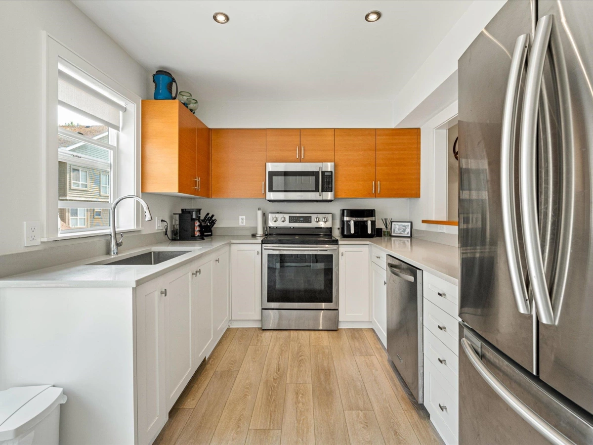 Bright and spacious 2-bed & 1.5 bath townhouse in Creekside Village has been thoughtfully updated with modern, functional finishes & new flooring throughout. Downstairs features a 2-car garage with a new door—as well as a welcoming entryway with in-floor heating. Upstairs, the main living area offers an open, airy layout with large windows and a private deck that overlooks a serene forested backdrop. Stone countertops, SS appliances, and sleek, timeless cabinetry in the kitchen. On the top floor, you’ll find two comfortable bedrooms and a beautifully renovated main bathroom, complete with custom tile work and a double vanity. Additional upgrades include new plumbing (2010), updated heat registers, recessed lighting, fresh paint throughout, and modernized outlets and switches.