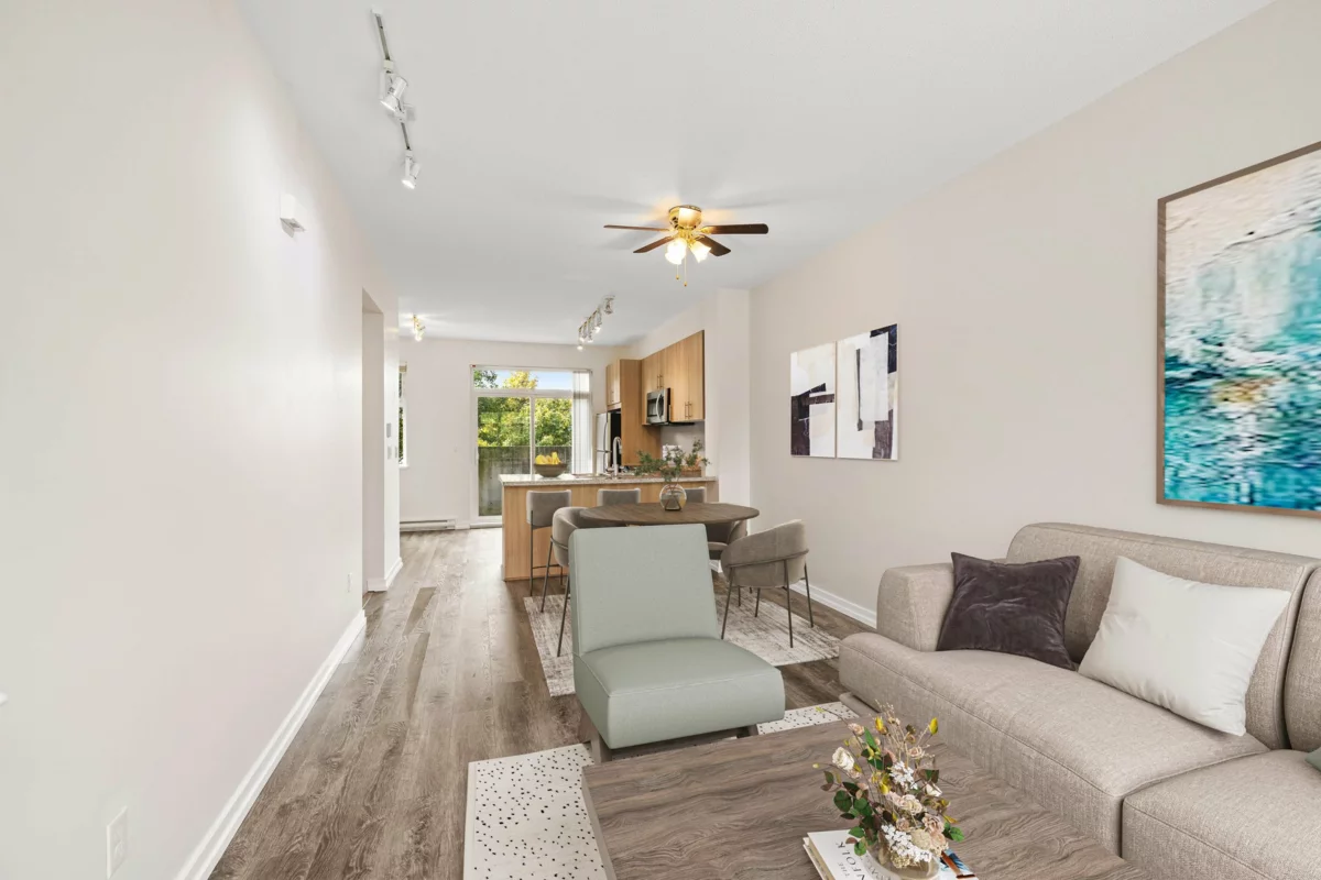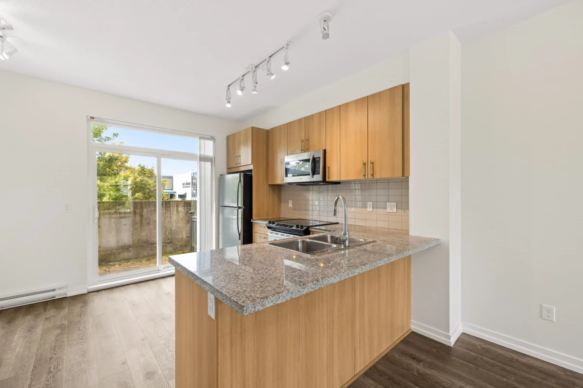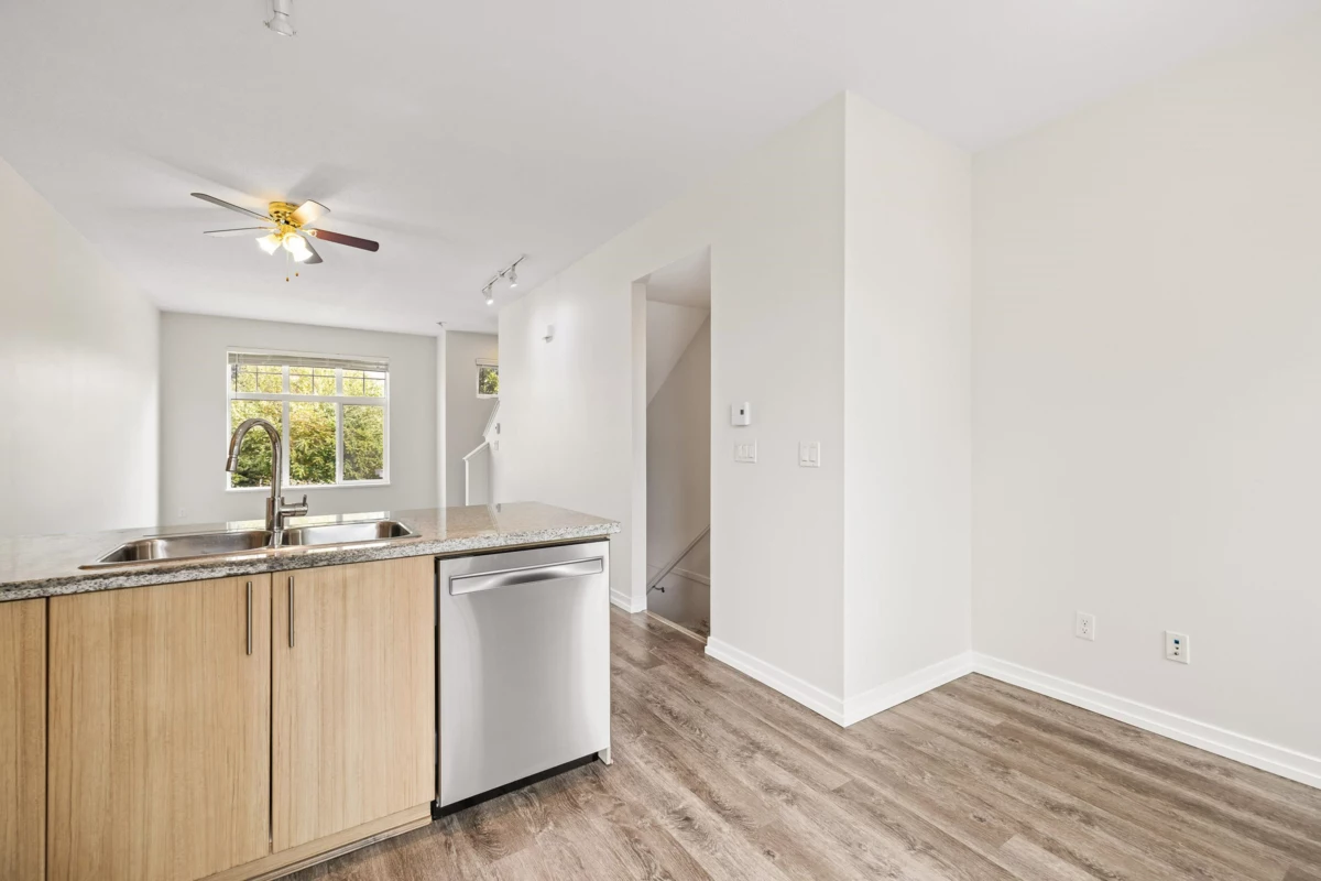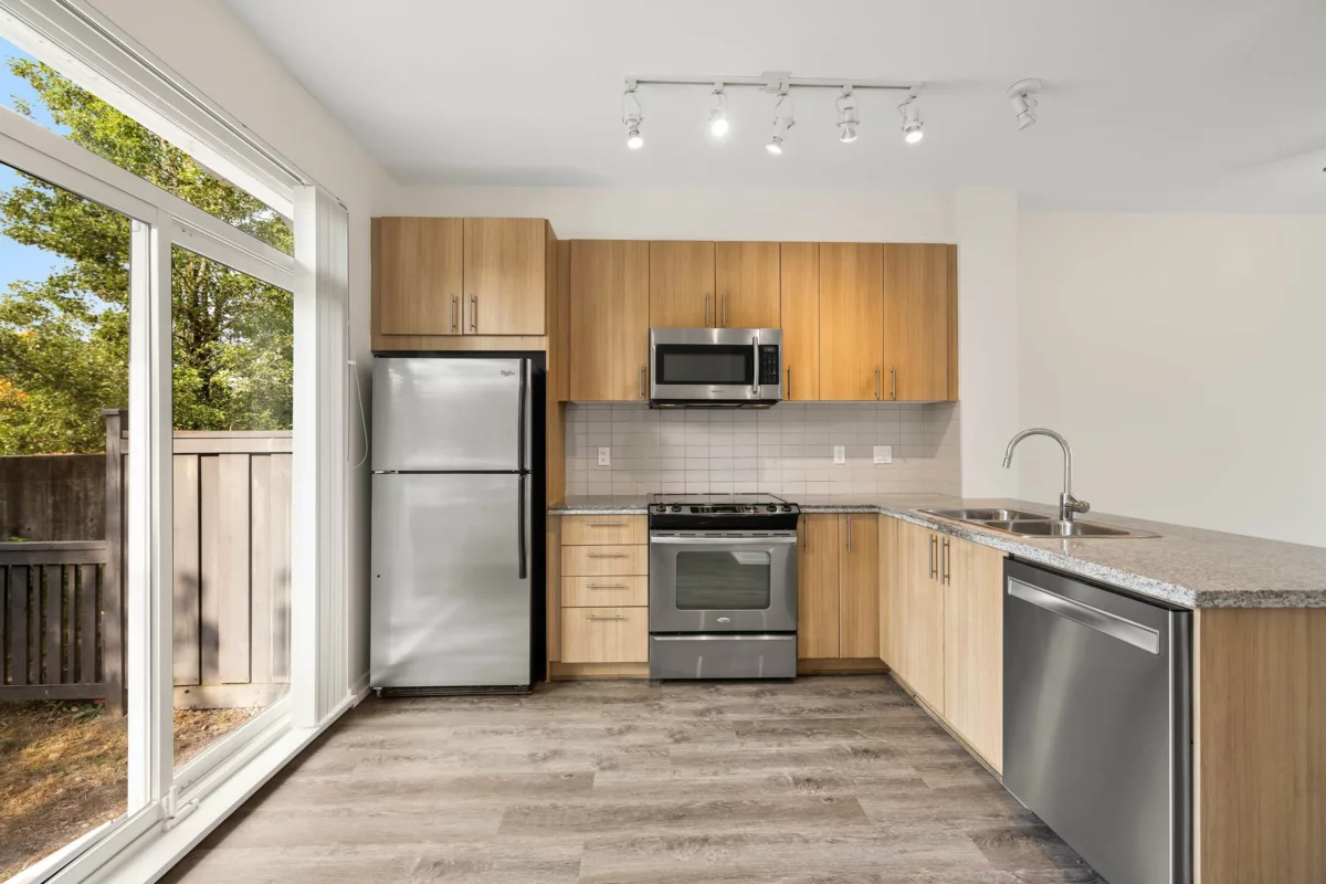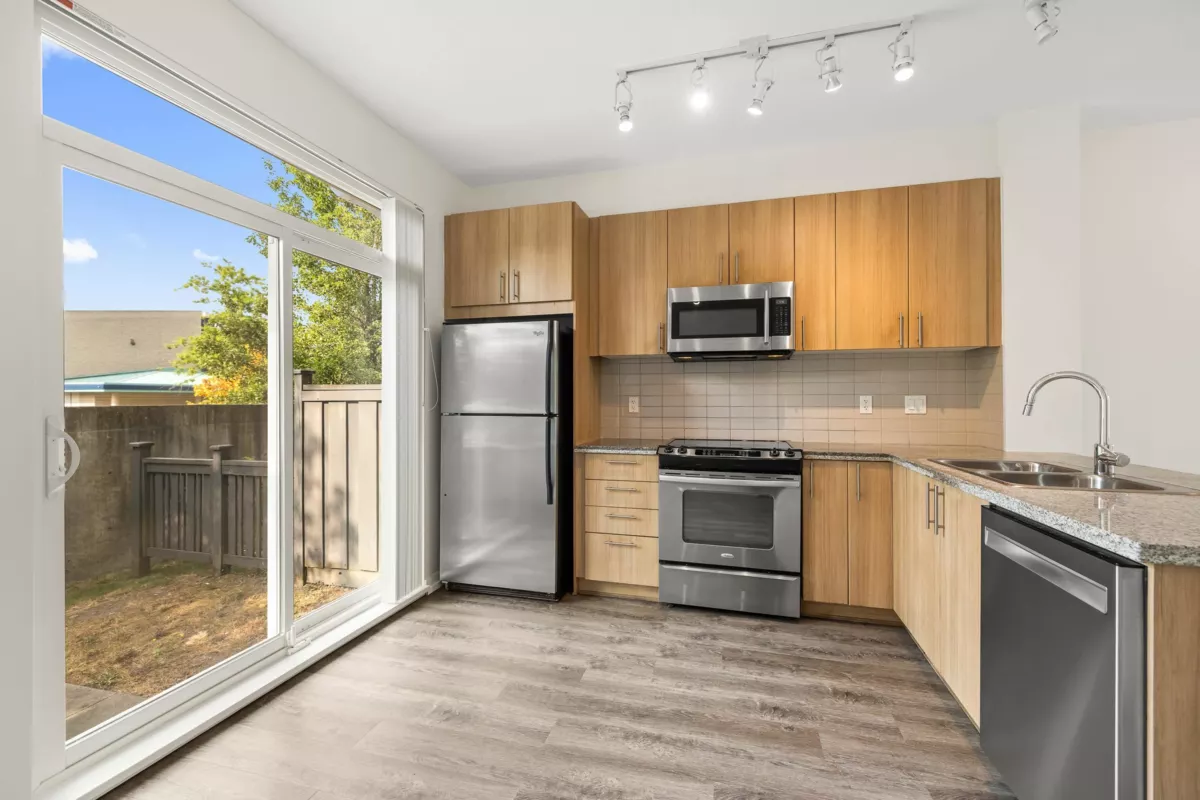 FANTASTIC VALUE! Why buy a condo when you can own a townhouse! This 2-bed, 1-bath townhome offers over 1,000 sq/ft in a master-planned community by Polygon! The OPEN floor plan features newer vinyl plank flooring, kitchen w/granite counters, S/S appliances, new dishwasher, dining area, spacious living room + a RARE walk out private yard off the main floor! Upstairs features a large primary bedroom w/cheater ensuite equipped w/double sink, separate tub & shower + another good sized second bedroom! Single car garage + a huge pad in front, big enough to fit a large pick-up truck! Across the street from Rick Hansen High School & a short walk to Eugene Reimer Middle School & Harry Sayers Elementary. Enjoy access to resort-style amenities! Pool, hot tub, gym, hockey room, guest suite & more!