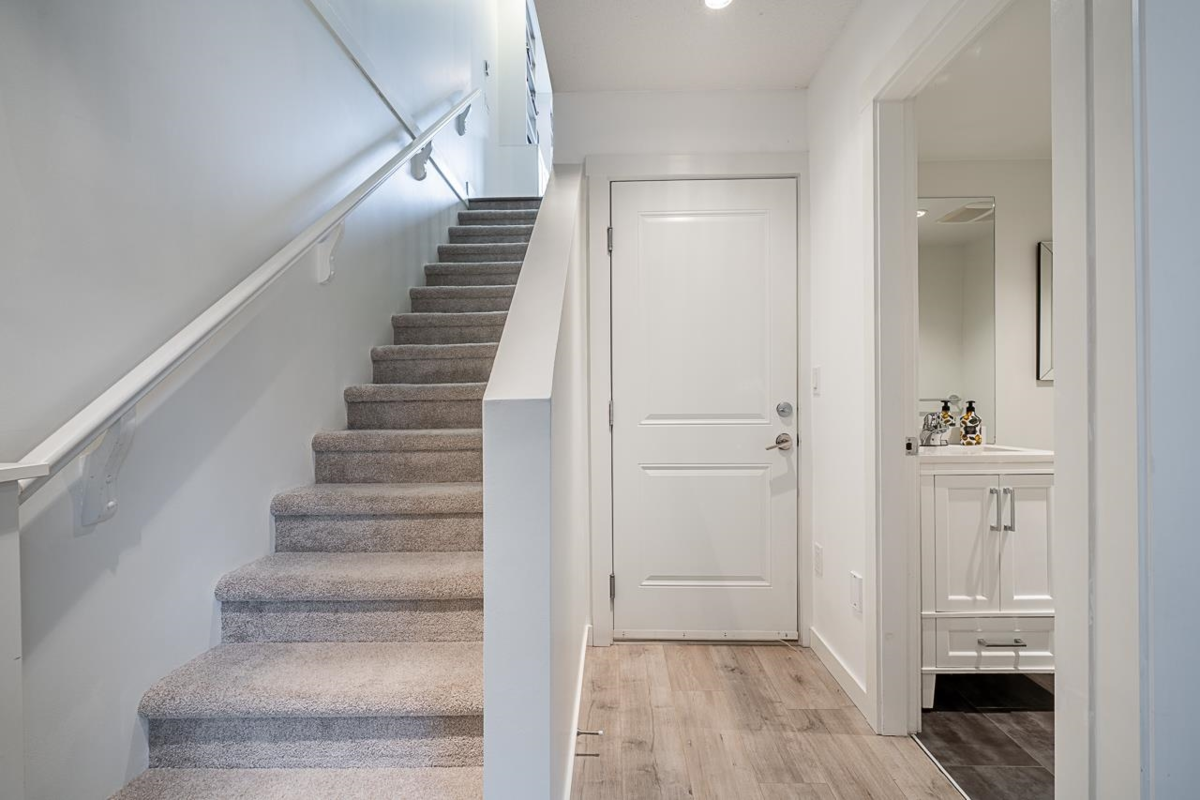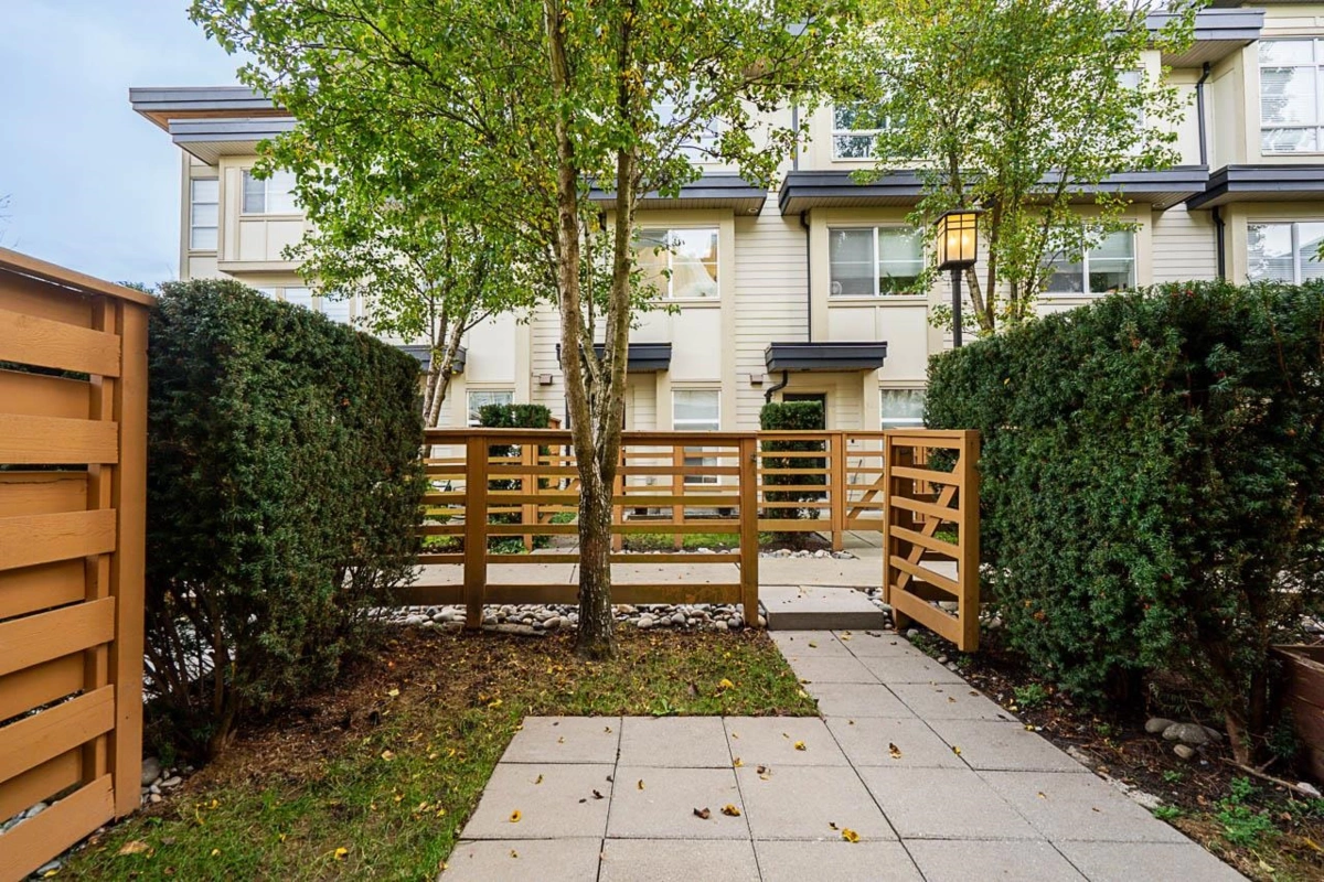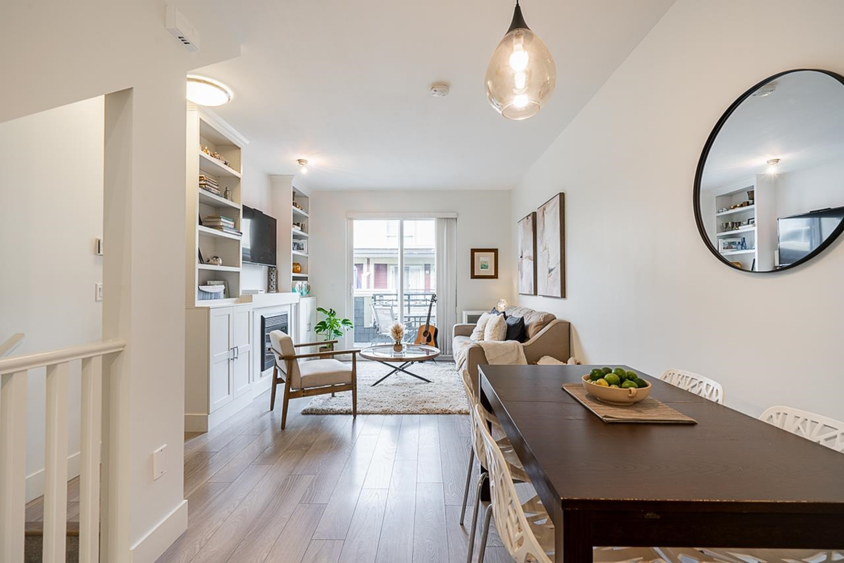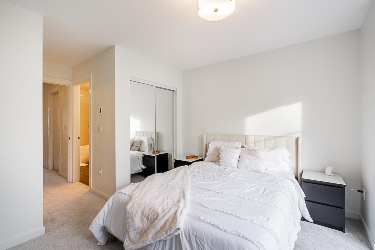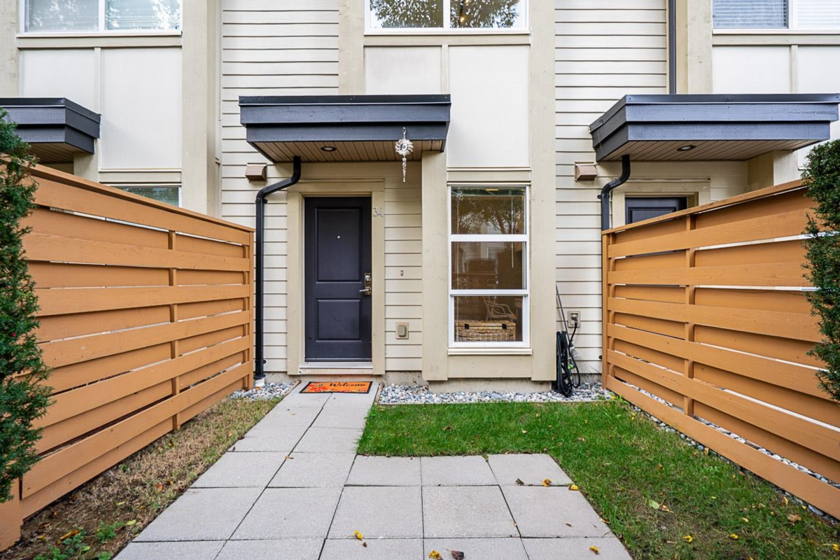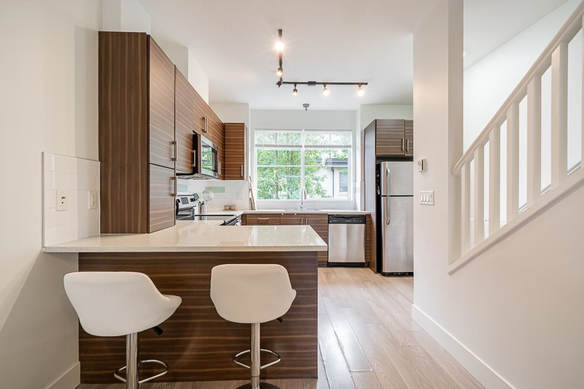 Turn key ready! No work to be done here it's been freshly painted & ready for you to move in! Over 1040SF of living space in this lovely 2 bedroom plus den home. The ground floor den is the perfect space for an office or small 3rd bedroom. There is adjoining 2pc bath & direct access to the garage. The main floor is open & spacious complete with a very nice custom built entertainment unit with a fireplace. Tons of kitchen cabinet storage space, quartz countertops, & SS appliances. The main also leads to a cozy deck, great for bbqs. Upstairs has 2 spacious bedrooms with the primary ensuite complete with a double vanity. This a great family neighbourhood & complex. Walk to all level of schools, amenities & transit. Plenty of parking as well with a single garage & an extra long parking pad.
