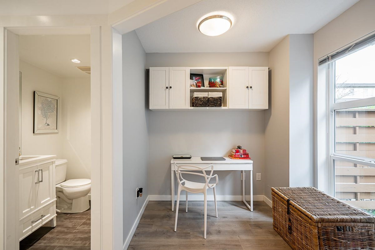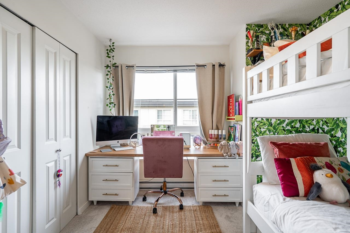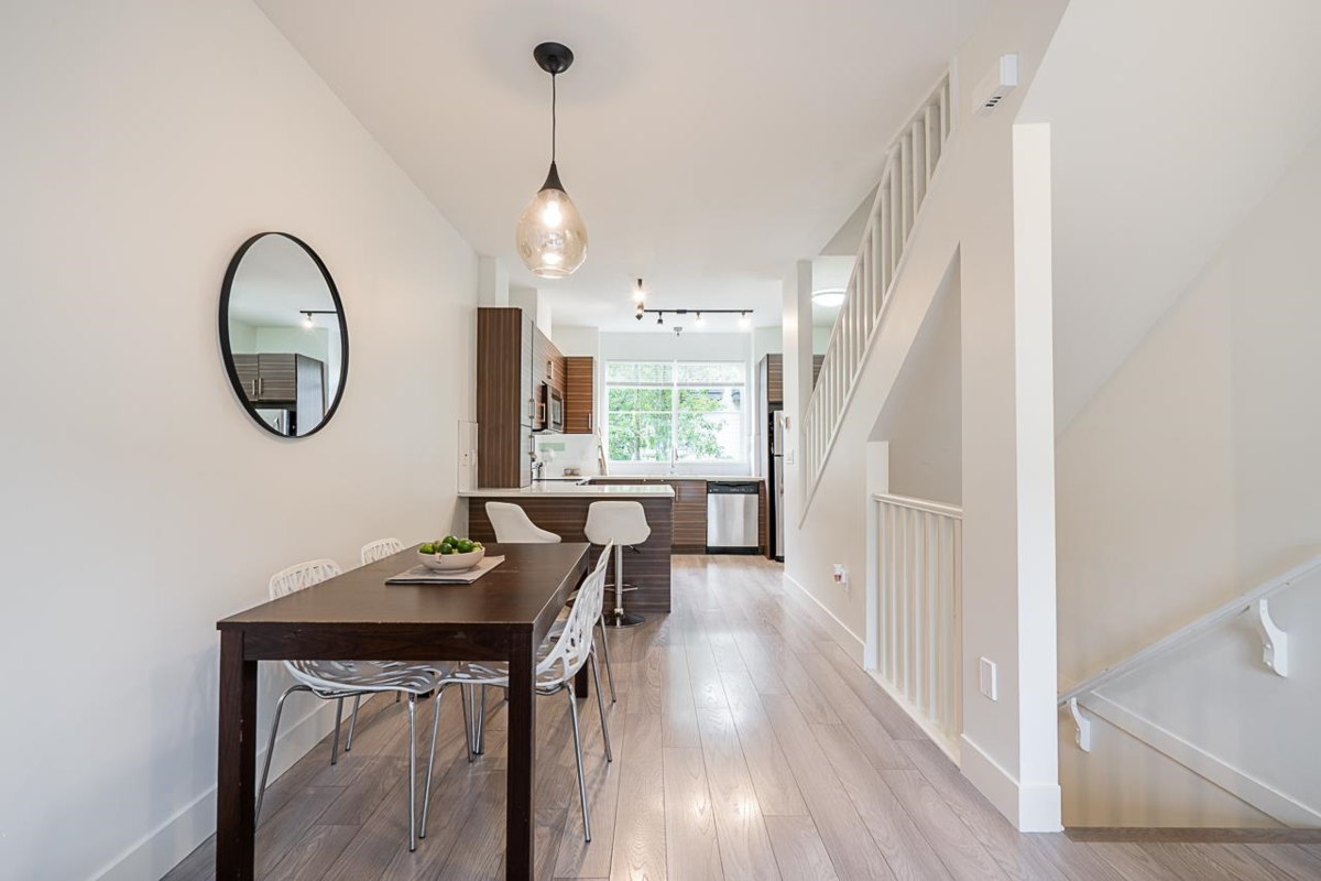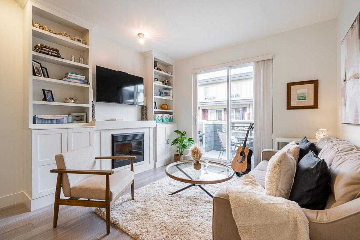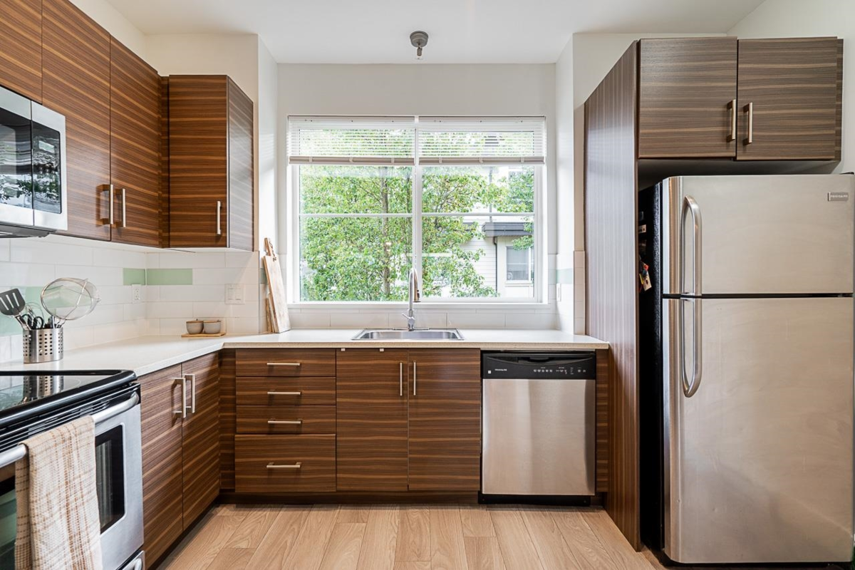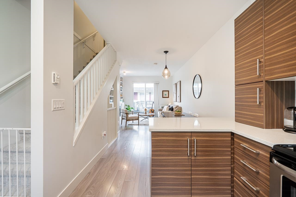 Turn key ready! No work to be done here it's been freshly painted & ready for you to move in! Over 1040SF of living space in this lovely 2 bedroom plus den home. The ground floor den is the perfect space for an office or small 3rd bedroom. There is adjoining 2pc bath & direct access to the garage. The main floor is open & spacious complete with a very nice custom built entertainment unit with a fireplace. Tons of kitchen cabinet storage space, quartz countertops, & SS appliances. The main also leads to a cozy deck, great for bbqs. Upstairs has 2 spacious bedrooms with the primary ensuite complete with a double vanity. This a great family neighbourhood & complex. Walk to all level of schools, amenities & transit. Plenty of parking as well with a single garage & an extra long parking pad.