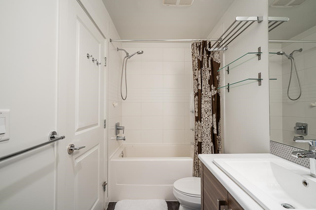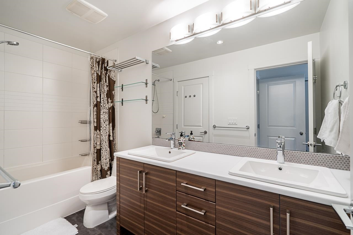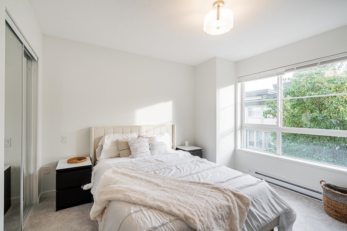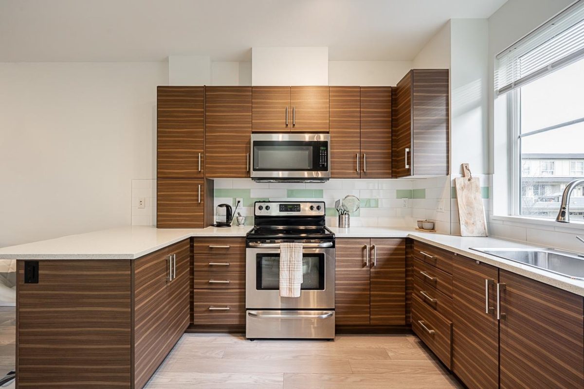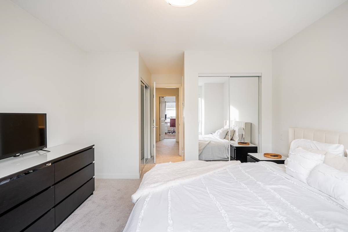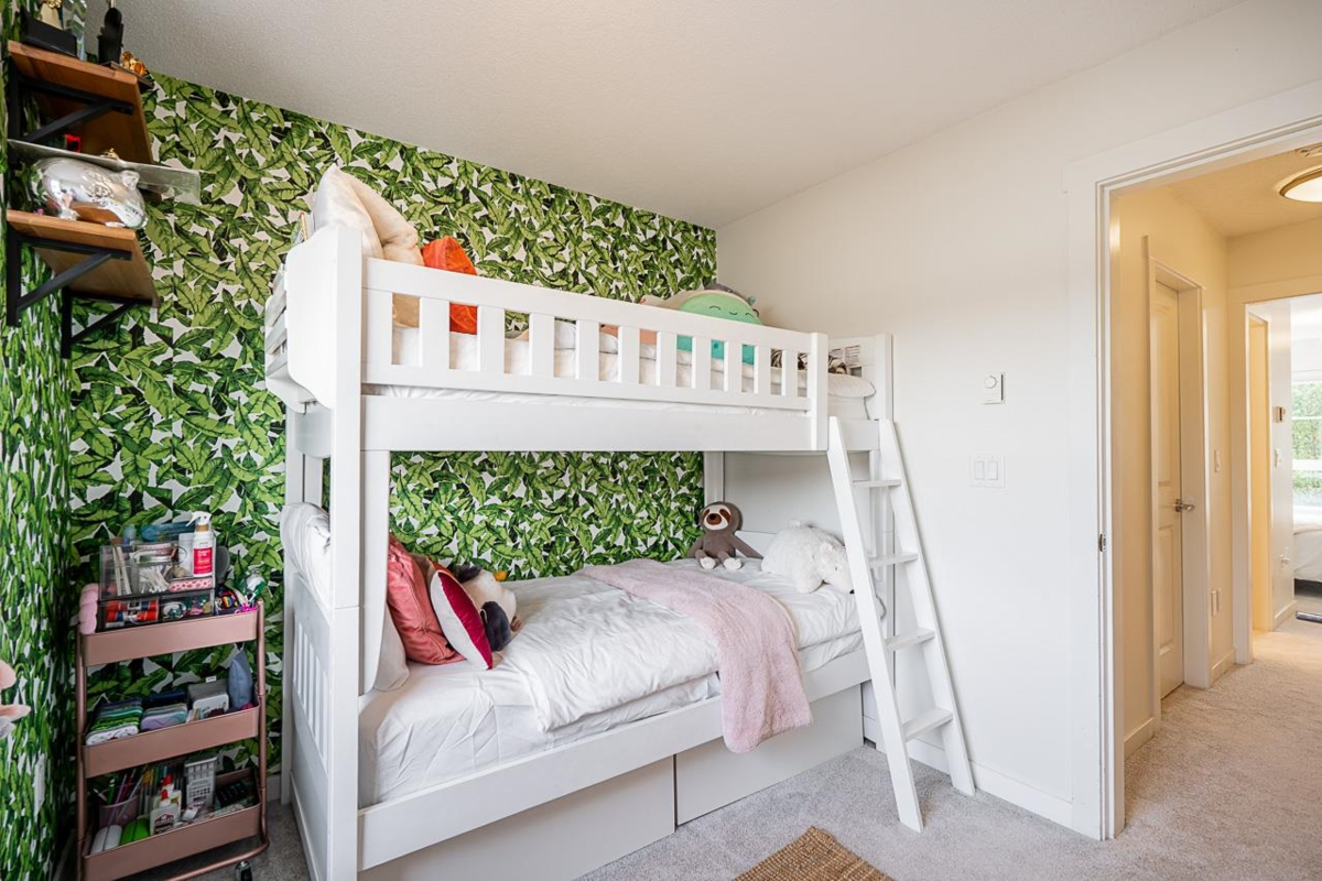Turn key ready! No work to be done here it's been freshly painted & ready for you to move in! Over 1040SF of living space in this lovely 2 bedroom plus den home. The ground floor den is the perfect space for an office or small 3rd bedroom. There is adjoining 2pc bath & direct access to the garage. The main floor is open & spacious complete with a very nice custom built entertainment unit with a fireplace. Tons of kitchen cabinet storage space, quartz countertops, & SS appliances. The main also leads to a cozy deck, great for bbqs. Upstairs has 2 spacious bedrooms with the primary ensuite complete with a double vanity. This a great family neighbourhood & complex. Walk to all level of schools, amenities & transit. Plenty of parking as well with a single garage & an extra long parking pad.
