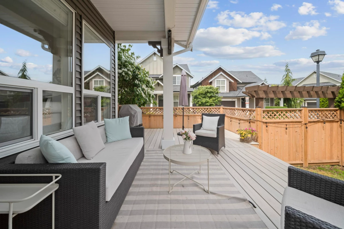 Ascot by Benchmark Homes. Quality. Convenience. Quiet in a busy world. Set in a private, virtually traffic-free enclave this 4-bed, 4-bath + office + den well-cared-for property sits at the serene farthest point from 211 St. You don't even know you're in a city! A rare corner, end property, this home provides you with more windows & sun on 2 sides and only one neighbour. Brand new $10K fence, $17K deck, h/w tank, garage shelving, huge farm sink in the stainless-equipped kitchen plus a custom arched office door, recent A/C & gas upgrades + river rock landscaping all add to the appeal of this beautiful family home. Massive rec room w/private rear access plus a bedroom & washroom allows for great play space + a potential in-law suite if desired. Just minutes to Bulpitt Elementary and LEC.