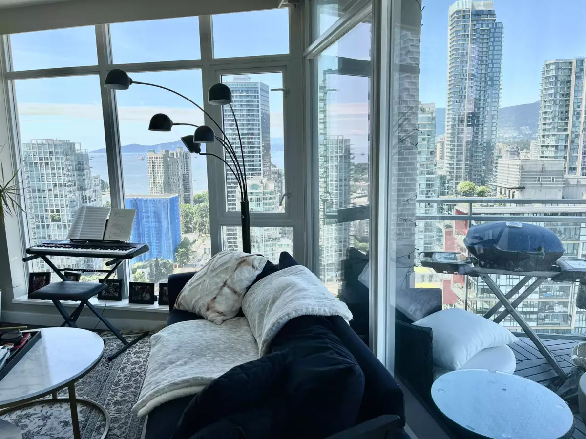 Prepared to be WOWed as you take in the PANORAMIC views of the Mountains, City and INCREDIBLE SUNSETS over English Bay from this AIR-CONDITIONED one bedroom and den city home. A perfect combination of luxury and convenience: modern finished, high-end stainless steel full sized appliances, concierge service, comprehensive fitness centre, outdoor pool, meeting rooms, steam/sauna and one parking. V Air B & B Friendly
