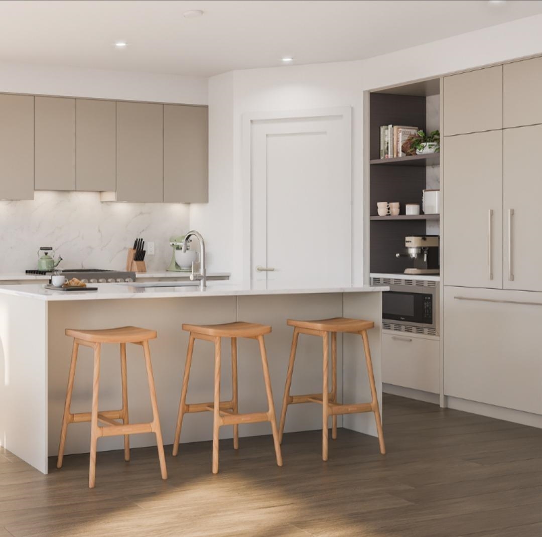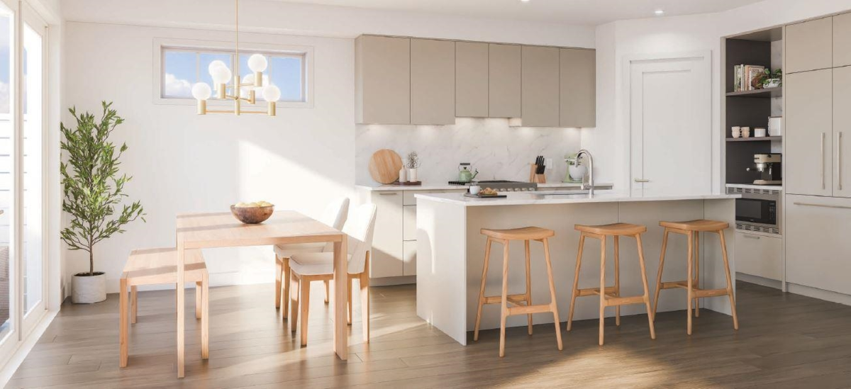 Westerly Row ~ This ½ duplex home is a rare sight in Southlands, which makes this extra special. In farmhouse style, this four-bedroom home welcomes you with pitched roofs, traditional shingles & a colourful front door. The living experience in this peaceful yet sociable neighbourhood is ripe for families, including their four-legged friends. The kitchen is anchored by a large quartz island & outfitted with Fisher & Paykel appliances, including a gas cooktop. A bedroom and full bathroom on the main floor offer flexibility with three more bedrooms upstairs. This is a pre-sale, move in Spring 2026!