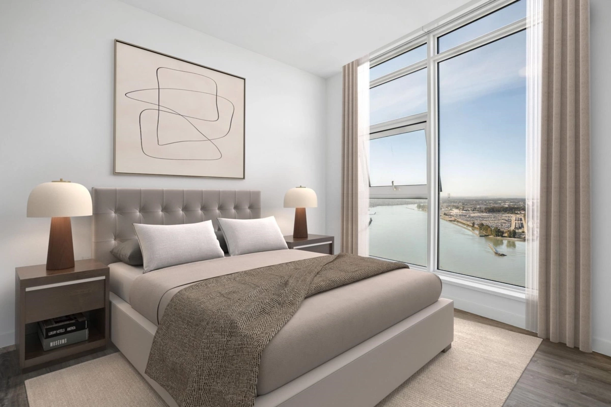WATERFRONT! Newly built 3 bed, 2 bath family home at Pier West by well respected Bosa. One of only a very few upper floor units that have become available in this layout. Enjoy sweeping Fraser River, mountain & city views. Sleek design w/ Bosch kitchen, waterfall island & bright living spaces flowing to 2 balconies, incld a private primary w/ spa-like ensuite. Drenched in good balance of NW light & has cooling for warmer days. Full concierge, gym w/ cardio loft, sauna/steam, bookable private dining room & a co working space. Just steps to boardwalk, SkyTrain, dining, shopping, & the conveniences of this central Lower Mainland location. 1 secure, EV installed parking spot, 1 large locker. GST has been paid. Plenty of visitor parking, pets & rental friendly. See VR tour! Some photos staged*