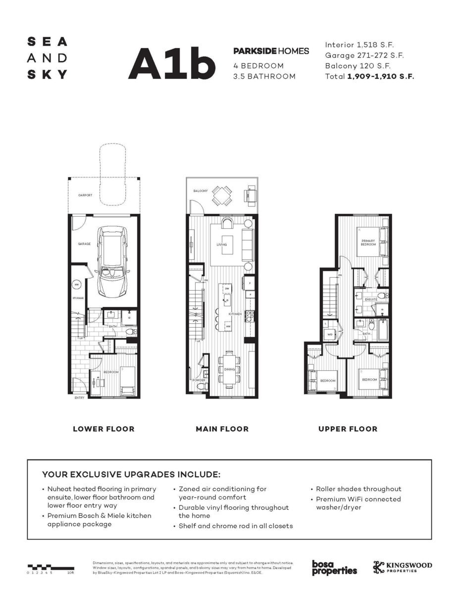 Presenting the final collection of Parkside Homes - the most sought-after location in the desirable SEAandSKY community by Bosa Properties & Kingswood Properties. Located along the shoreline community park, this 4 bedroom home has incredible views of the blind channel on one side and the Chief on the other. Premium upgrades include - air conditioning, Bosch & Miele appliances, heated entryways and ensuite washrooms, premium washer/dryer, vinyl flooring throughout and more. Steps away from the future 19,000 sq ft Activity Centre (under construction, completing summer 2026) and pedestrian bridge to downtown. The bridge is nearing completion! Mortgage buy down offer available for a limited time. Reach out to our team for more details.