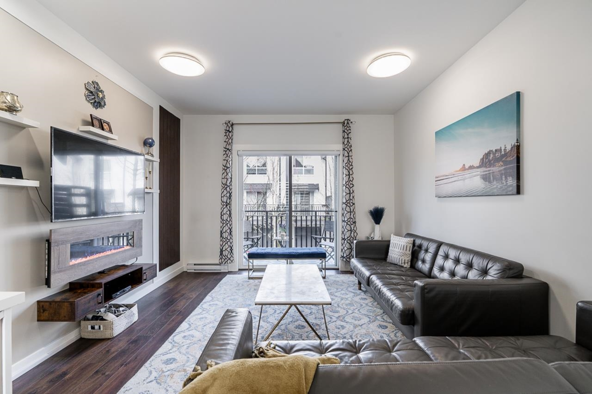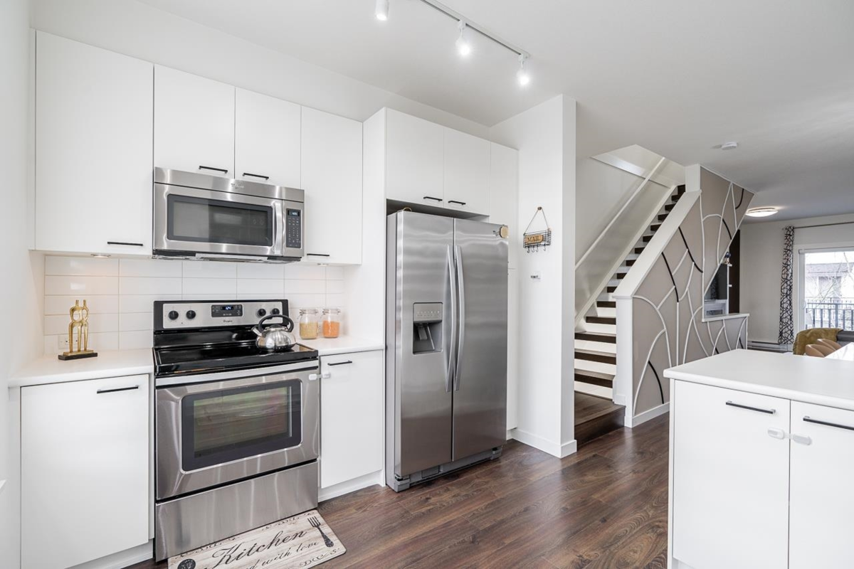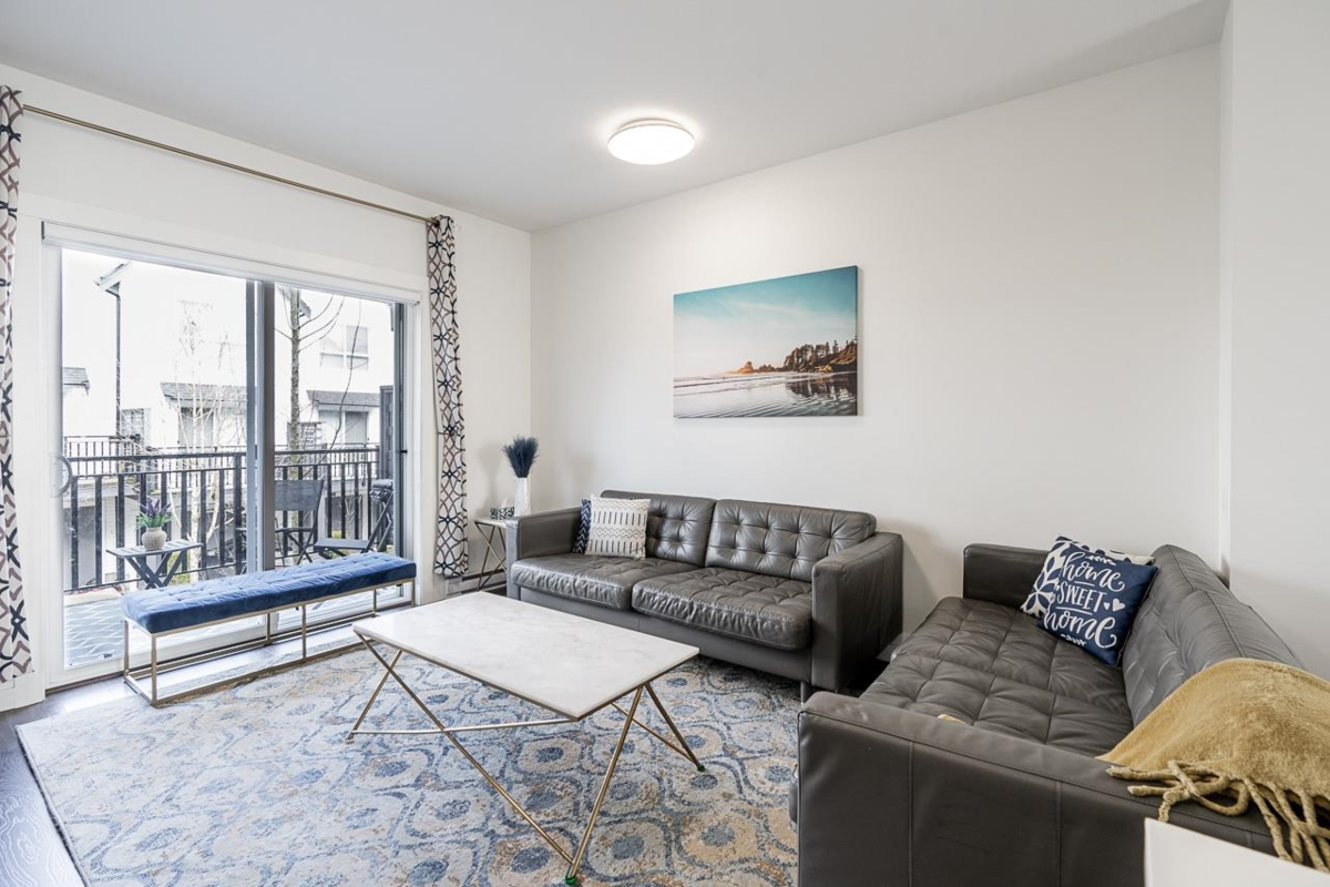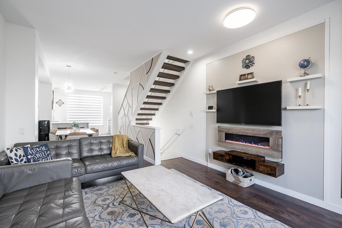 Welcome to CLAYTON MARKET! This stylish 2-bedroom + den, 3-bath home blends modern design with unbeatable convenience. The main floor features open-concept living, in-suite laundry, a powder room, and a versatile den that can serve as a 3rd bedroom or home office. Enjoy a sleek floating staircase, a designer kitchen with stainless steel appliances, pantry, and a spacious primary suite with three closets. Outdoor living shines with a private deck and fenced yard. Steps to schools, parks, Tim Hortons, shops, banks, transit, and the future SkyTrain station. Recent upgrades include zebra blinds, fresh paint, LED lighting, new carpet, laminate flooring, electric fireplace feature wall, and a new Samsung fridge. Immaculate condition, bright, and move-in ready—this one truly stands out!