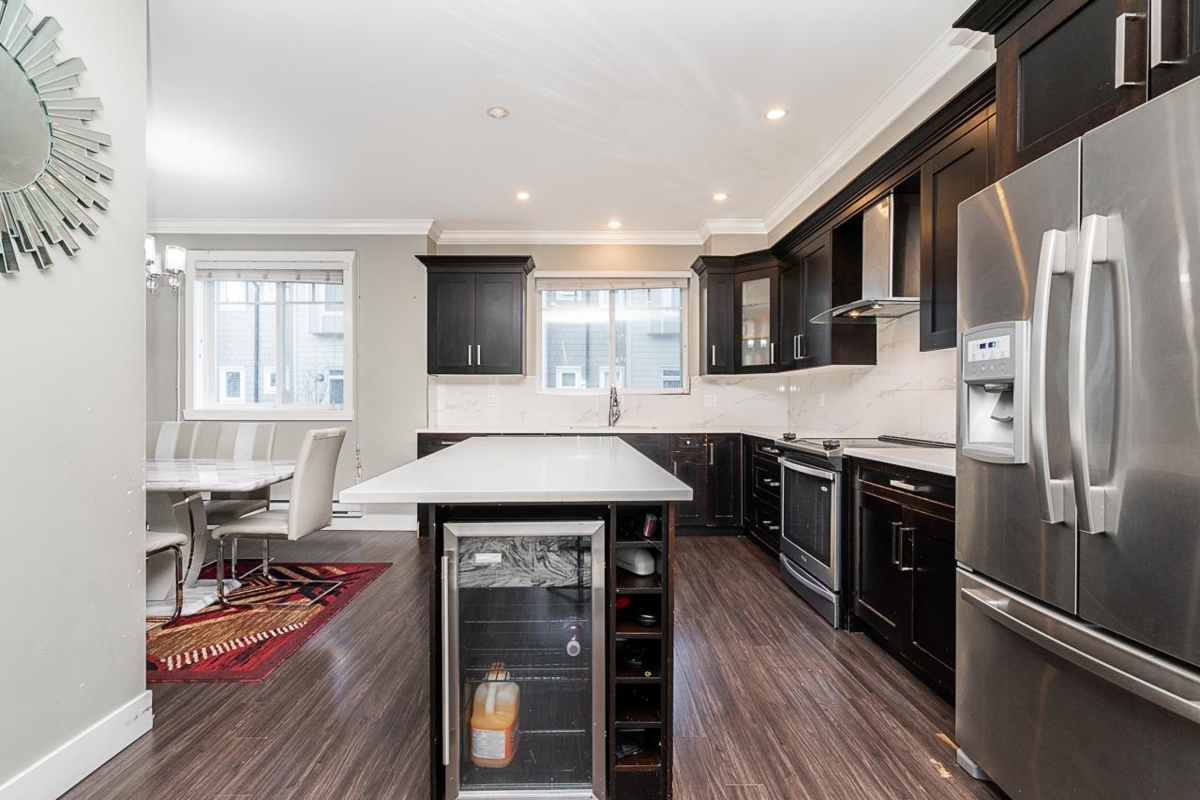 Welcome to the highly sought-after "Aria Living" complex, where this stunning townhouse offers the perfect blend of style and functionality. Featuring 4 bedrooms and 4 bathrooms, including a bonus bedroom with its own ensuite on the main floor, this home is designed for modern living. The bright south-facing layout fills the space with natural light, complemented by an open-concept design, crown moldings, and laminate flooring. The gourmet kitchen boasts a large island, quartz countertops, and stainless-steel appliances, flowing into the living room with a cozy fireplace. The master bedroom offers a private ensuite, while the balcony and deck provide outdoor spaces for relaxing or entertaining.