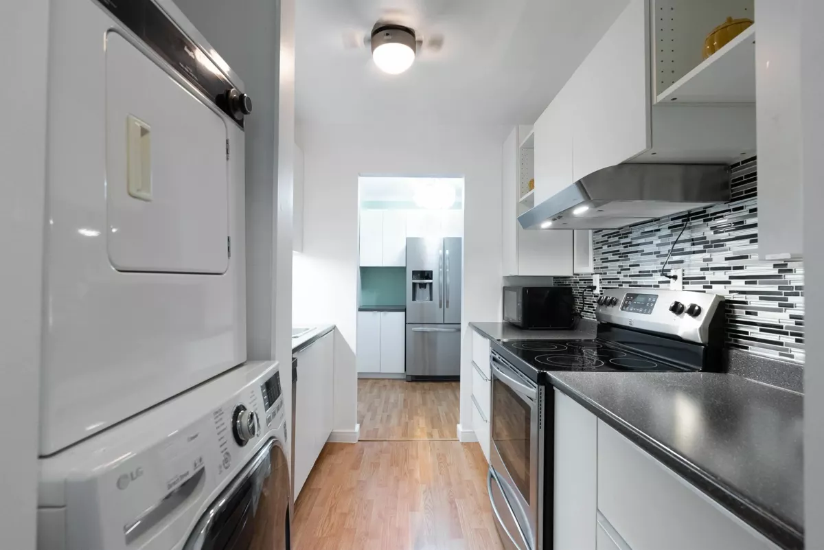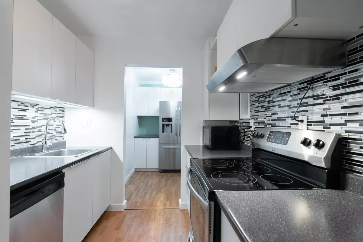 LOCATION, SPACE & UNBEATABLE VALUE! This North facing 2-bed, 1-bath unit shines with a spacious layout, new appliances, updated kitchen & bathroom, new windows & faces a tree-lined green space for added privacy. HUGE primary bedroom with walk-in closet and cheater ensuite! PLUS: rare IN-SUITE LAUNDRY, parking, locker in a well-kept complex. Roof replaced (2009), elevator upgraded (2017), exterior rain screening with new windows (2018/2024). Tucked away on a quiet cul-de-sac. Steps to Lougheed Mall, Skytrain, parks, tennis, shopping, and restaurants Lougheed Town Centre & Skytrain, Costco, H Mart, Keswick Park, SFU and more—plus quick Hwy 1 access. SCHOOL CATCHMENT: Cameron Elementary & Burnaby Mountain Secondary. Don't wait—this affordable gem won’t last!