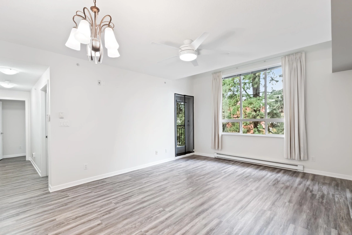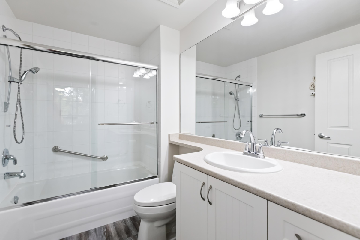 Stunning, renovated Top Floor home in Fleetwood Gardens a 55+ centrally located building.2 bedroom + den, with 2 full bathrooms, in-suite laundry, secure parking for 1 vehicle, boasting over 1000 sqft of functional living space. Natural light fills this North facing home with 9 foot ceilings and large windows overlooking trees for a picturesque setting. Home in immaculate condition with recent upgrades including vinyl plank floor, lighting, kitchen/bathroom cupboards, quartz counter tops, newer appliances including induction stove! Large primary bedroom with his & hers closet and ensuite with tub. Relax & enjoy mountain views from your large covered patio. Just minutes walk from Fleetwood Community Centre, parks, grocery stores, restaurants, and transit. Quick Possession possible!