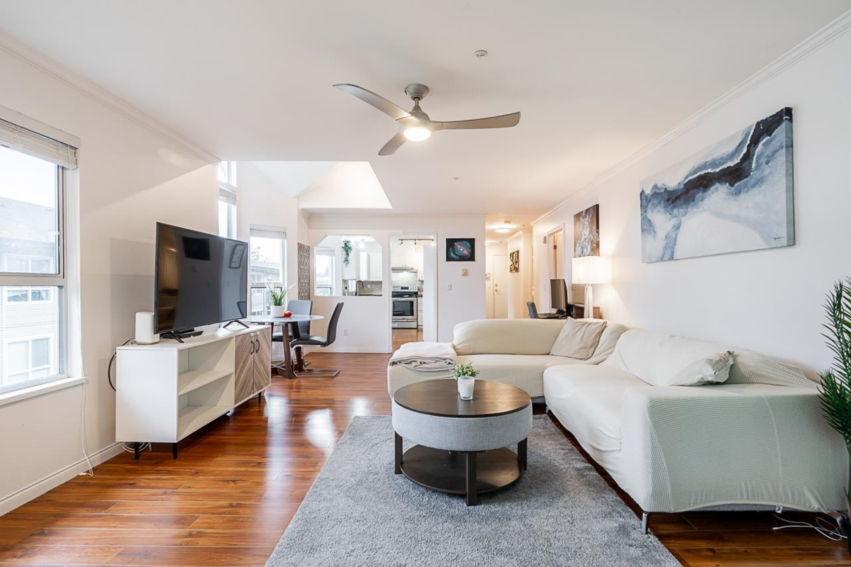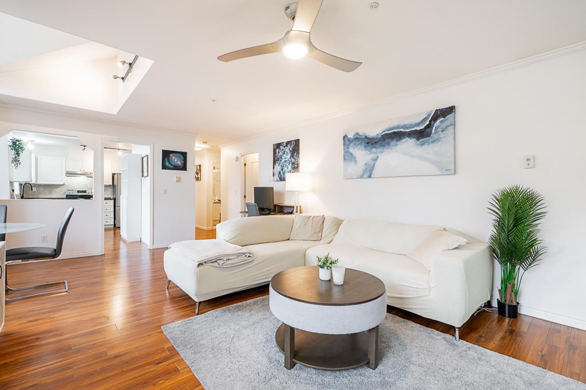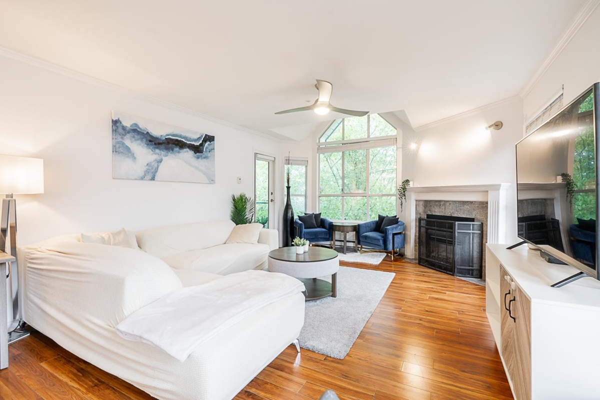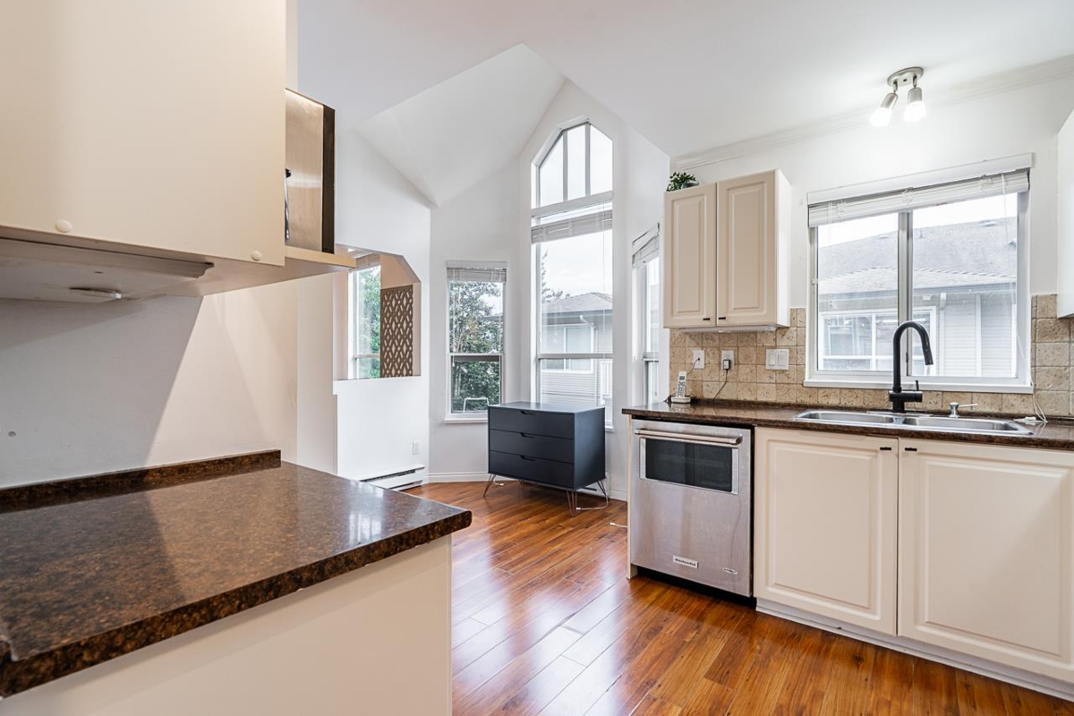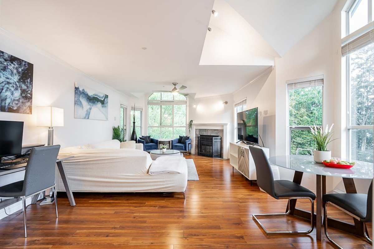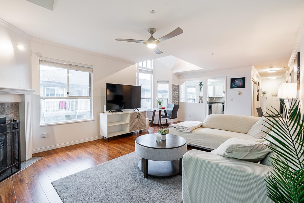 Welcome to Cambridge Court, a spacious top-floor corner home offering 1,228 sq. ft. of bright and airy living. Vaulted ceilings and oversized windows fill the space with natural light, while the east-facing balcony is perfect for your morning coffee or relaxing after work. This well-maintained 2 bedroom, 2 bathroom layout features a generous living and dining area, cozy gas fireplace, full-size laundry room, and heated bathroom floors for year-round comfort. The proactive, well-managed strata includes gas and hot water in your maintenance fee. Ideally located within walking distance to shopping, restaurants, parks, and transit, just minutes from the future SkyTrain station. One secure underground parking stall included. Move-in ready, book your private tour today!
