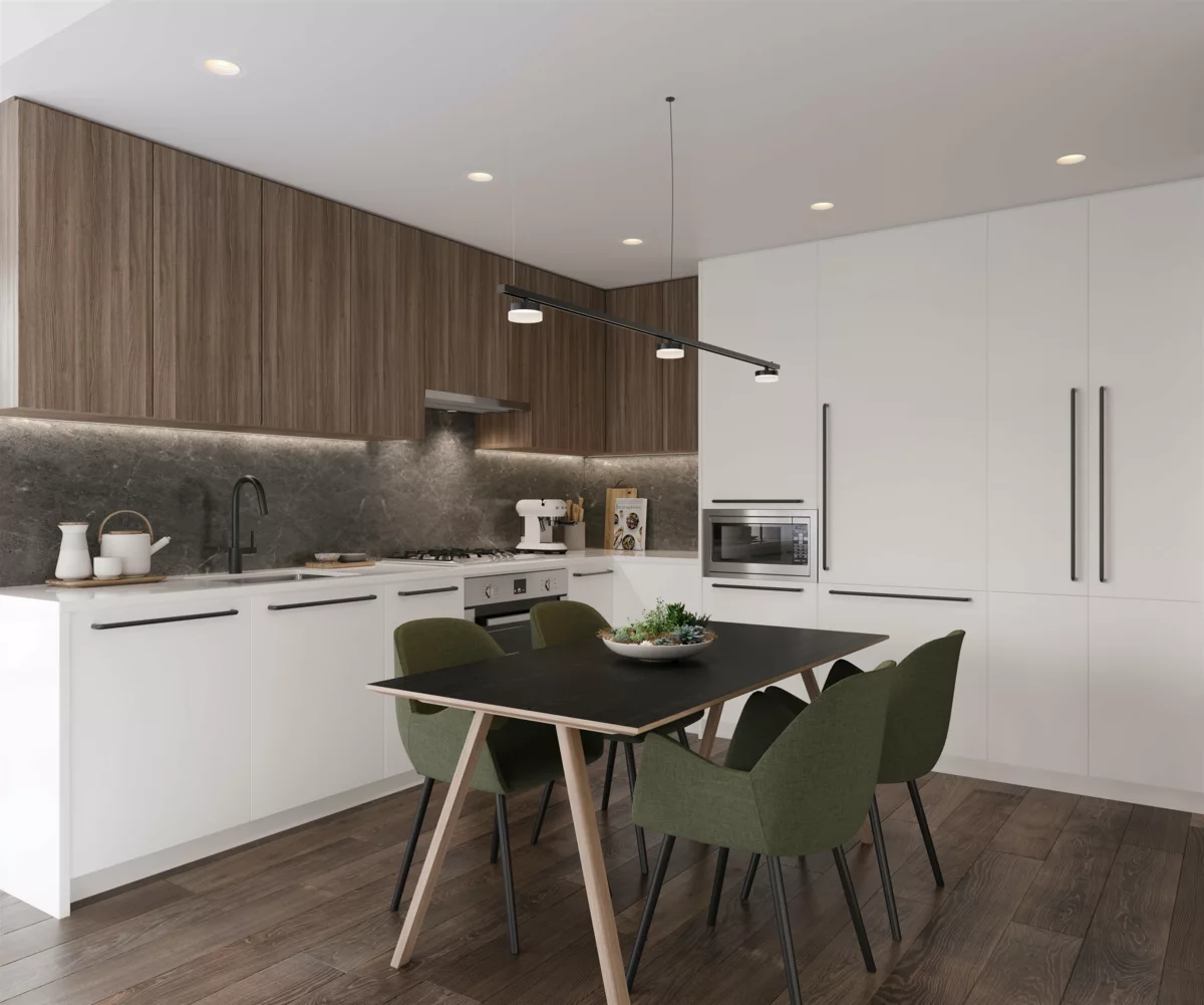 Band by Townline is a 45-storey tower in vibrant West Coquitlam, boasting resort-inspired amenities and bold architecture. This versatile 2-bed+lock-off offers separate entry, dual glazed windows, two balconies, and laminate flooring. The 2-bed portion includes a well-equipped kitchen with integrated appliances, quartz countertops, and large format porcelain backsplash. The studio suite features a spacious closet and full bathroom. Enjoy over 27,000 sq ft of amenities including an outdoor pool, gym, yoga studio, dog run, garden plots, music room, spa, concierge, guest suites, and a curated penthouse amenity level with games lounge, chef's kitchen, and outdoor areas with fire tables and BBQs, all showcasing stunning views.