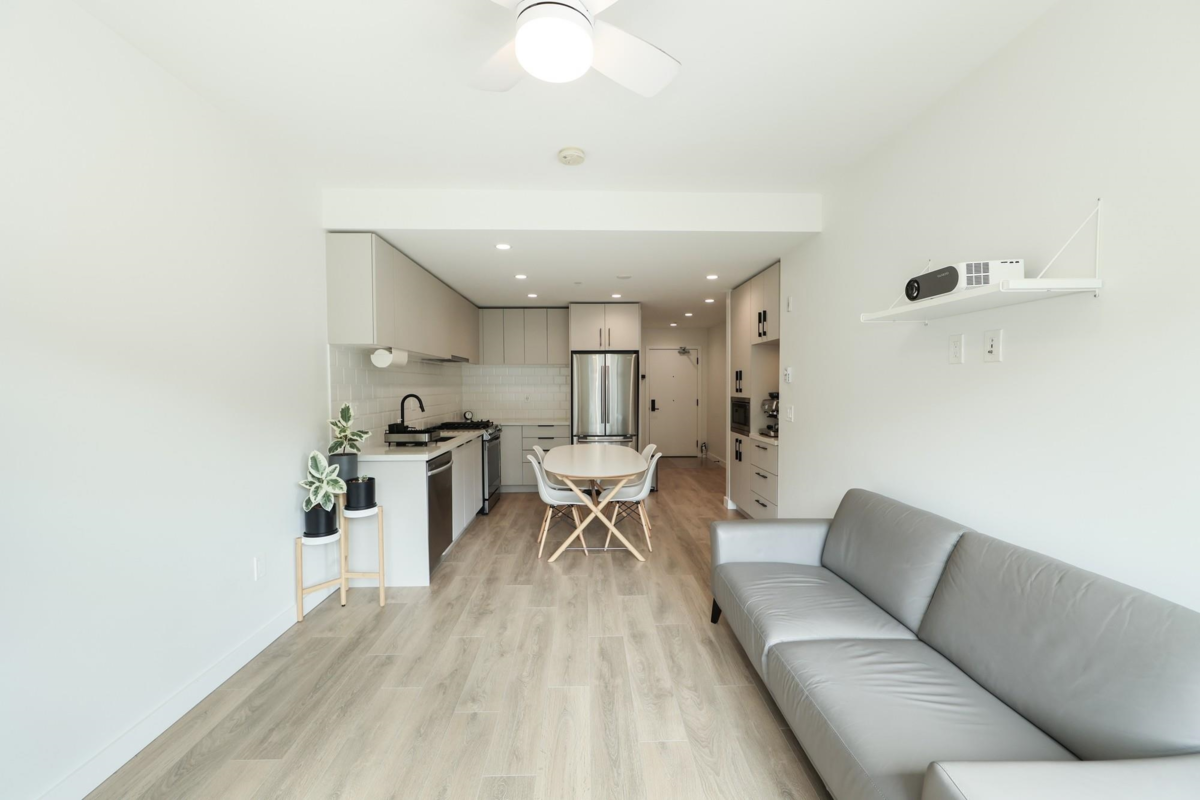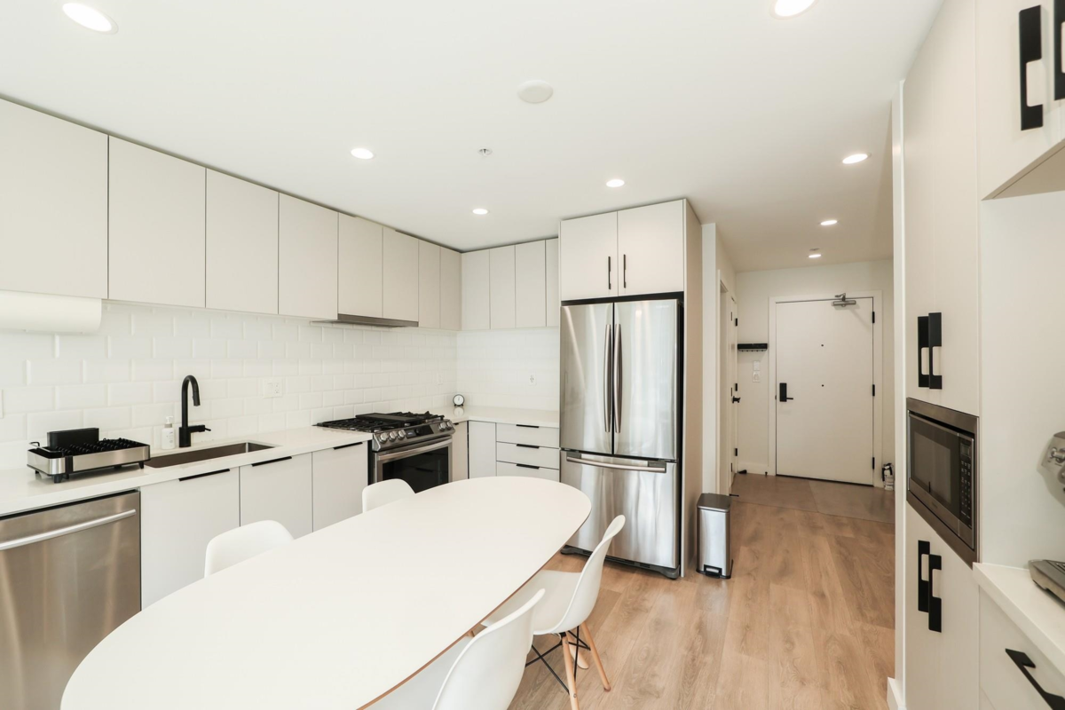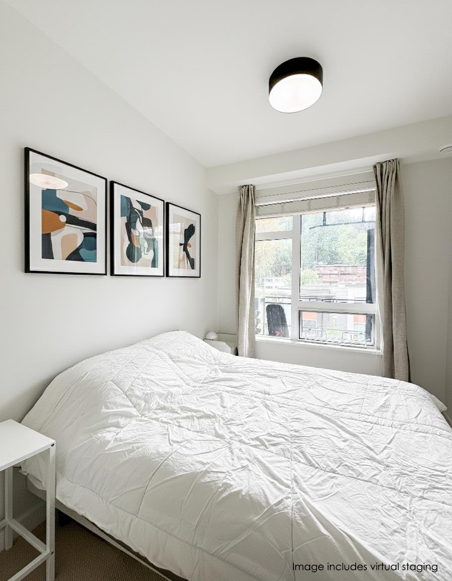 Welcome to George by Marcon in the heart of Port Moody! This bright south-facing 1 bed + large den, 685 SF (excluding balcony) home boasts 9' ceilings, large windows, and balcony. The open layout features a modern kitchen with stainless steel appliances, gas range, quartz counters, and sleek cabinetry. The versatile den works as a home office, guest room, or nursery. Amenities include a social lounge, courtyard, playground, work/hobby room, bike room, and car/pet wash stations. Steps to Moody Centre SkyTrain, West Coast Express, Rocky Point Park, Brewers Row, shops, schools, and trails. Includes 1 parking and 1 spacious storage. Pets and rental friendly!