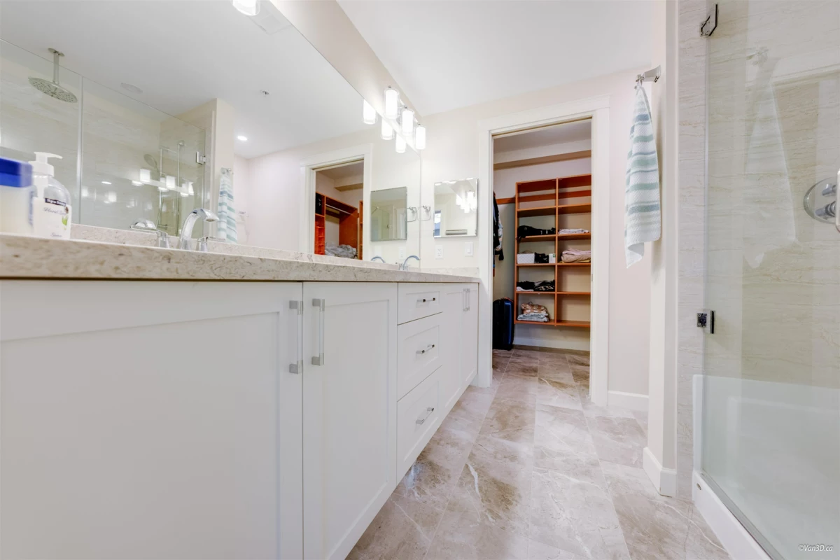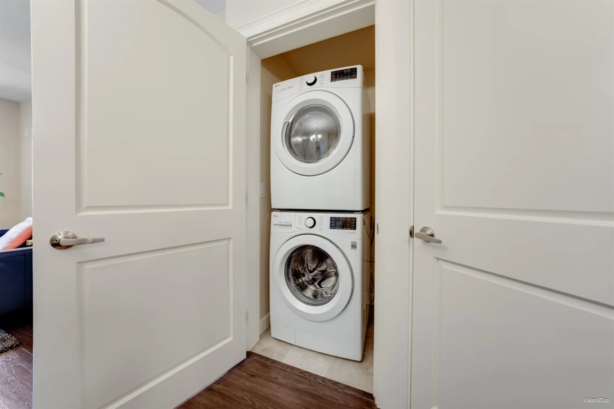 Quality built by QUADRA HOMES, this courtyard facing 2 bedroom + den unit features Double Master layout, both bedrooms with own walk-in closet and ensuite. AC/heat pump with individual AC units in each room. High end kitchen: 5 burner gas stove, double oven and quartz counter-tops. Radiant heated bathroom floors. Laminate hardwood floor throughout the unit. Electric fireplace, built-in wall safe. Fully covered glass Solarium can be used all year round, a big bonus of 134 SF Solarium/Deck space. 2 parking stalls, one is EV ready with 40amp outlet. Large storage locker with rolling gate located directly at the parking spot. A short drive to Crescent Beach, shops and schools, easy access to HWY 99. Don't miss this wonderful property, book your viewing. Open house on Sunday Nov 23 @2-4PM.