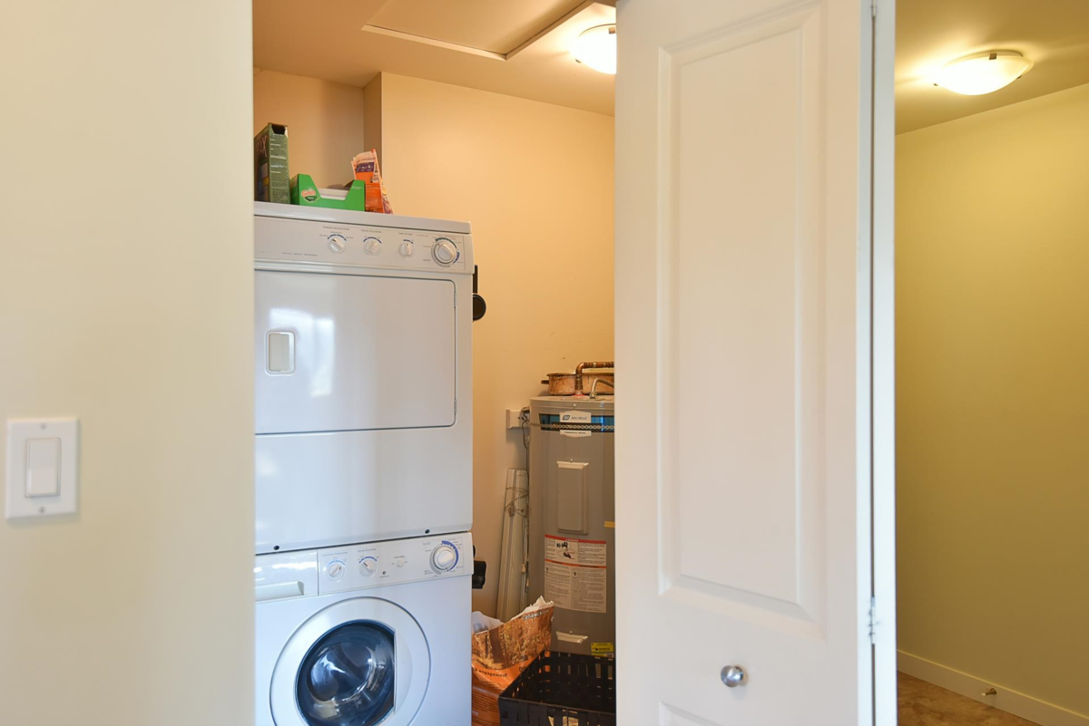 Tons of natural light in this top-floor corner unit with two bedrooms, an airy open plan and a cozy gas fireplace. The modern kitchen features stainless steel appliances, while in-suite laundry adds convenience. With no one above and only one neighbor beside, privacy is assured. The west-facing sundeck captures sunsets and being a corner unit the extra windows enhance the bright, inviting feel. In a prime downtown location, just steps to shops, dining and public transit. Rentals allowed and pets allowed with restrictions.