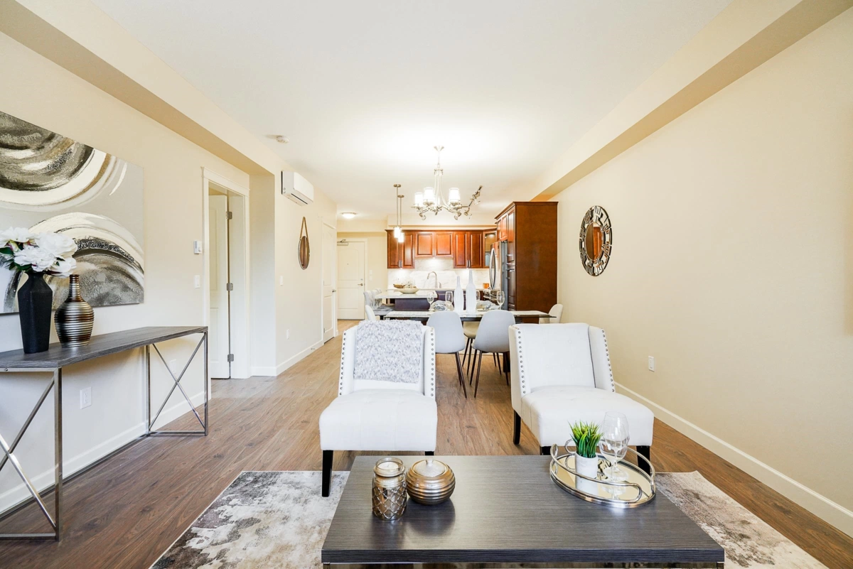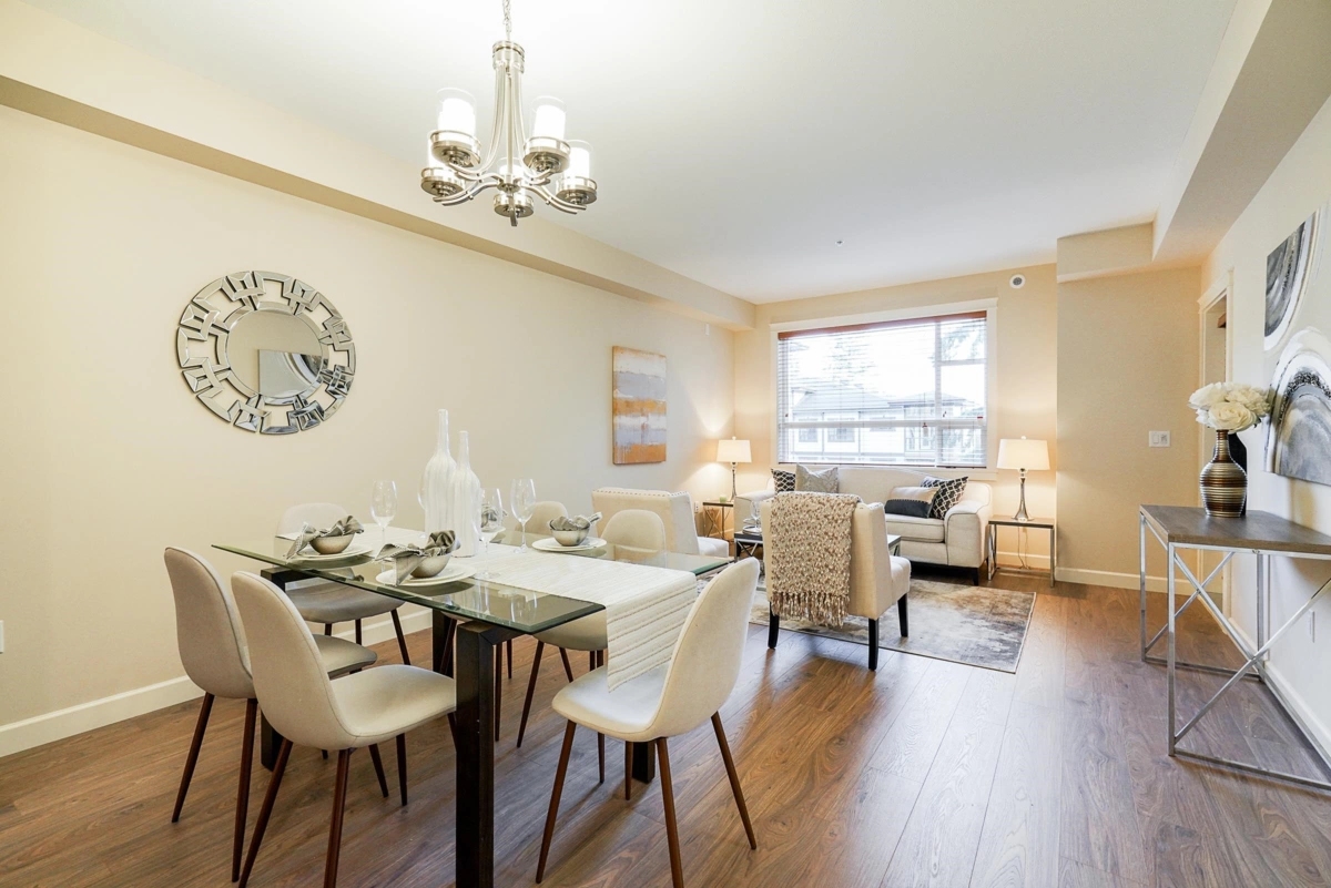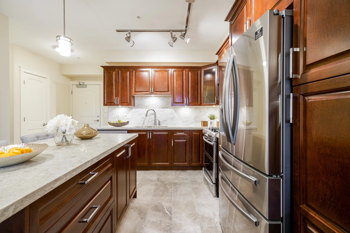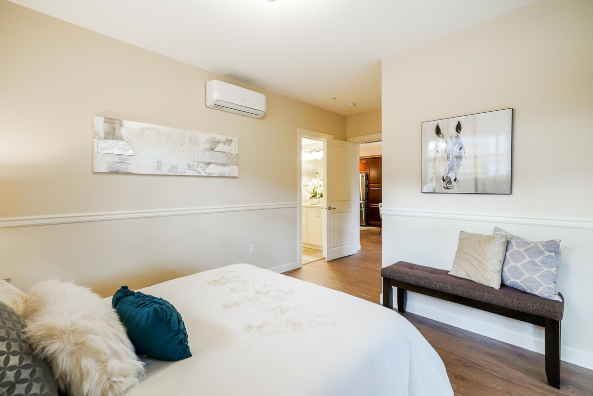 Well-Priced!This bright and spacious 1,119 sq. ft. with 240 solarium. CORNER UNIT offers 3 generous bedrooms and 2 full bathrooms, featuring heated tile floors, heated mirrors, and a frameless glass shower with a rainfall head. The master suite includes a walk-in closet with a custom wood organizer and a 4-piece ensuite with double sinks. The gourmet kitchen boasts stainless steel appliances, a 5-burner gas cooktop, and dual electric convection ovens. Expand your living space with the 211 sq. ft. solarium, featuring retractable glass panels and a BBQ hookup. The unit comes with 2 oversized parking spots, one is handicap-sized and an extra-large storage locker. Ideally located near South Surrey Park & Ride, with quick access to Hwy 99, the pier, top schools. Call today.