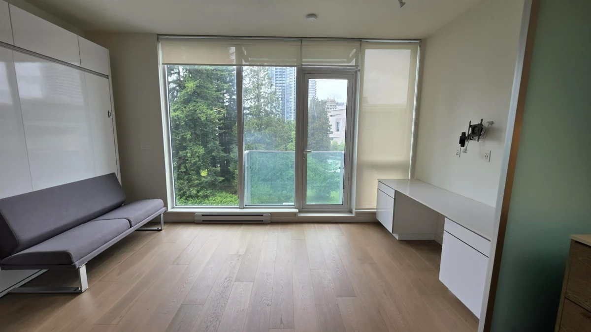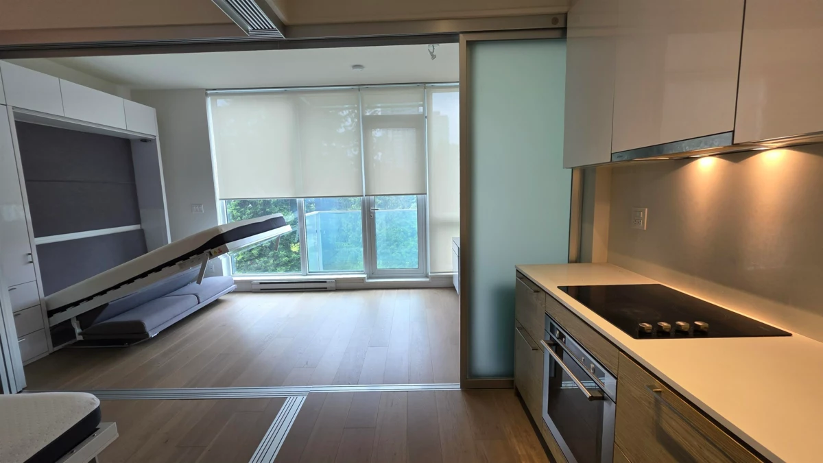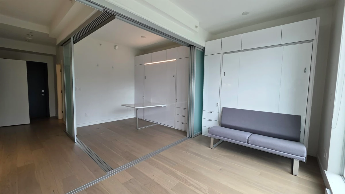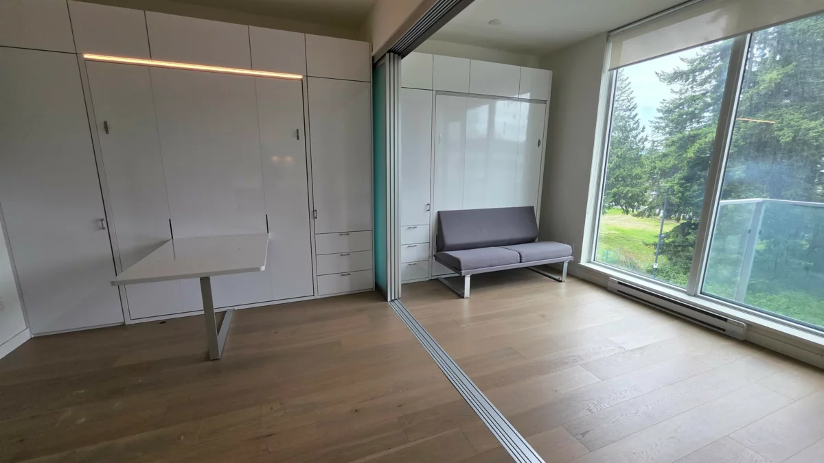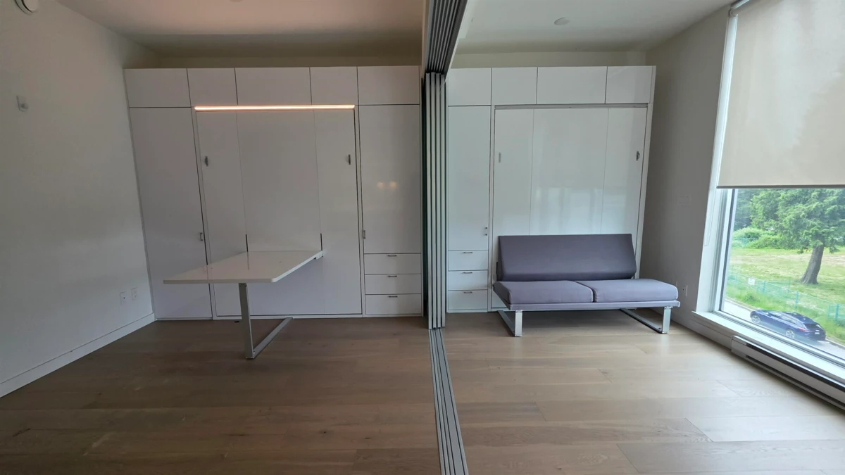 Located just steps from the SkyTrain, SFU, and KPU campuses, this smartly designed unit offers exceptional convenience and modern living. The suite features stainless steel appliances, two pull-out Murphy beds, a built-in pull-out dining table, and a sofa – all designed to maximize space and functionality. A sliding partition allows you to convert the layout into two bedrooms as needed. Enjoy upscale finishes including over-height ceilings, engineered hardwood flooring, high-efficiency Low-E windows, custom roller blinds, and built-in LED lighting. Amenities include a fully equipped gym, yoga studio, massage room, sauna/steam room, entertainment lounges with kitchen, business center, study room, and a rooftop patio with a garden oasis. Comes with 1 storage locker.