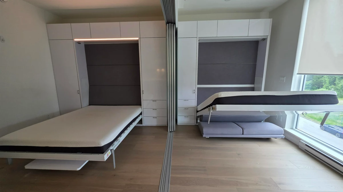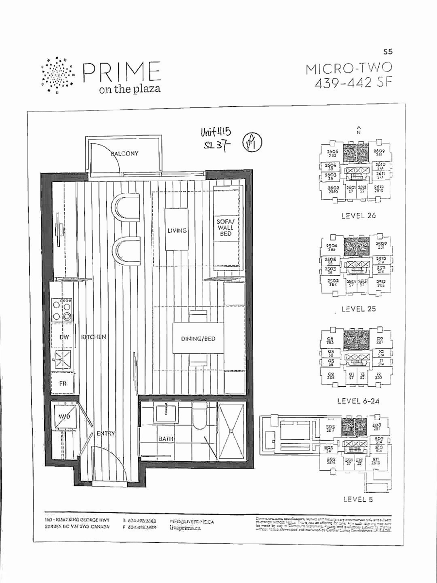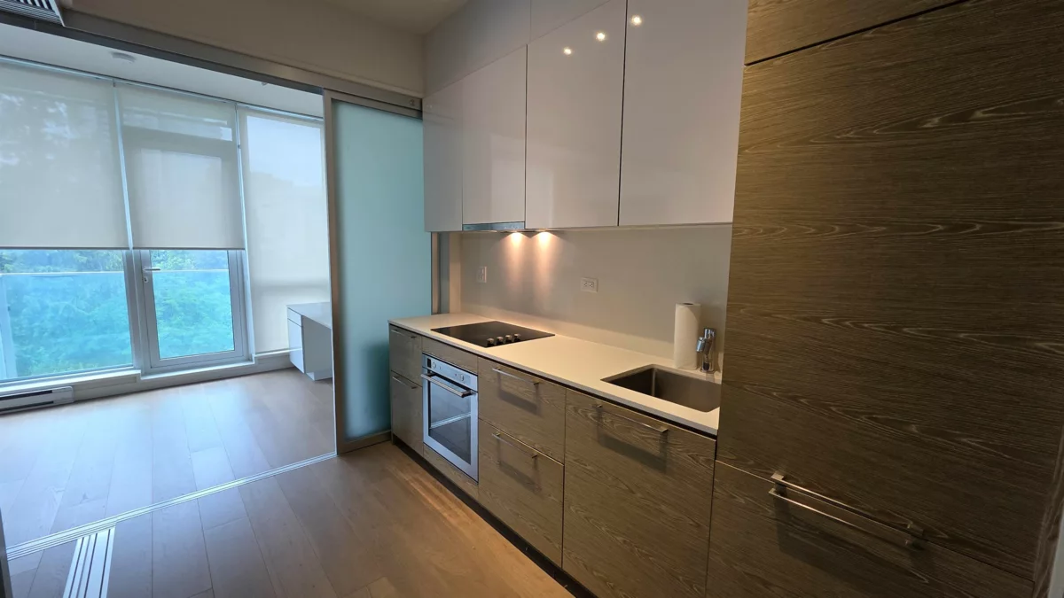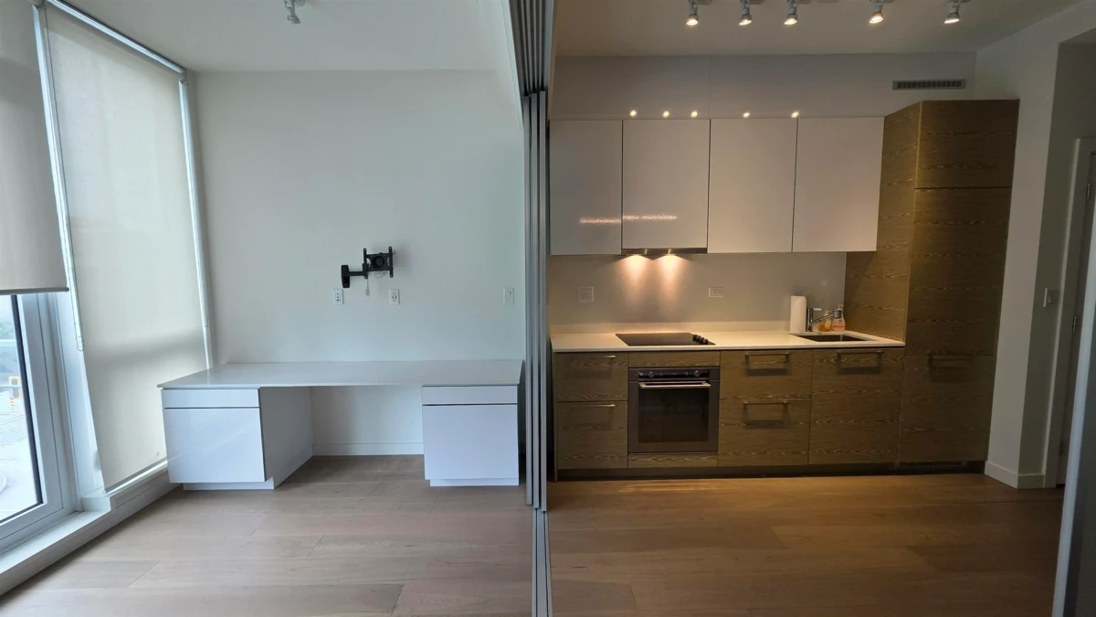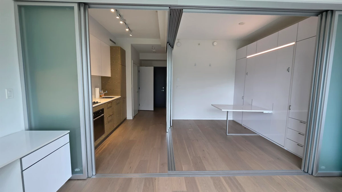 Located just steps from the SkyTrain, SFU, and KPU campuses, this smartly designed unit offers exceptional convenience and modern living. The suite features stainless steel appliances, two pull-out Murphy beds, a built-in pull-out dining table, and a sofa – all designed to maximize space and functionality. A sliding partition allows you to convert the layout into two bedrooms as needed. Enjoy upscale finishes including over-height ceilings, engineered hardwood flooring, high-efficiency Low-E windows, custom roller blinds, and built-in LED lighting. Amenities include a fully equipped gym, yoga studio, massage room, sauna/steam room, entertainment lounges with kitchen, business center, study room, and a rooftop patio with a garden oasis. Comes with 1 storage locker.