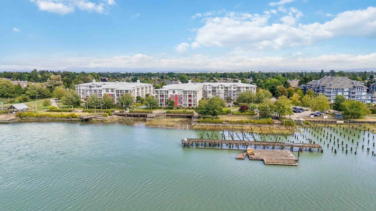 Experience waterfront living in the heart of Steveston South at the sought-after Copper Sky. This nearly 1,100 sq ft 2-bedroom plus den home offers views of the Fraser River and gives you direct access to the boardwalk and access into Steveston Village. Vaulted ceilings in the living area, 9-foot ceilings throughout, and an expansive balcony create a bright, open feel. The open kitchen offers granite counters, gas cooktop, stainless appliances, and hardwood floors. With shops, restaurants, the Community Centre, and Village amenities just steps away, this home combines resort-style comfort with everyday convenience. 1 secured parking and 1 storage locker. This home is tenanted; No interior photos will be posted.