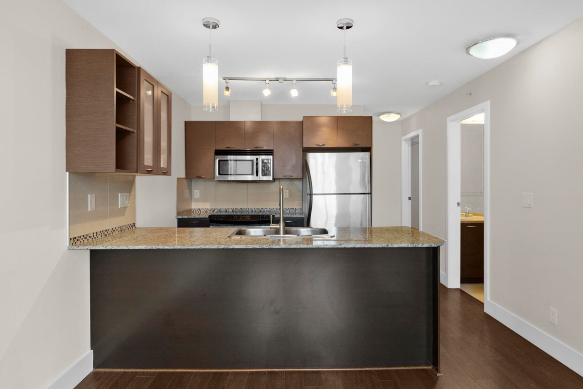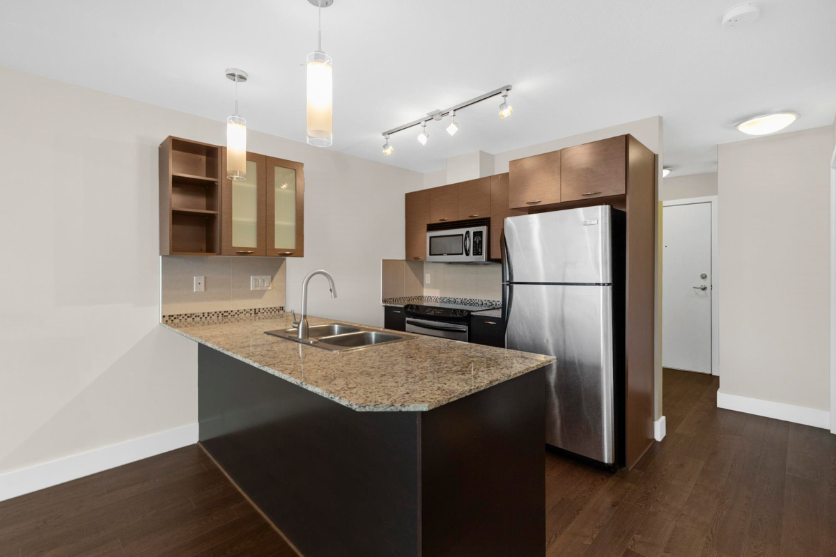 Top floor west facing unit with vaulted ceilings and big windows bringing in lots of natural sunlight to enjoy. This is a 1 bedroom and den with 1 full bathroom in very nice overall condition. The kitchen has granite countertops and an eat up bar. All appliances include over the range microwave. Appreciate the in suite laundry, electric fireplace and hot water included. 1 parking stall and storage locker. Pet and rental friendly no age restriction. Enjoy the billiards room on the 2nd floor, the fitness facility on the first floor and book one of the guest suites for friends or family located on the 3rd and 4th floors. Only a 3 minute drive to the freeway and 5 minutes to the University or hospital & cancer clinic.
