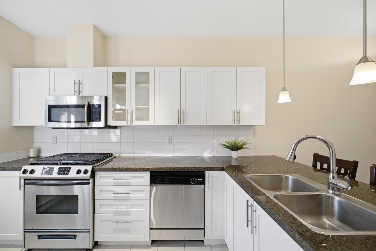 Soul of Guildford, Renovated 2 levels, 2 bedrooms, 2 baths, large patio area & move-in ready unit with 1 big locker & 2 secured parkings. Super quiet inside unit with no neighbor above nor below. Stainless steel appliances, granite kitchen counter, all new kitchen cabinet doors & new laminated flooring at 2nd floor. NO carpet!!! Walking distance to Green Timbers Urban Park, Guildford Mall, T&T Supermarket and Canadian Superstore, Wal-Mart, Landmark Cinemas, Elementary & high school 5-10 minutes walking distance. Great school catchment. Monthly strata fee includes hot water and gas. Openhouse Nov. 2nd Sunday 1:30 -3:30 pm.