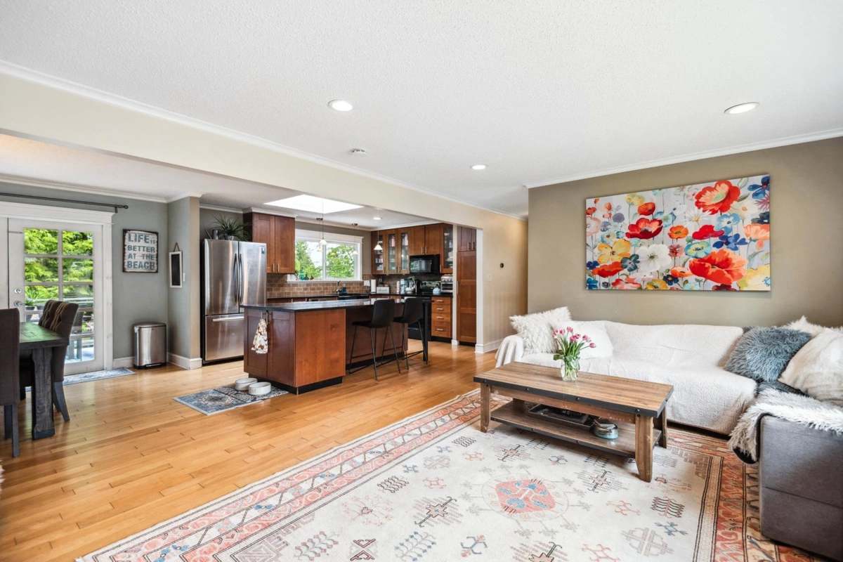 Ideally located in Upper Lynn, this 5-bed, 3-bath home offers nearly 2,200 sq/ft of family-friendly living, including a separate 1-bed suite. The main floor features over 1,300 sq/ft with an open-concept kitchen, wood shaker cabinets, stone counters, stainless appliances, skylight, and island seating. A spacious living room with gas fireplace and French doors opens to a 400 sq/ft deck with hot tub and treed outlook. Three bedrooms and two updated baths, including a primary with ensuite, complete this level. Downstairs includes a fourth bed or rec room with garage access and a 1 bdrm suite with private patio—easily reintegrated if needed. Set on an 8,000+ sq/ft lot with fenced yard, grassy play areas, and room to grow. Steps to Upper Lynn Elementary, trails, and Lynn Valley Centre.