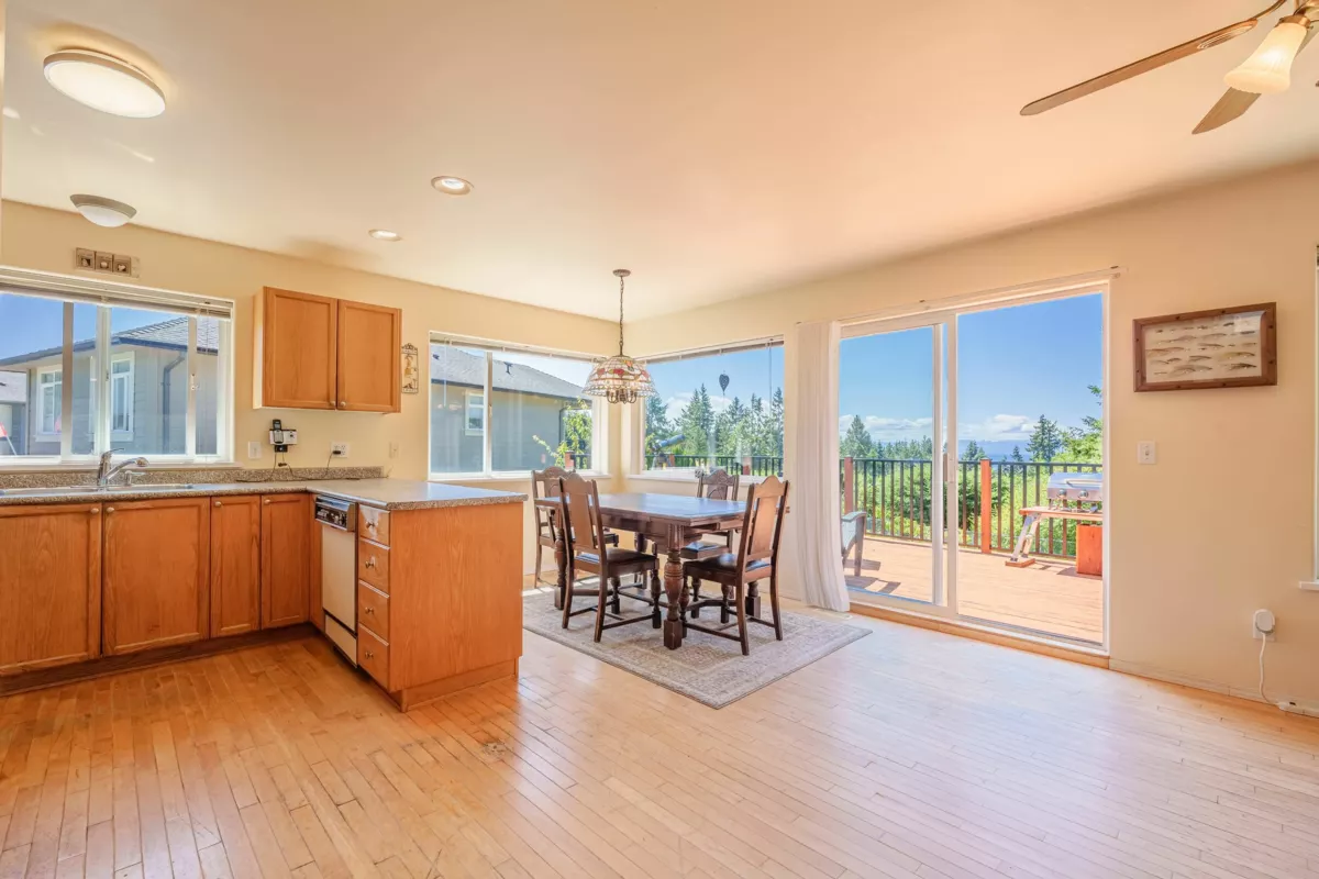 View home in Davis Bay Estates on a 1/4 acre lot and quiet cul-de-sac with private level fenced yard. Producing fruit orchard, new deck to soak in the view off the main living area and sliding doors. Open living area and natural fireplace. Lower level is a cool place with a covered patio, possible suite option with level separate entry, bonus office area and double garage. Private gate leading to the school, beach, restaurants, shops and many trails.