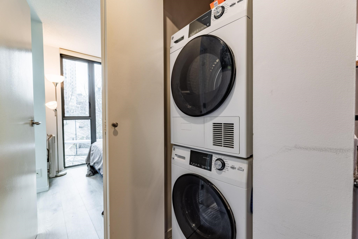 Fantastic Building in an amazing location at "The Pointe". Come and view this well-laid out unit, which has a bright and spacious one-bedroom and an office that could double as a second bedroom with a peek-a-boo view of Coal Harbour! Open kitchen and living room with Newer laminate floors, newer washer, condensing dryer, Stainless Steel Fridge, stove, and dishwasher. The building features a Gym, party room, business center, bike locker, concierge, and visitor parking available. Central location close to seawall, Stanley Park, Coal Harbour Park and Playground, and the business district. This unit comes with one parking spot and a large in-unit storage room.
