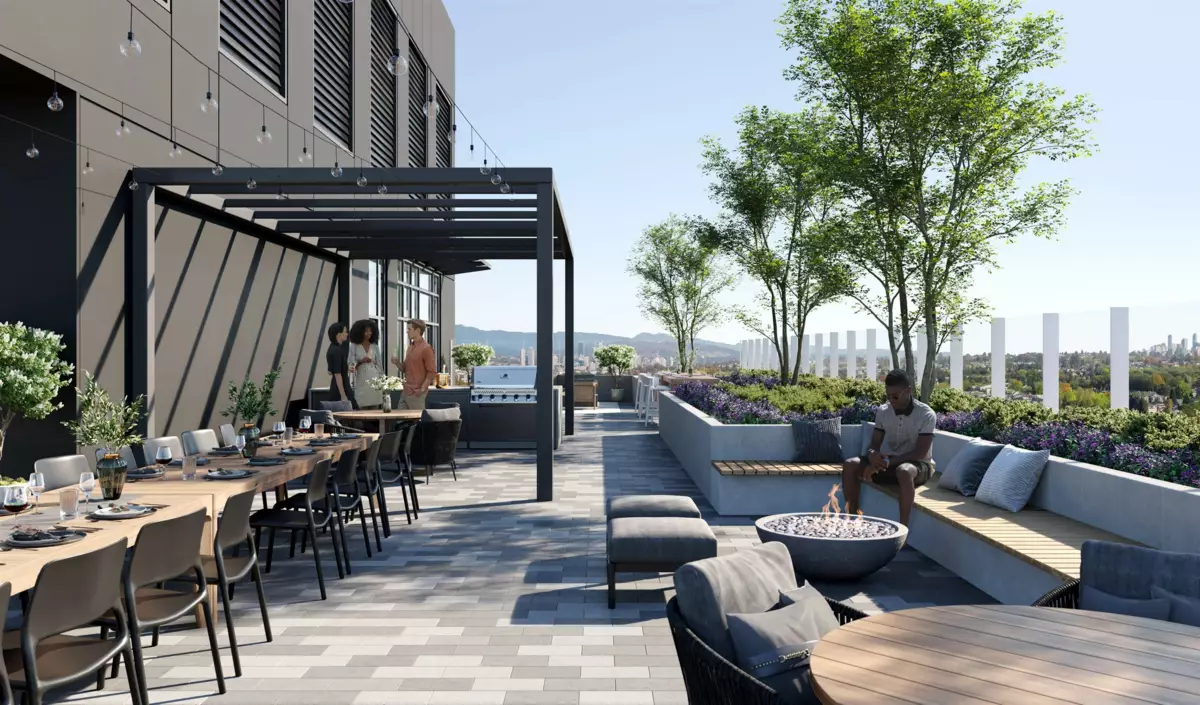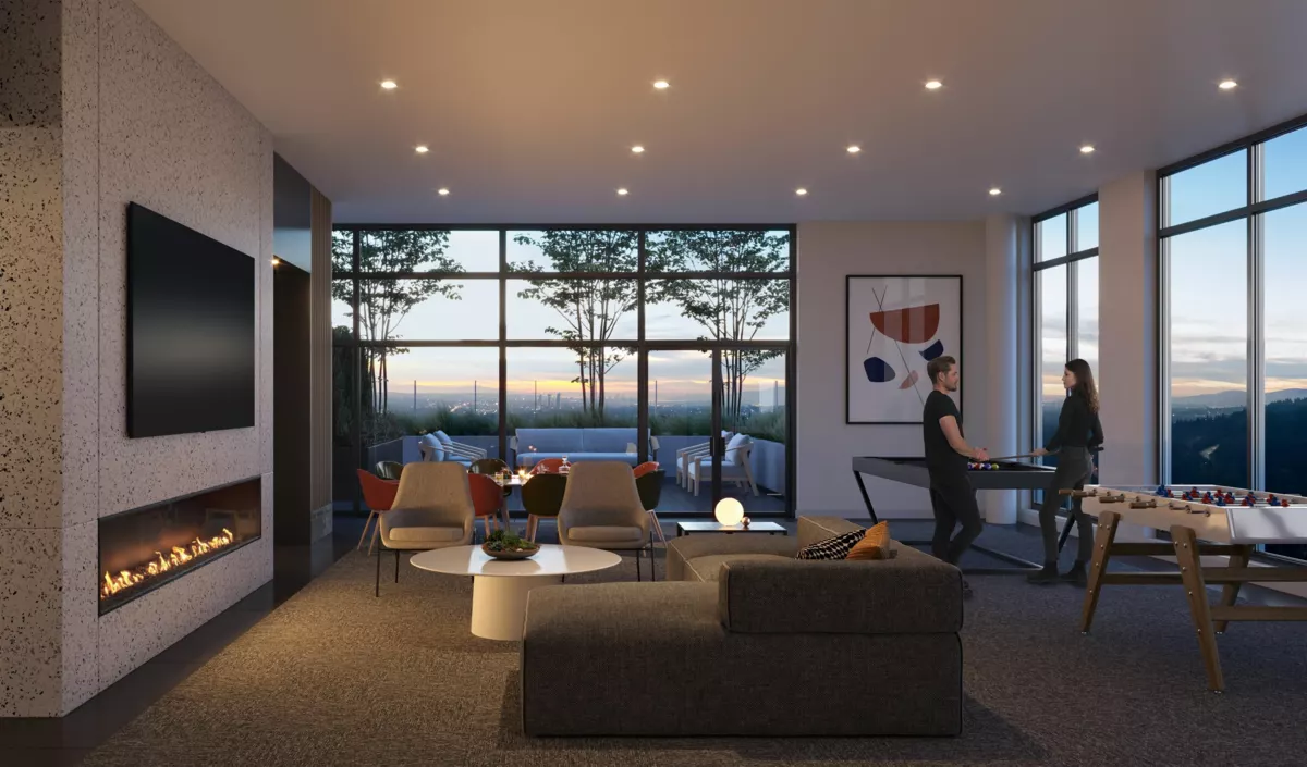 Band by Townline - a 45-storey tower in vibrant West Coquitlam with bold architecture & resort inspired amenities. With a spectacular Downtown & Mountain view, this 582sf l+den home features a thoughtful layout with no wasted space, expansive dual glazed windows, spacious balcony, large kitchen with expansive storage, 24 11 integrated Fulgor fridge & dishwasher, Bosch gas cooktop & electric wall-mounted oven, quartz countertops & designer porcelain backsplash. AC/Heating/Gas included. Over 27,000sf of amenities including an outdoor pool with cabanas, fully equipped gym, spa, dog run & bath, garden plots, music room, spa/sauna, co-work space, concierge, 2 guest suites, as well as penthouse level views & amenities which include games lounge, chef's kitchen & curated outdoor entertaining spac