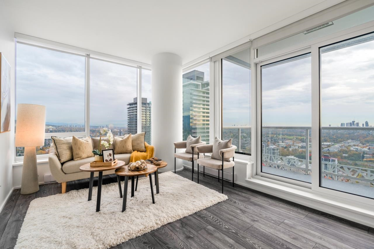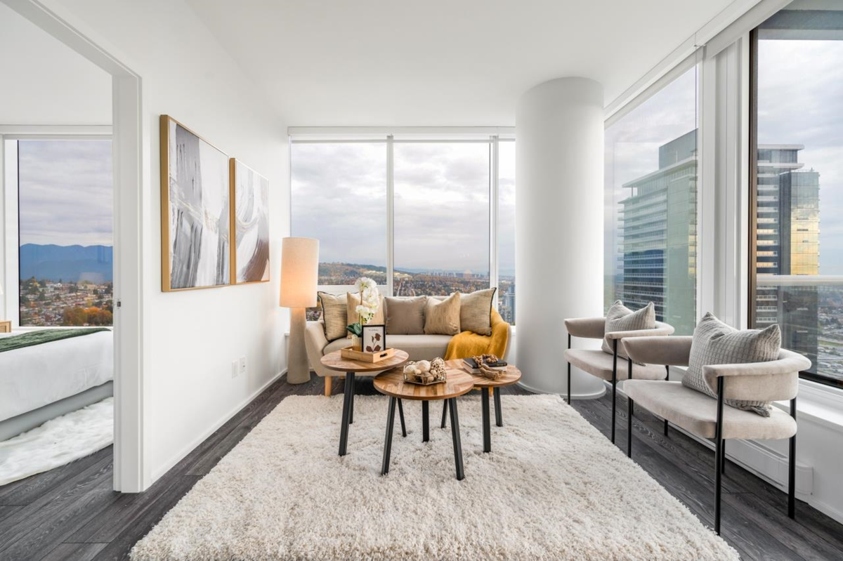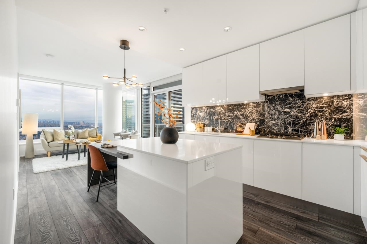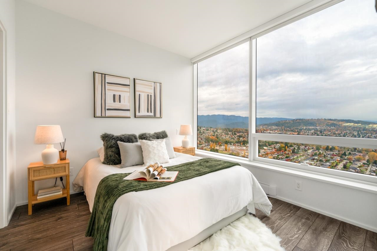 IMMACULATE CONDITION - SHOWS JUST LIKE NEW! Bright SE CORNER 2BED 2 FULL ENSUITE BATH + DEN home with breathtaking city & mountain views from every room. Modern kitchen with plenty of cabinets, quality integrated appliances, gas cooktop & large island with built-in dining and office nook. Flooded with natural light plus over 160 sqft covered balcony. Includes 1 parking & 1 storage. Resort-style amenities: 2 guest suites, business center, games room, private kitchen, huge gym, outdoor terrace & concierge. Direct access to mall, SkyTrain, Cineplex & dining—no need to step outside! Fantastic value & prime Brentwood location.