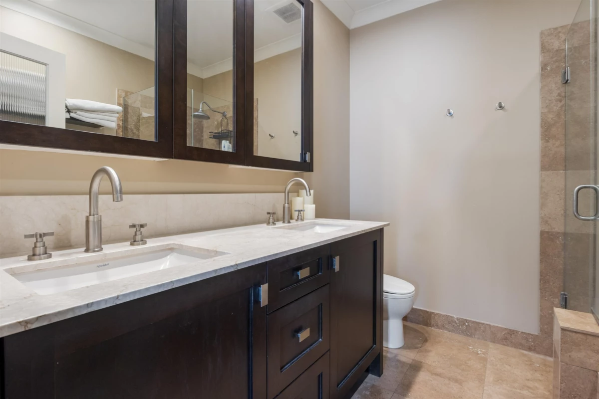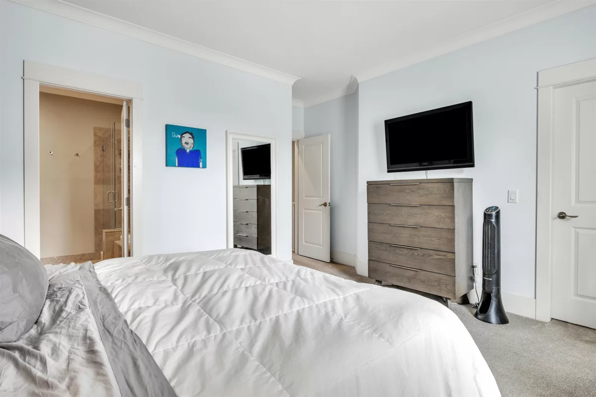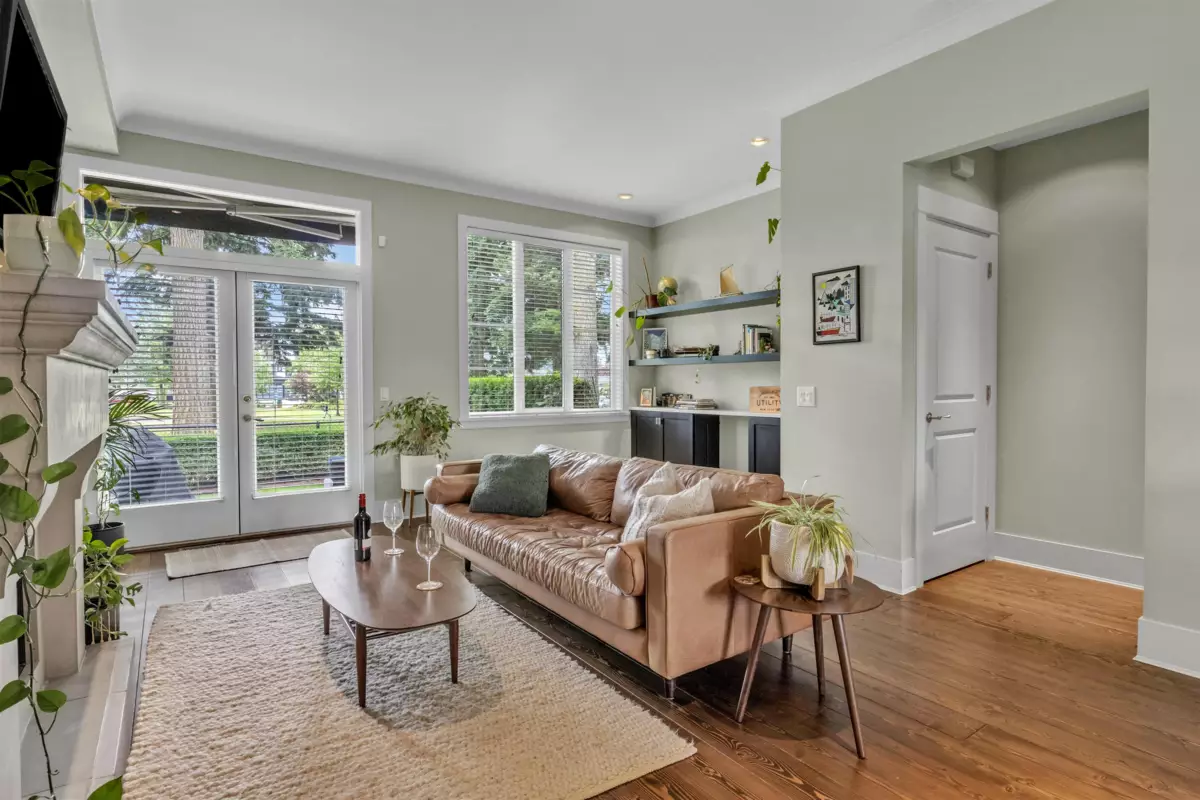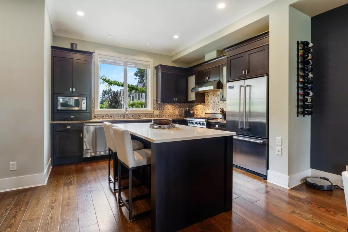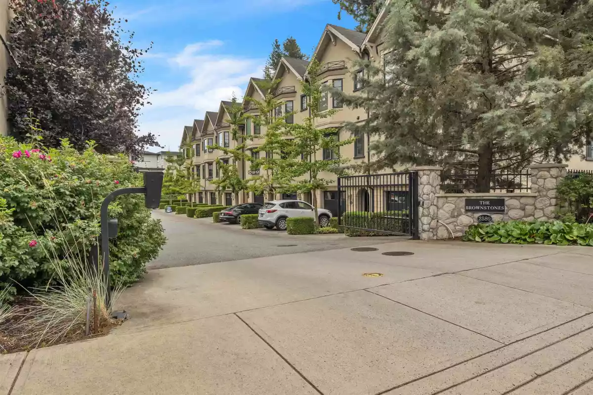 "BROWNSTONE" A LUXURY townhouse that rarely comes available for sale. Quality-built home. This home backs onto a beautiful park! MAIN FLOOR: 10'ceilings, hardwood floors, large dream kitchen, with island, eating bar, granite & quartz counters, gas stove. Large dining area, Living room with gas F.P., dry bar area & opens to the ground-level backyard. You'll love the outside living area, great view. UPPER FLOOR; 9' ceilings, 3 bedrooms, Primary BedRm is huge, W/I closet & 5 pc ensuite with heated floors. LOWER LEVEL: Large flex room great for Media, office, fitness or 4th bedroom. Central A/C, gas fireplace, B/I vacuum, security, 40-year roof, and guest parking. Meticulously maintained gated complex. Walking distance to grocery stores, malls, recreation, and only minutes to all the amenities