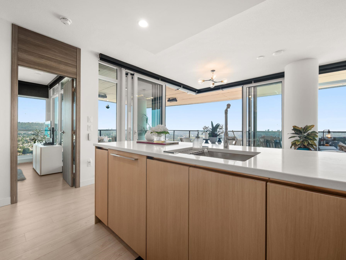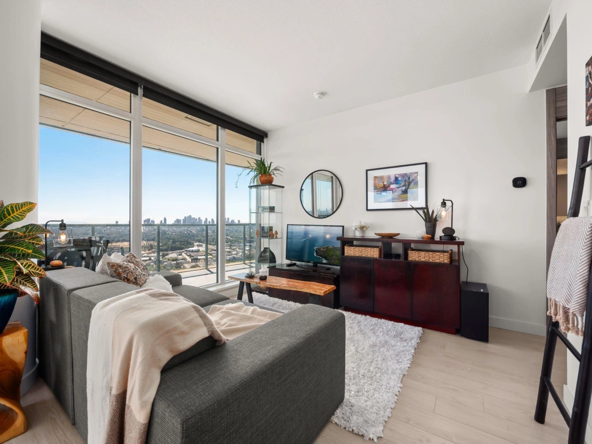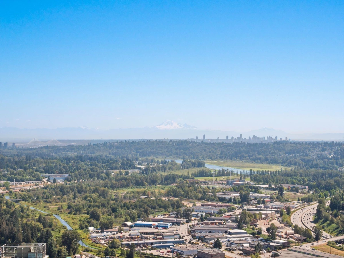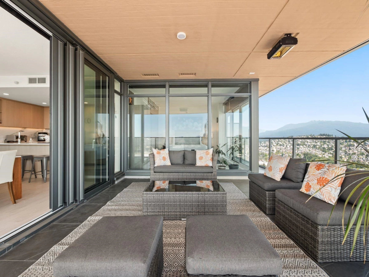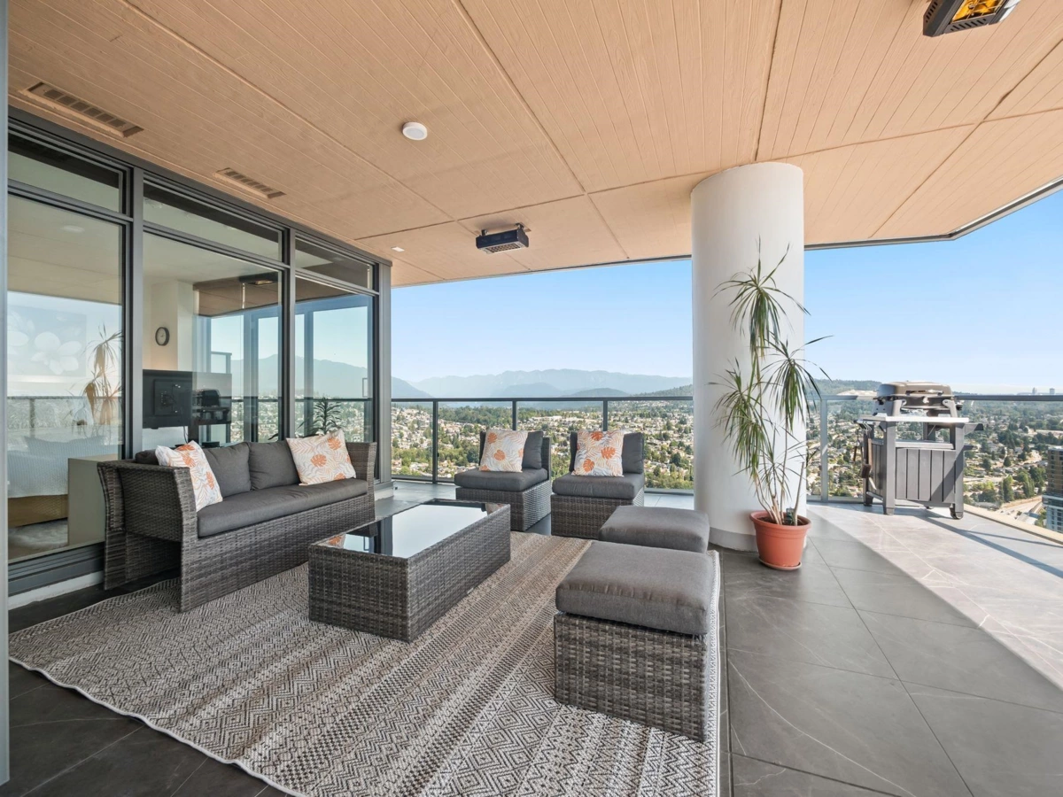 Sub-penthouse, corner suite at Concord Brentwood Hillside East with stunning, unobstructed 270° views—from the mountains and Indian Arm, to Mt. Baker, Metrotown, and the Gulf Islands. This south-facing 2 bedroom, 2 bathroom home offers 1,059 sqft of modern living and an incredible 638 sqft of heated outdoor space. Expansive sliding doors fully open to create a seamless flow between indoors and out—perfect for entertaining or relaxing with your morning coffee or evening glass of wine. Sophisticated design, quality finishings, air conditioning, and a bright open layout. Exceptional amenities, 24/7 concierge, and just steps to Brentwood Mall and Skytrain. One parking and storage locker included. Open: Sun, Nov 2, 2-4