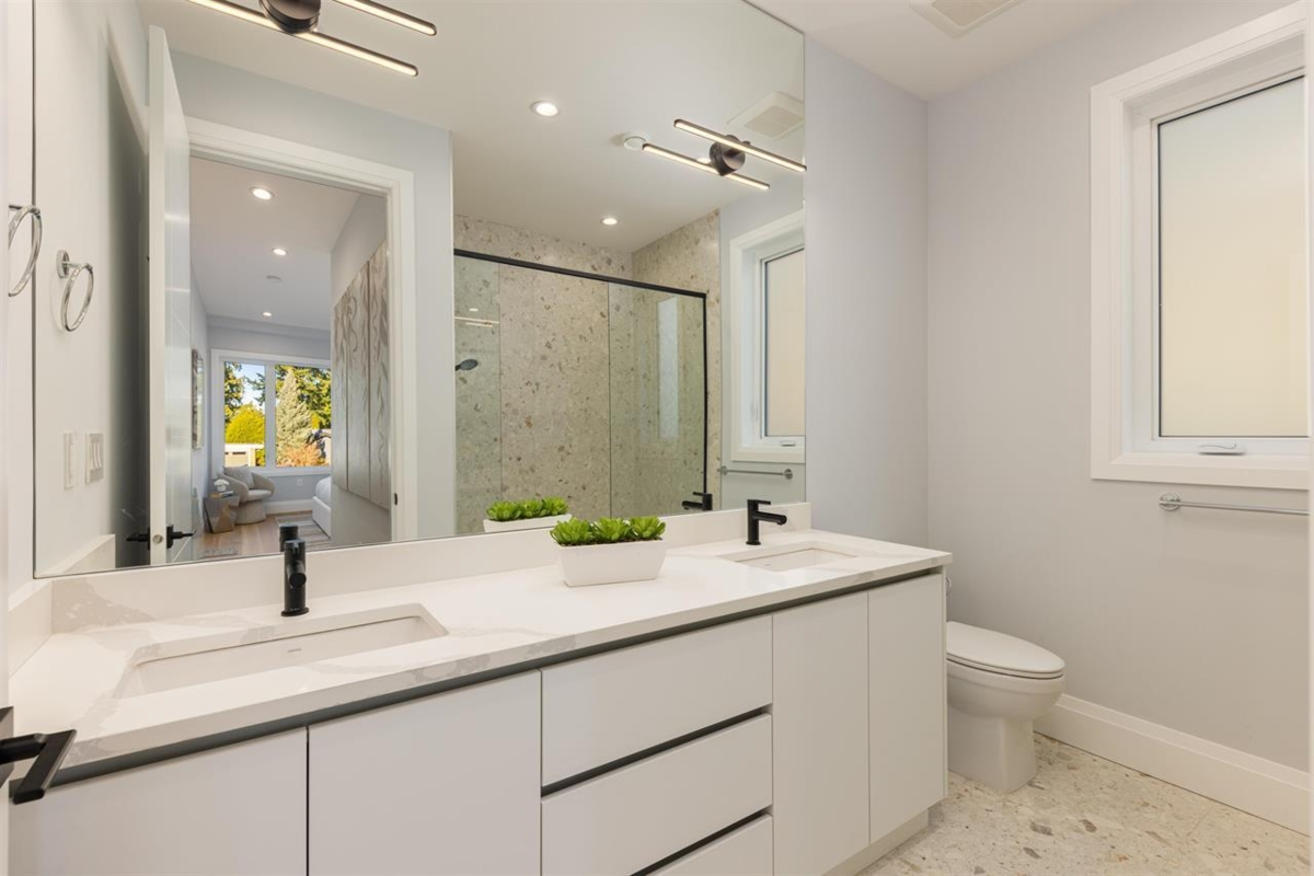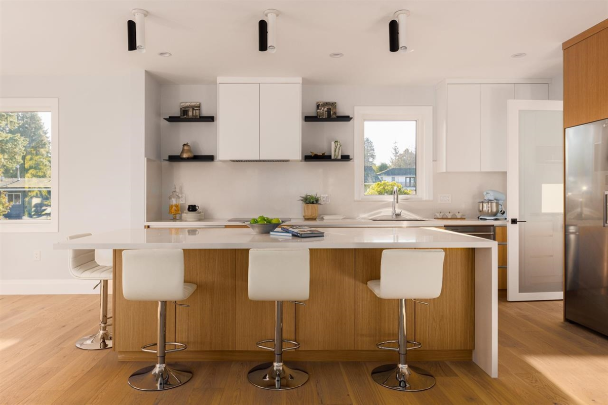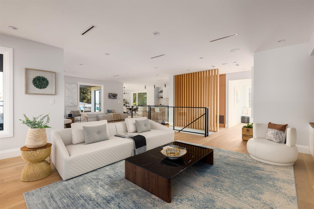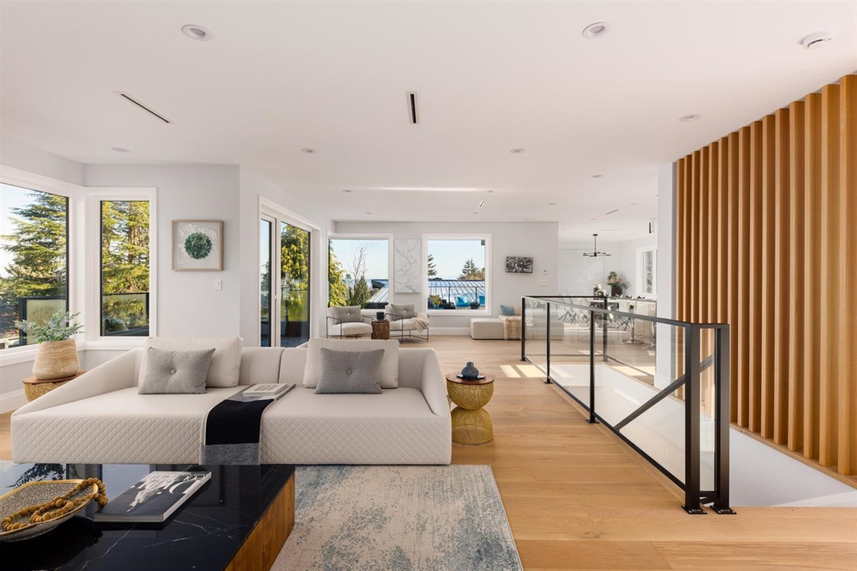 Enjoy stunning mountain and water views from this brand-new contemporary home in prestigious Pebble Hill. Positioned on side of a quiet st, it offers 5,100+ sq.ft. of luxury living on a 7,218 sq.ft. lot. Step into grand foyer with soaring ceilings, open-concept living, and hardwood flrs throughout. The gourmet ktchn features high-end appliances, custom cabinetry, & large granite island, plus wok kitchen for added convenience. With 7 bedrms + open den, including serene primary suite with spa-style ensuite, there's room for the whole family. The legal 2-bedrm suite with separate entrance, kitchen, bath, and laundry is perfect as mortgage helper or for extended family. Features incld radiant in-floor heating, A/C, HRV, and media rm. Close to top schools, prks, beaches & shopping.