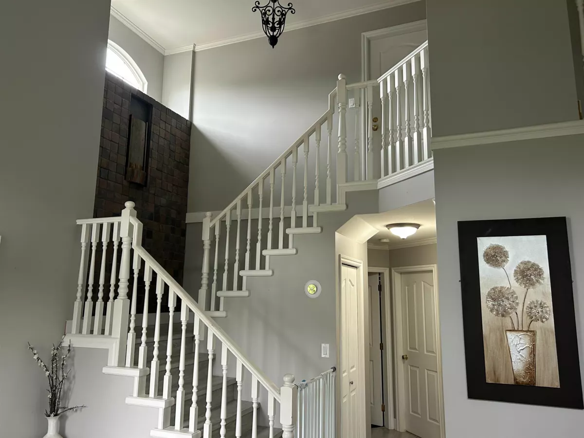 This spacious 2-storey corner-lot family home is nestled in a quiet, sought-after neighborhood—just steps from elementary school, parks, and scenic hiking trails. Enjoy the convenience of being within walking distance to a shopping plaza, close to all amenities, easy freeway access. This home features a bright and generous kitchen with ample cabinetry and an eating area that opens into a cozy family room & gas fireplace, 3 beds and 2.5 baths. You'll love the formal dining room and the great room's soaring ceilings, which let in plenty of natural light. A unique stone feature wall with a built-in water fountain leads you upstairs to the spacious primary bedroom with ensuite, plus two additional bedrooms and a main bath. The main floor also includes a powder room, laundry & crown moulding.